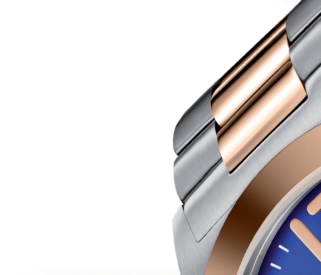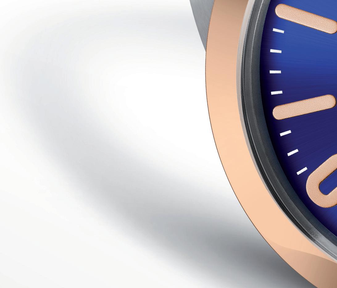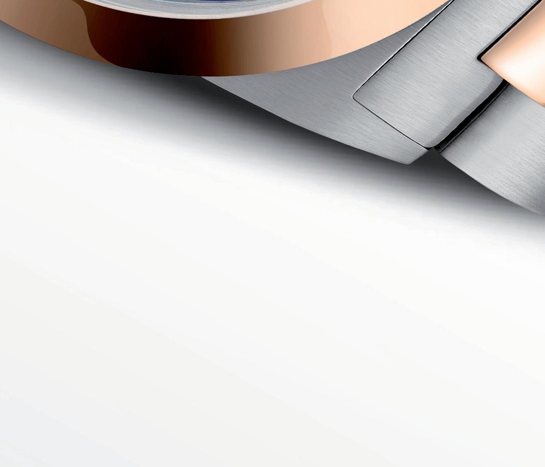 Our new Canteen Bracelet collection steps up in a clean, fresh style. This model features a 2-tone brushed steel case with PVD rose gold plating and a sunray blue dial.