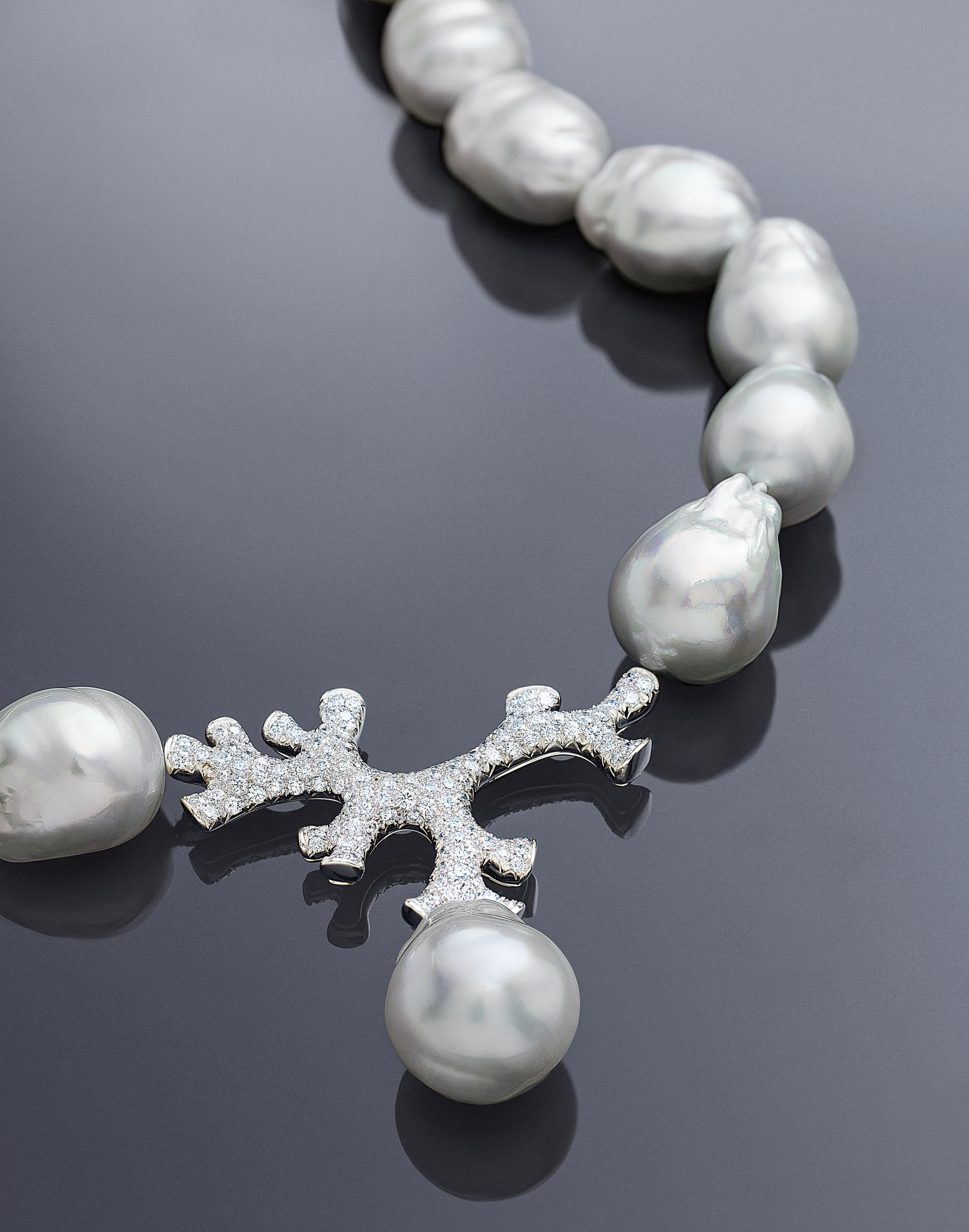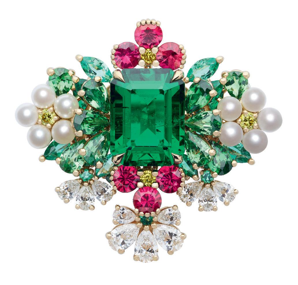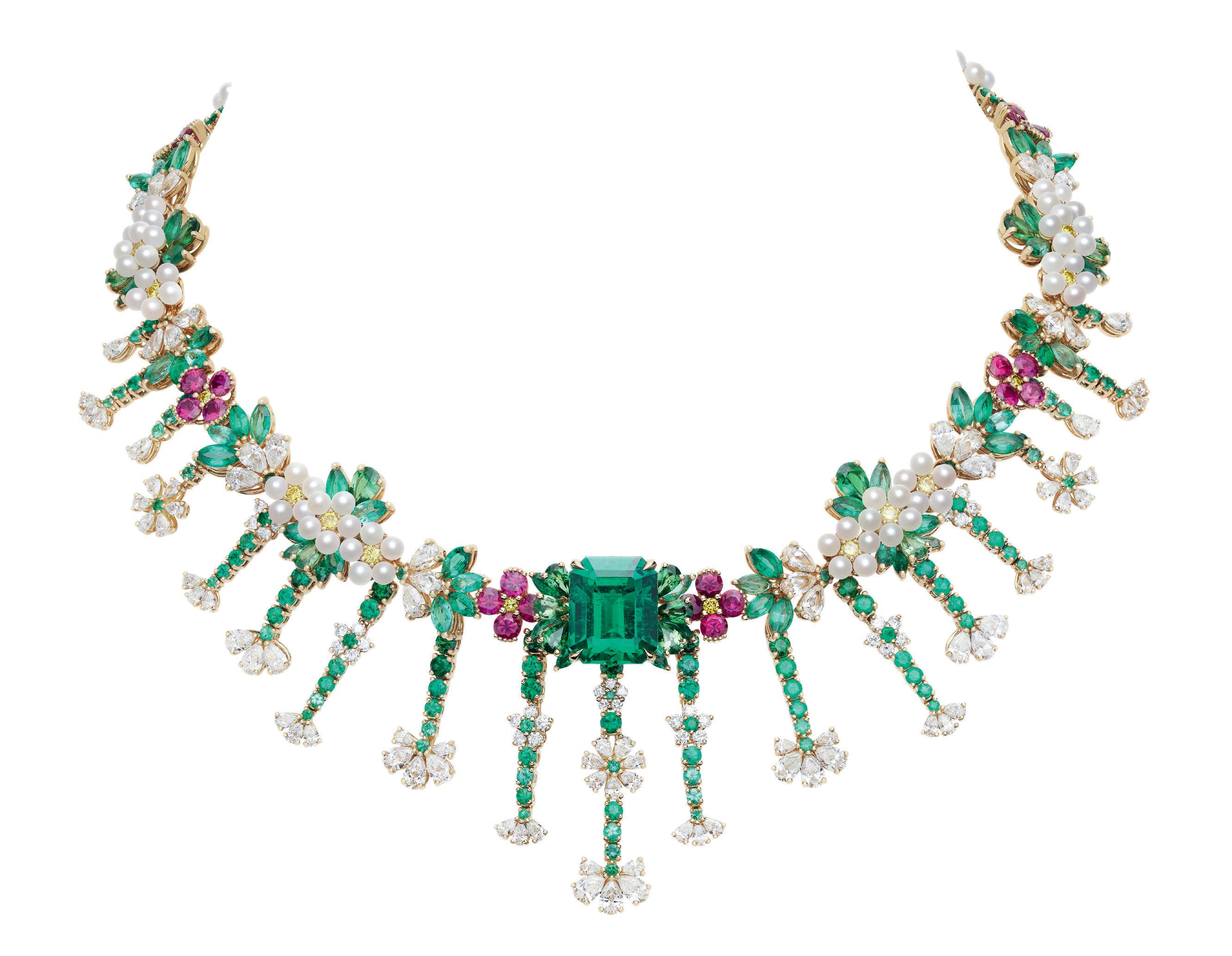Necklace in 18k gold with yellow diamonds, emeralds, tsavorite garnets, white cultured pearls and pink sapphires, price upon request, DIOR HIGH JEWELRY, dior.com