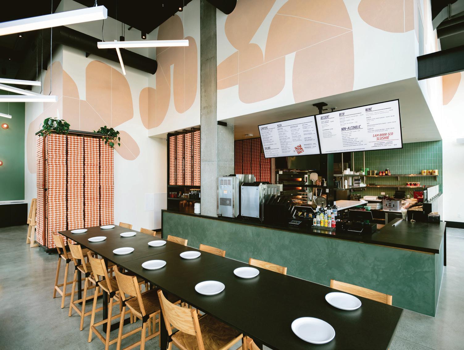 For the second standalone location of Flour + Water Pizza Shop, led by co-founders and chefs Thomas McNaughton and Ryan Pollnow of Flour + Water Hospitality Group, careful deliberation went into finding the spot in Oakland. “We were very intentional about waiting for the right location and immediately felt drawn to The Lark Uptown because of the strong sense of community in the area,” says McNaughton. “With so many of our longtime team members and collaborators based in the East Bay, it’s immensely gratifying to finally be serving this neighborhood that is home for so many of our colleagues and friends.” The space is lined with recycled brick tile from Fireclay Tile, an abstract dough mural by San Francisco–based artist Nicole Hayden and two pizza box wall displays in racks fabricated by local firm Reunion Creative. The kitchen serves up a dozen 13-inch pies, such as The Conrad with taleggio, mushrooms and kale (one of McNaughton’s personal favorites) along with location-specific offerings like dry-fried chicken wings served with a special green dipping sauce. “It’s not just about serving great pizza,” says McNaughton. “Pizza is our conduit for connection and service to others. The space was designed with that in mind, so when guests walk in, they immediately feel part of that energy. Pizza is such a social food, and we love how it brings people together. Even when someone is popping in solo for a big slice at the counter, they can feel connected with our team and everyone in the restaurant.” fwpizzashop.com