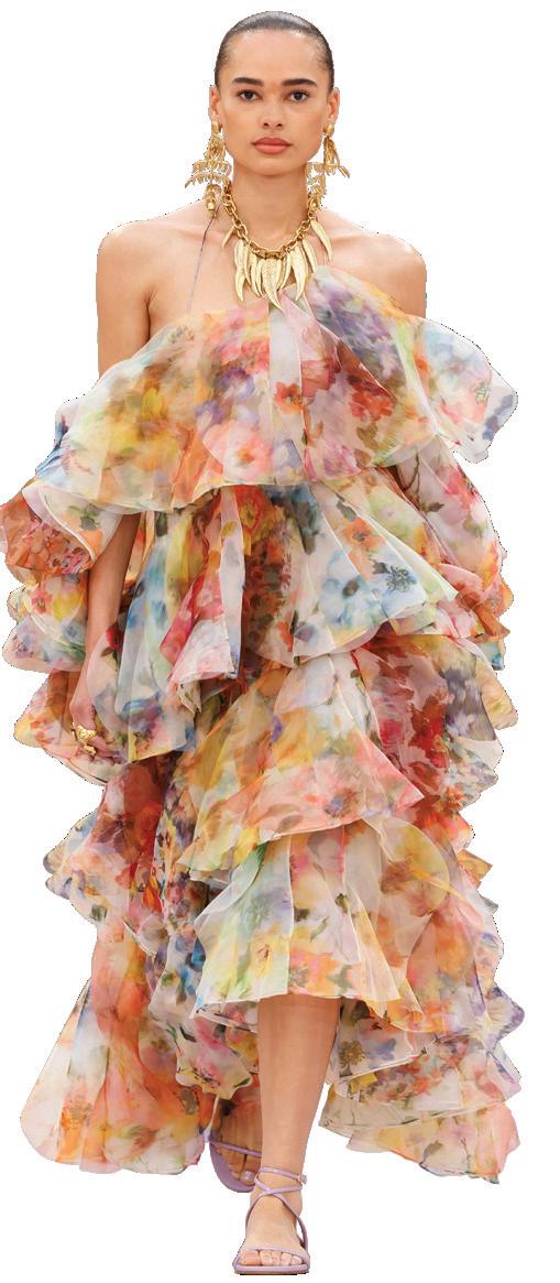 For Dior’s latest Haute Joaillerie collection, the maison’s jewelry artistic director, Victoire de Castellane, dreamt up Belle Dior, a celebration of femininity, the beauty of gardens and the magic of couture, combining dream and reality with elegant fringing. With 57 pieces, Belle Dior evokes fantastical landscapes imbued with poetry. Braids, emblematic of de Castellane’s jewellery, are boldly reinterpreted; in a romantic spirit, they are turned into precious pendants that sway gracefully and initiate delightful vertical movements, recalling by turns the dance of celestial bodies, the fabrics of Christian Dior’s ballgowns or the motion of a flowering stem. These elements trace the contours of a weightless flora where gold, diamonds and gemstones are united to bring a marvelous symphony to life. A refined tale celebrating majestic blooms, reimagined with a profusion of colored gems. At the heart of this magical odyssey, the Jardins Multicolores are reborn in unprecedented shades of bright green and powder pink. This Franges de Fleurs necklace features fringes that evoke delicate foliage, complemented by fresh and delicate gem-set flowers. Stems, flowers and leaves cascade around the central emerald on the necklace, ring and earrings, echoing Dior’s floral haute couture creations, in which nature delicately embraces the body of the wearer.