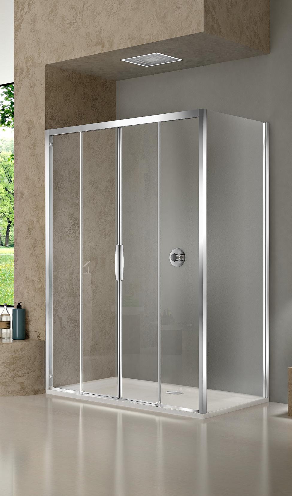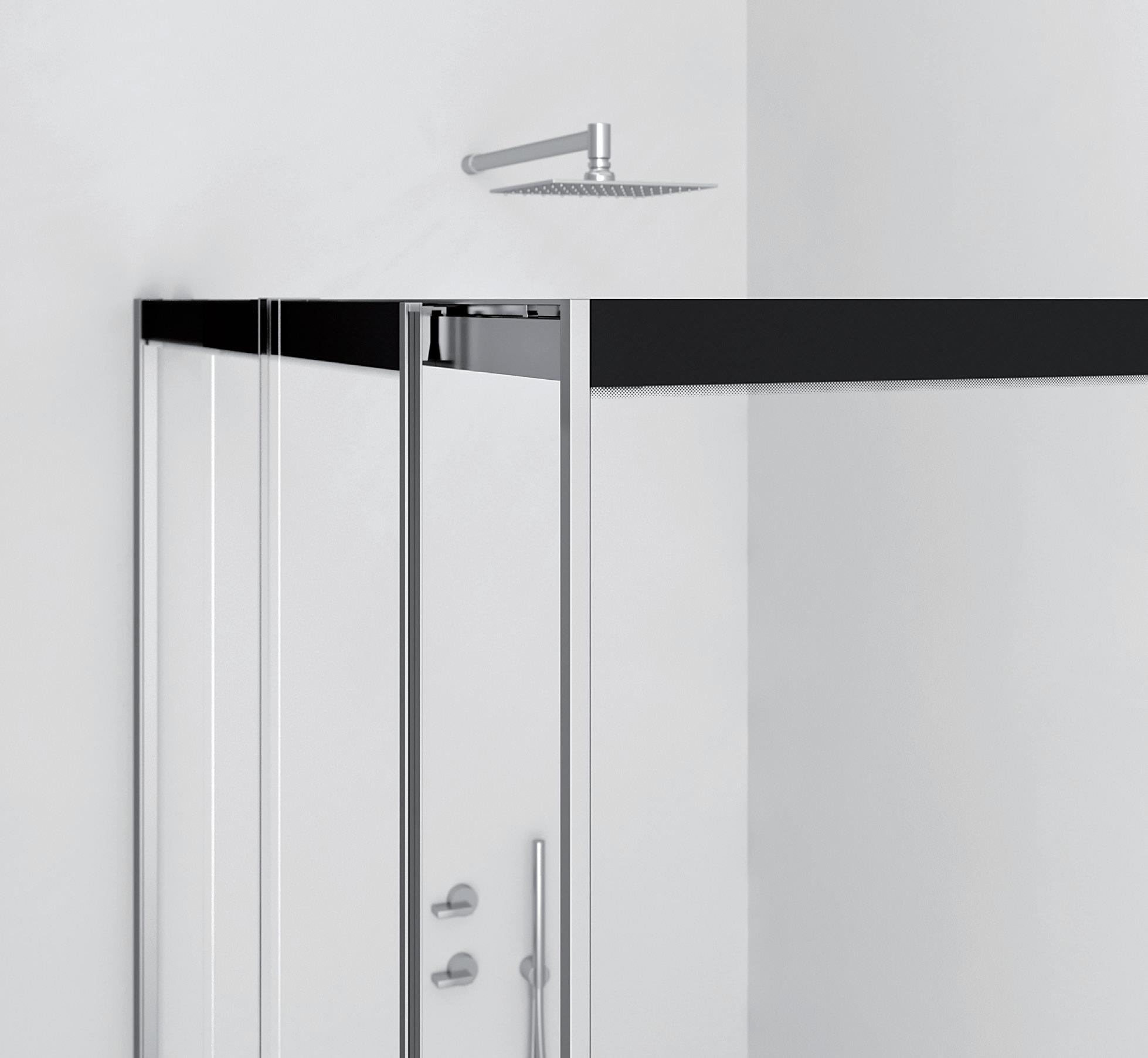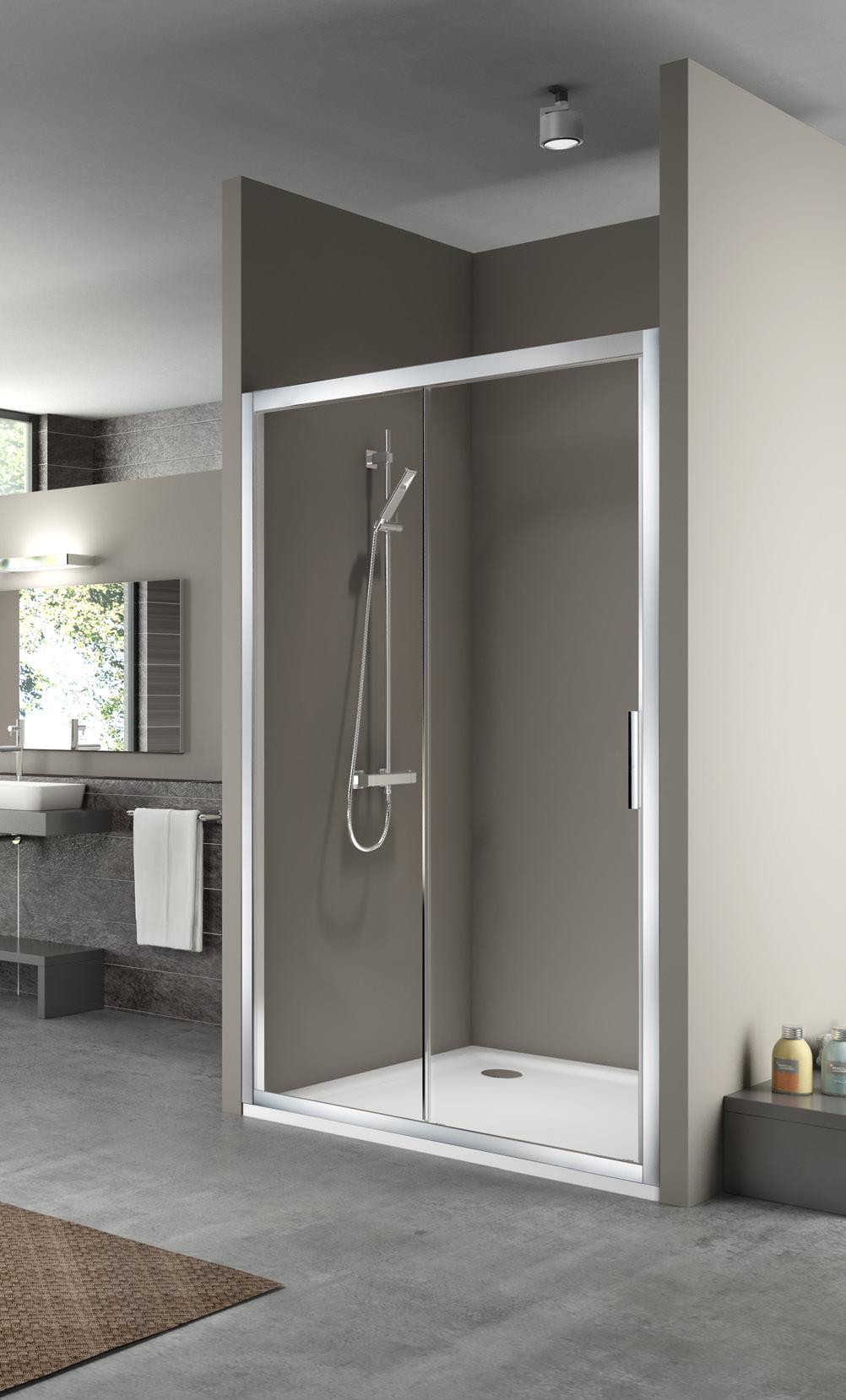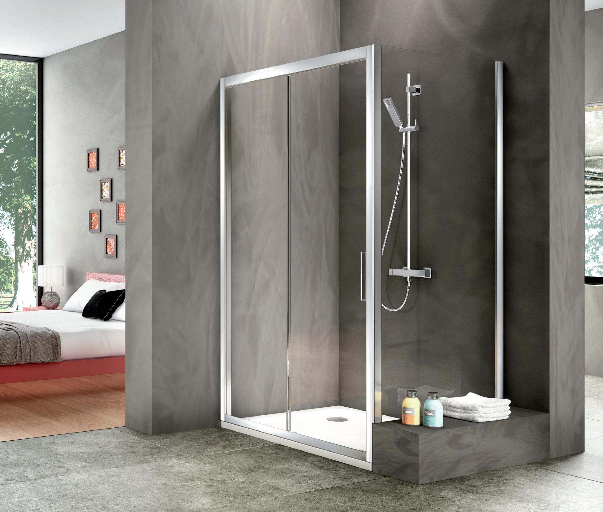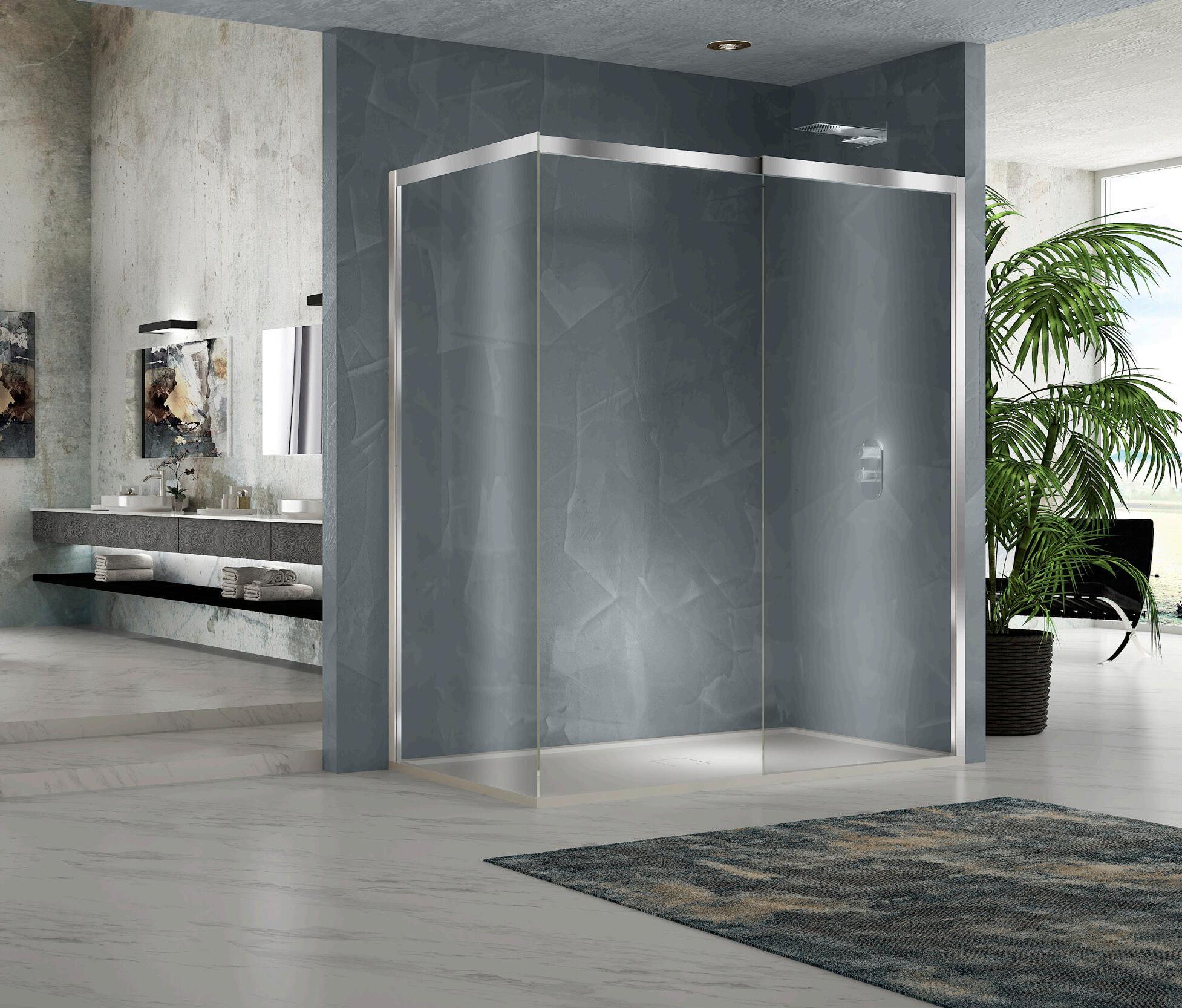 La regolazione a parete di 25 mm degli elementi fissi e laterali avviene grazie alla regolazione lineare del vetro temperato nel “profilo a muro”.