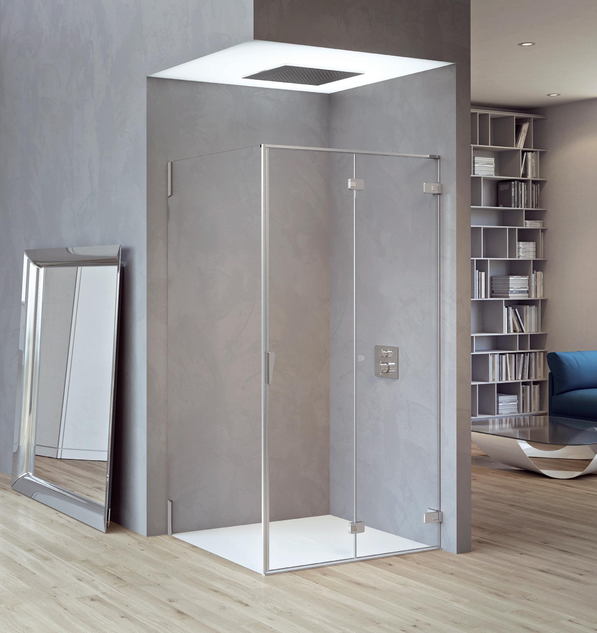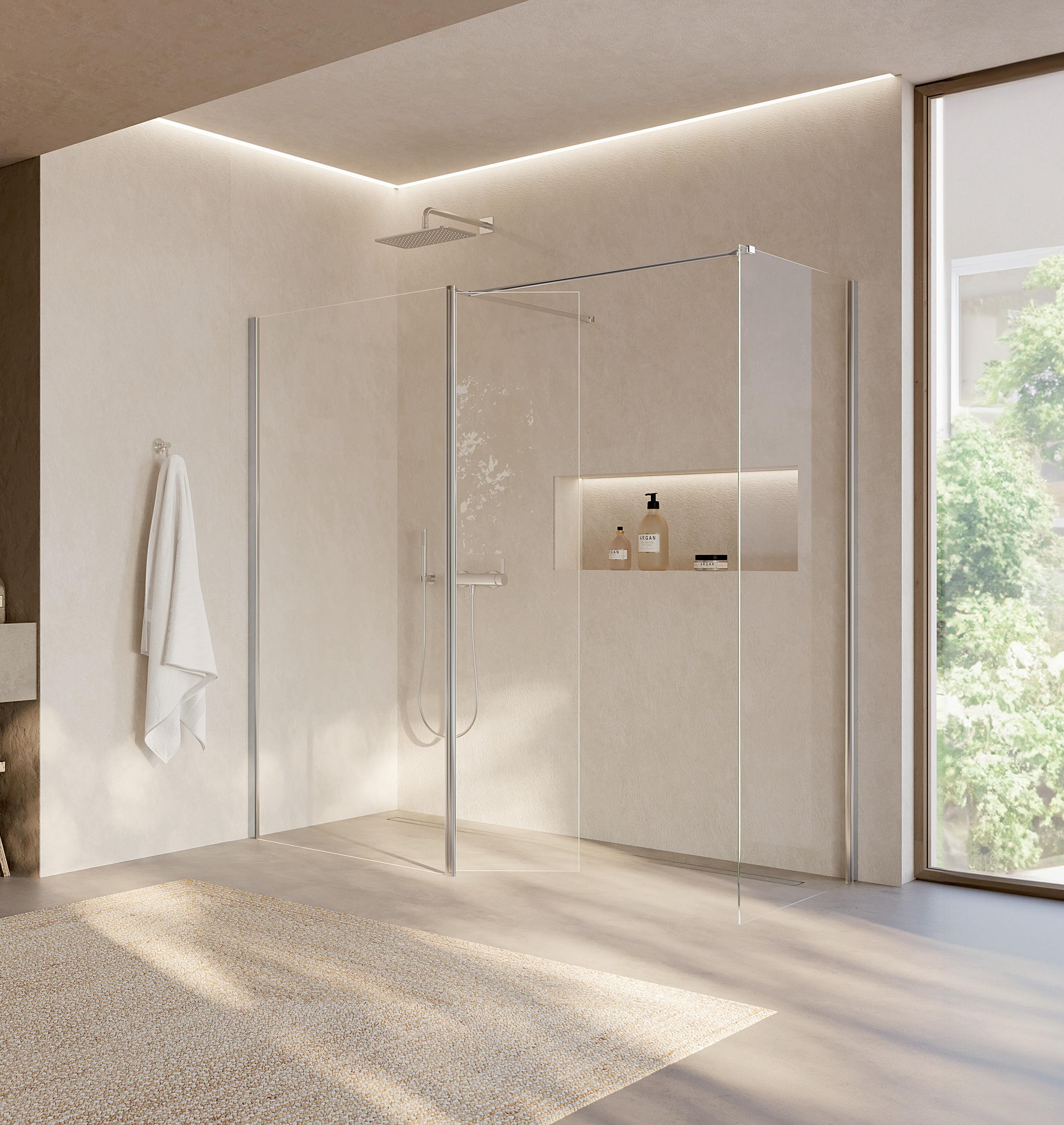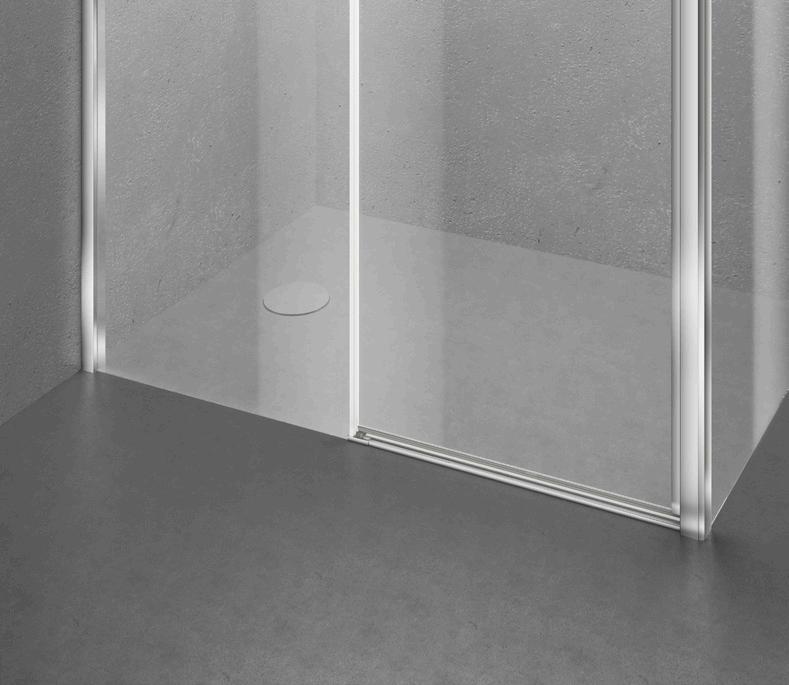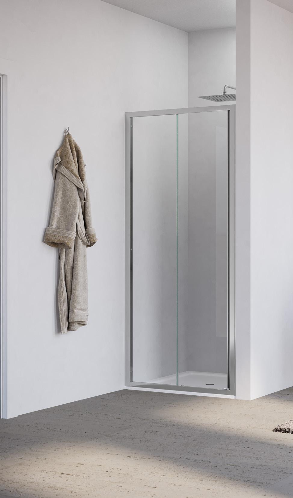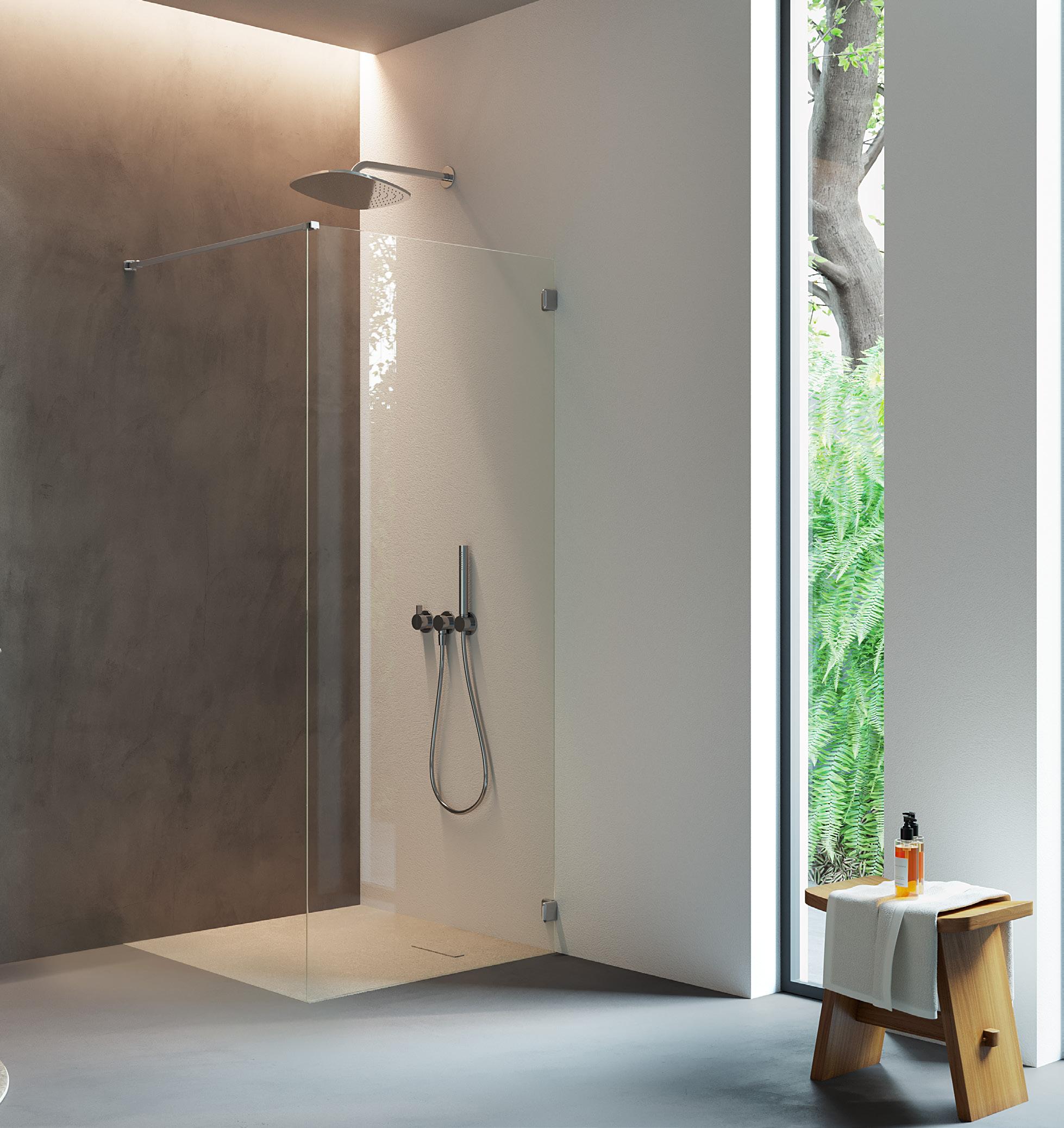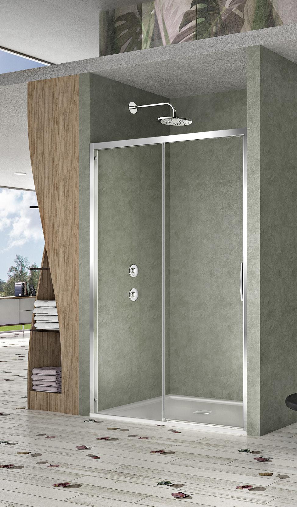 La regolazione a parete di 25 mm degli elementi fissi e laterali avviene grazie alla regolazione lineare del vetro temperato nel “profilo a muro”.