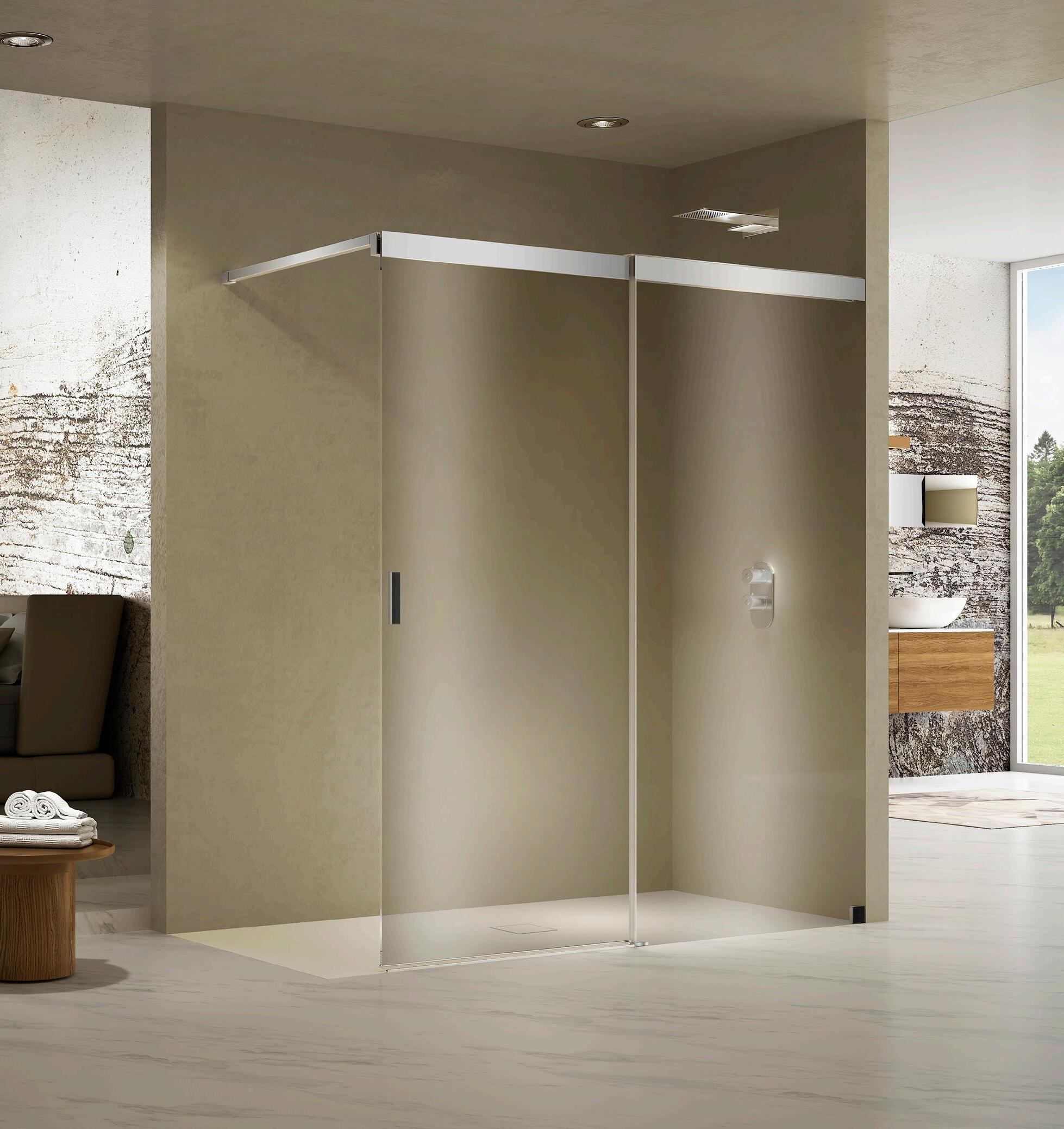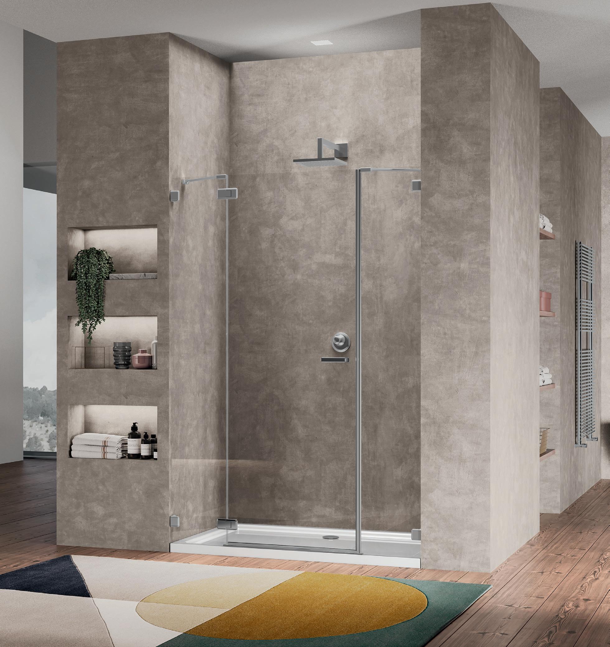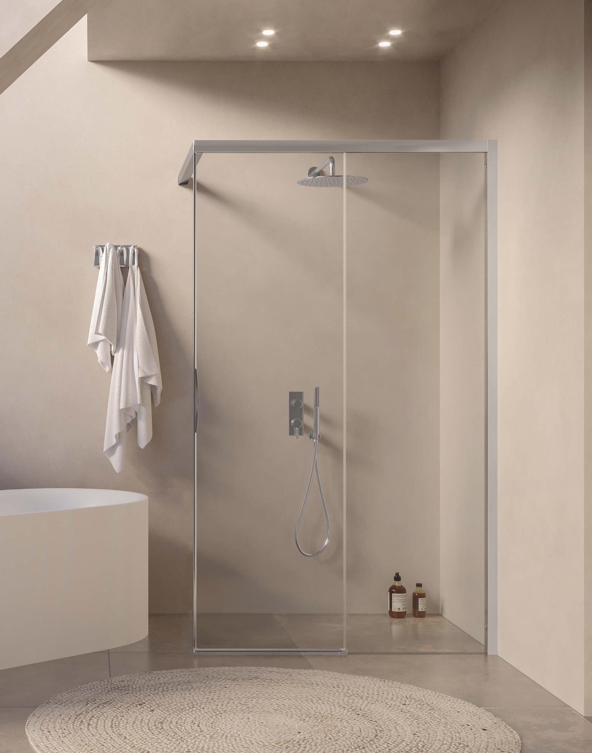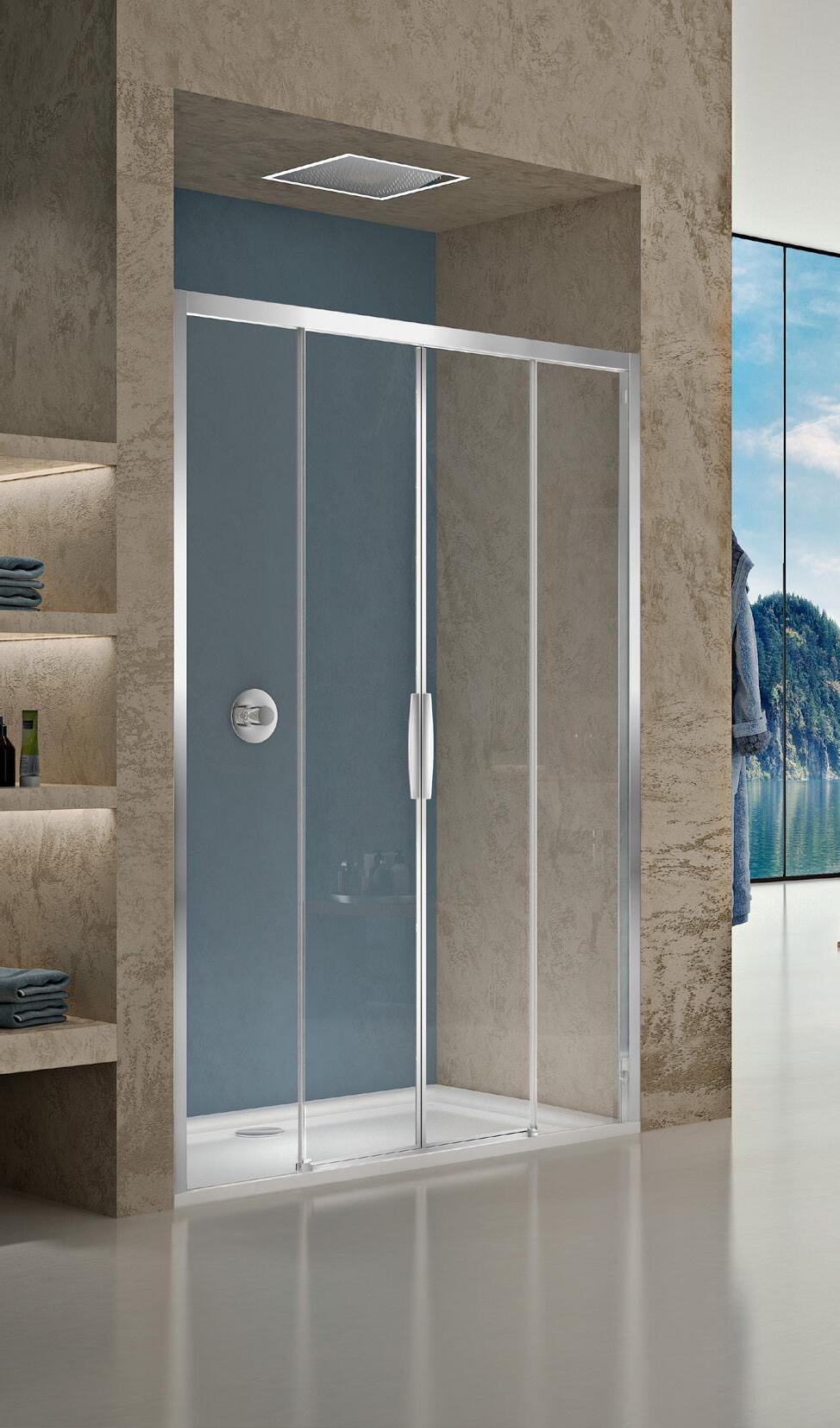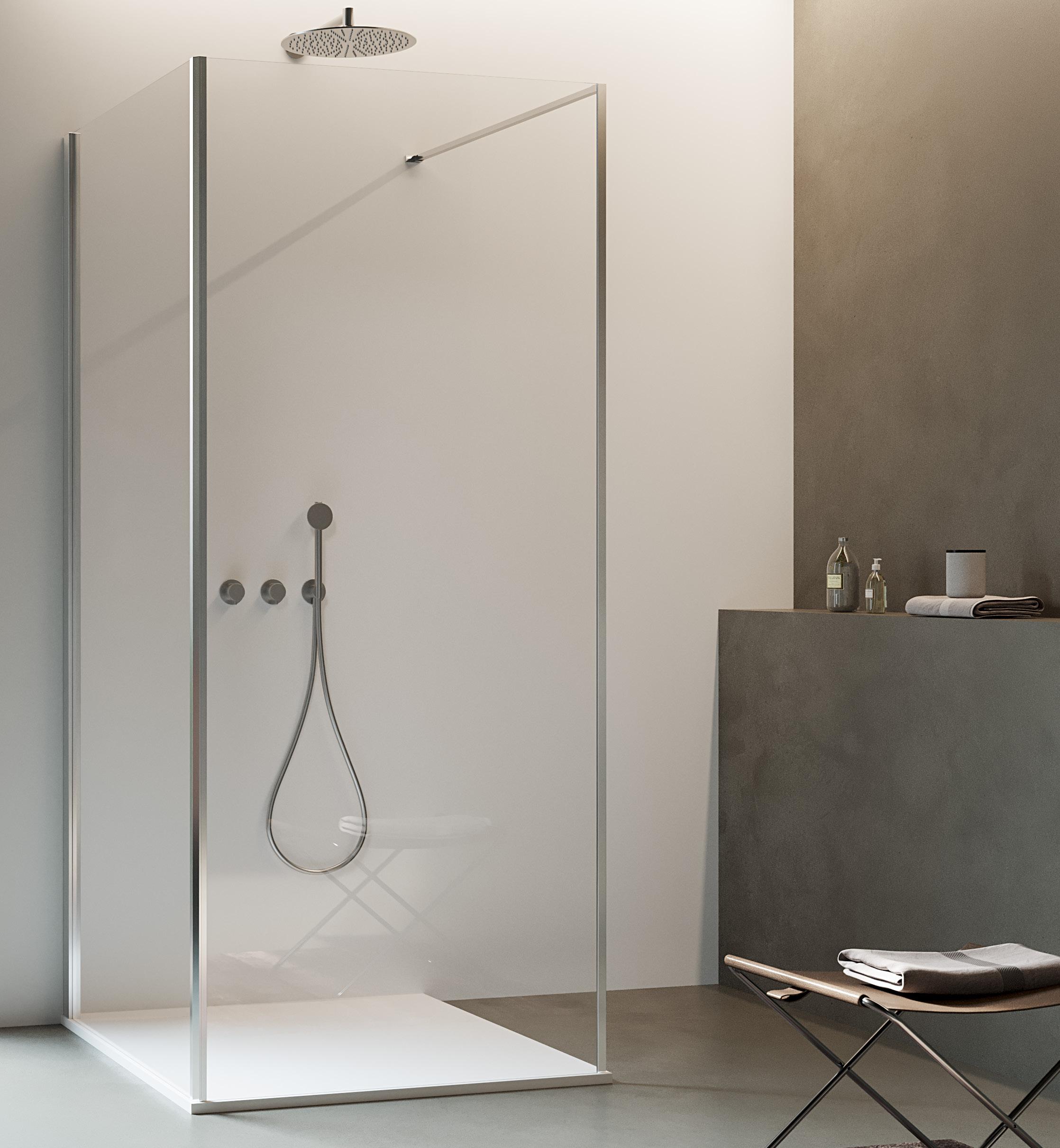 La regolazione a parete di 25 mm degli elementi fissi e laterali avviene grazie alla regolazione lineare del vetro temperato nel “profilo a muro”.