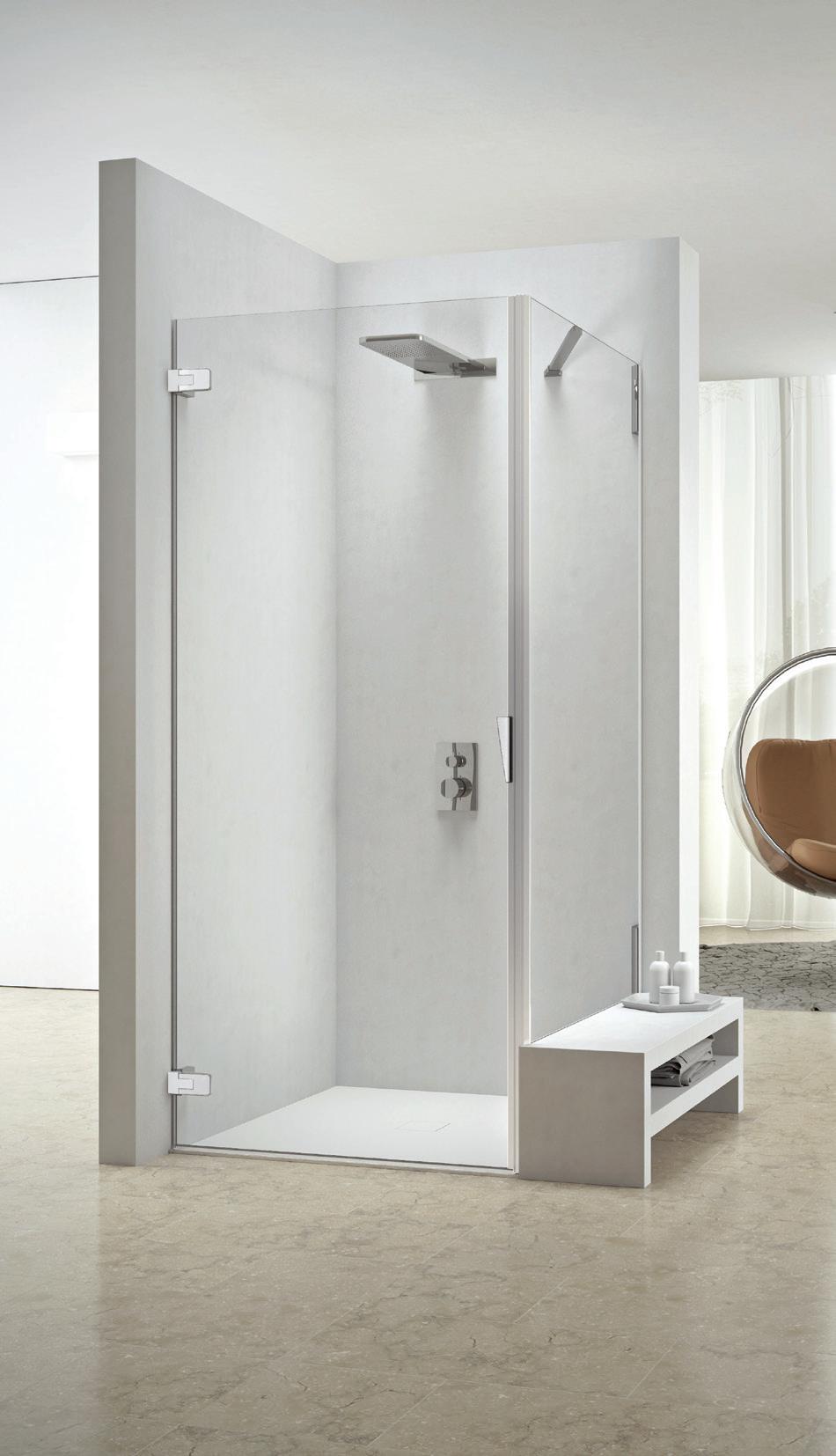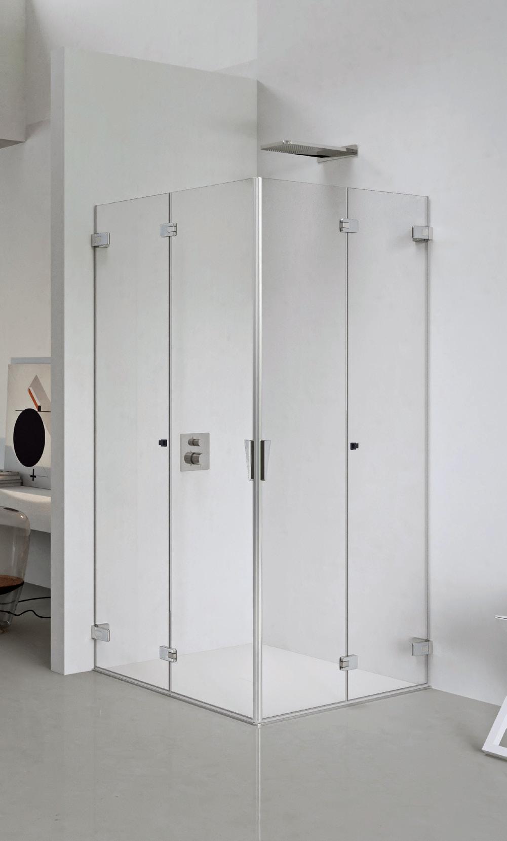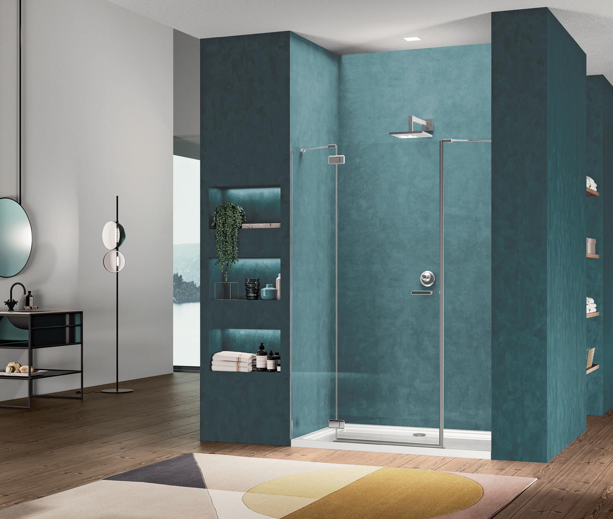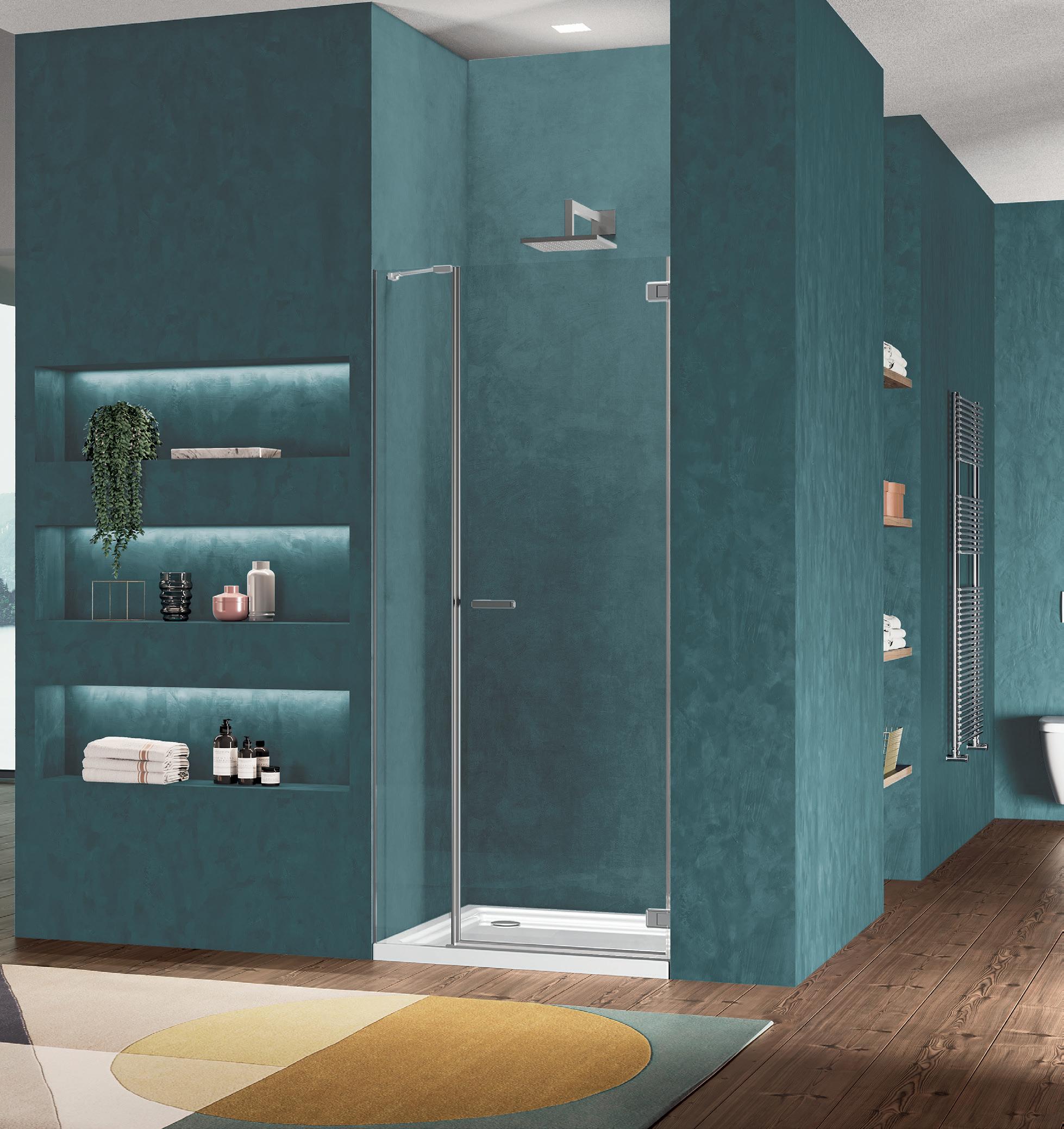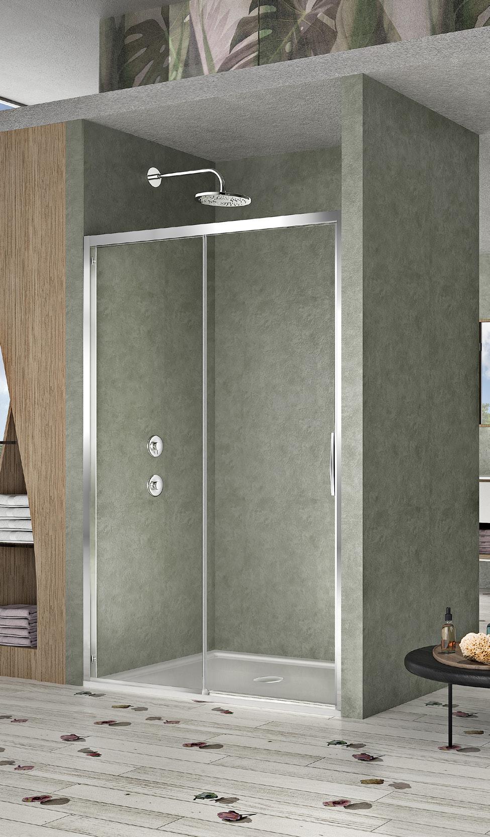 La regolazione a parete di 25 mm degli elementi fissi e laterali avviene grazie alla regolazione lineare del vetro temperato nel “profilo a muro”.