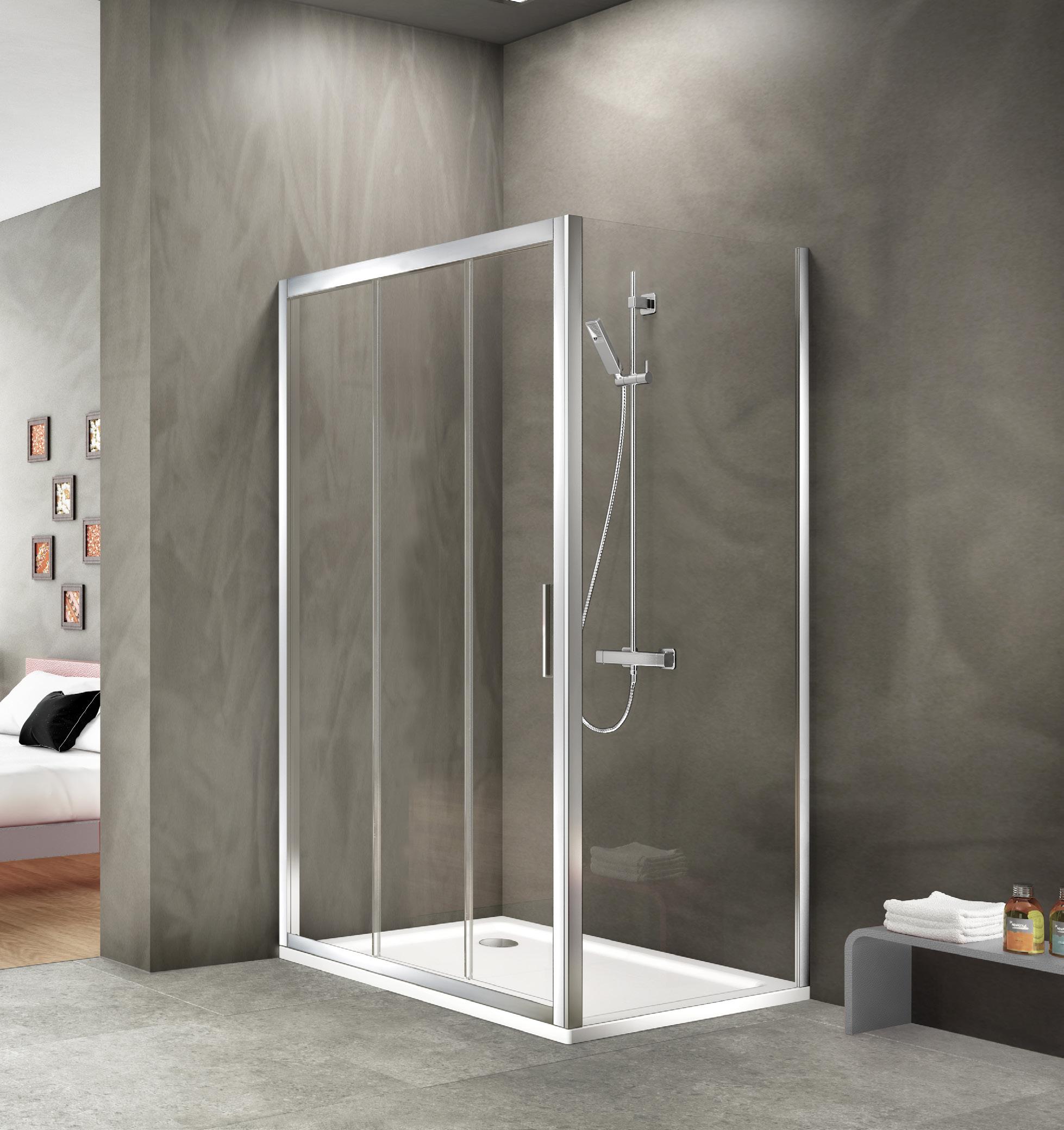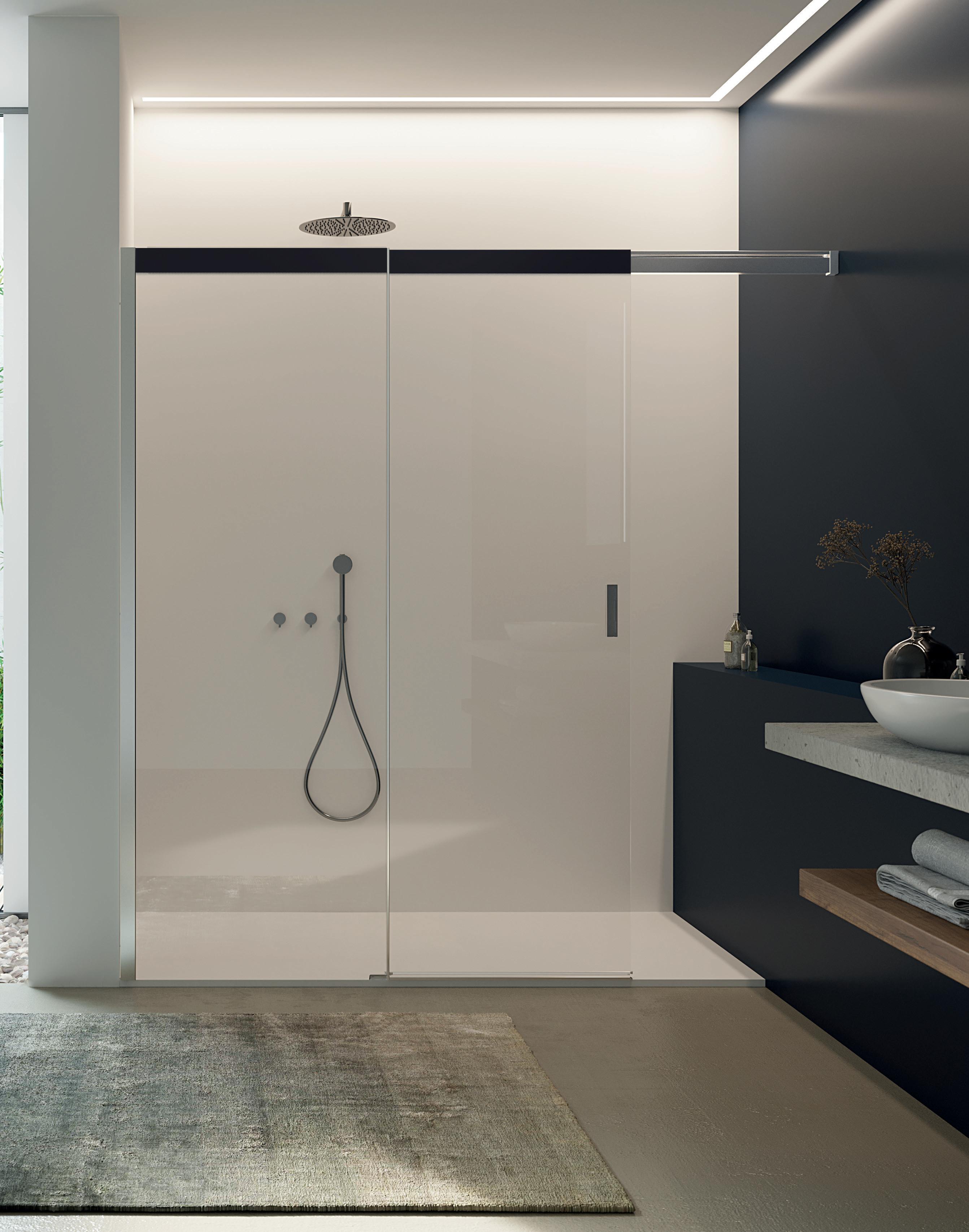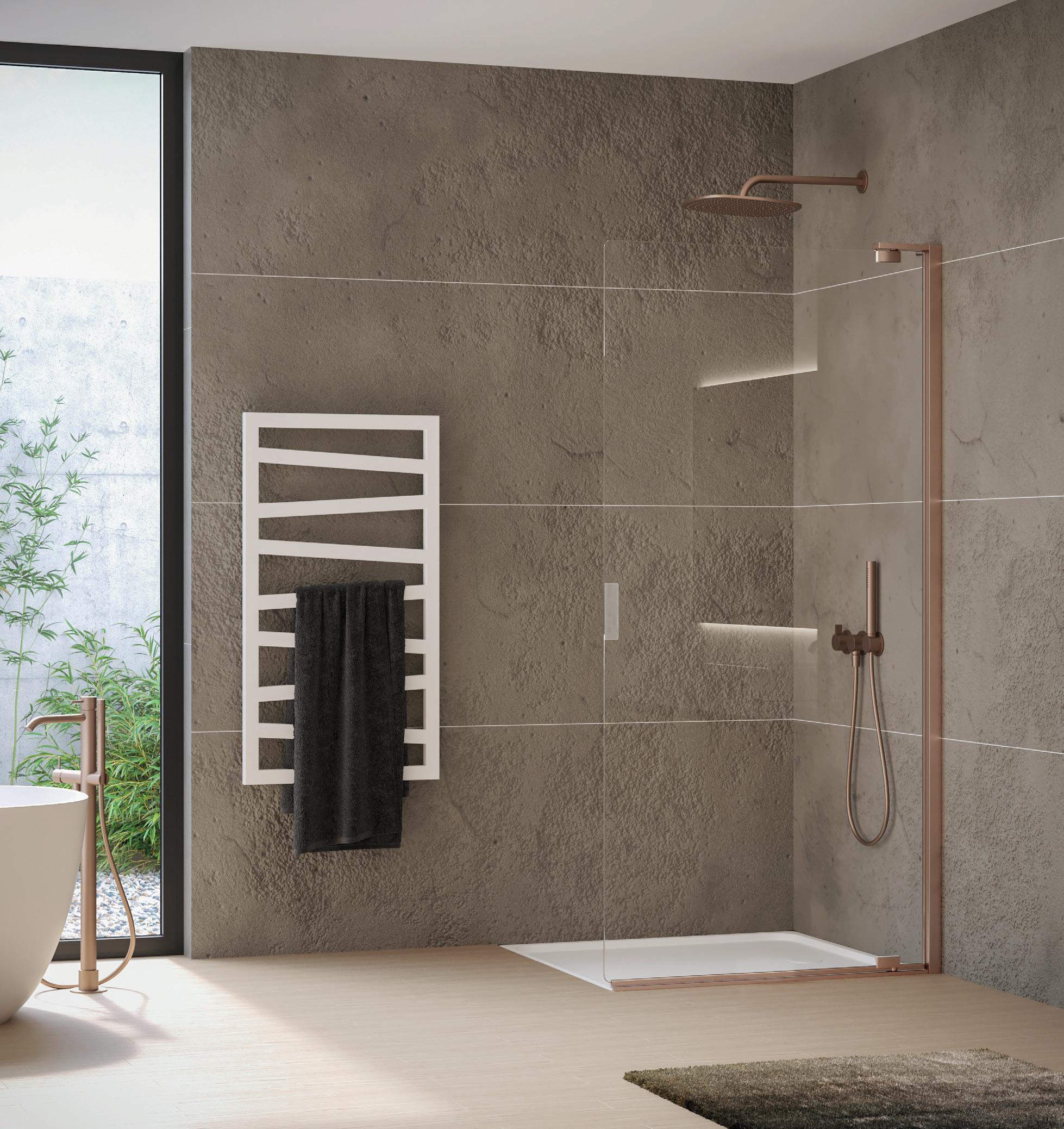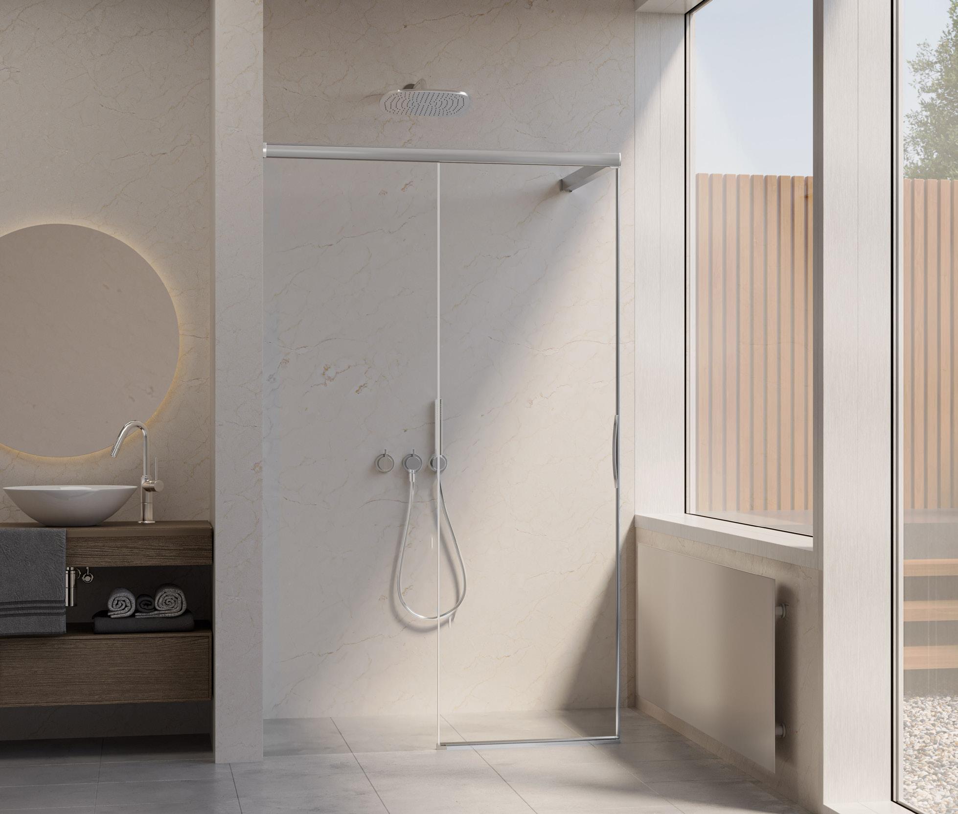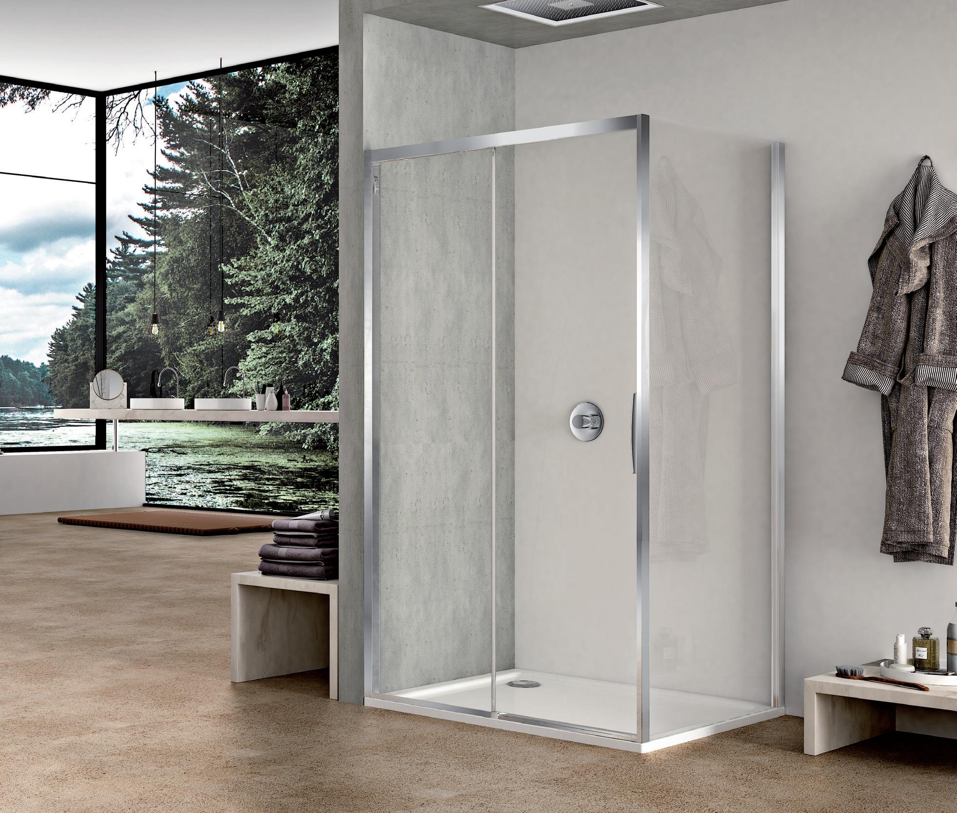 La regolazione a parete di 25 mm degli elementi fissi e laterali avviene grazie alla regolazione lineare del vetro temperato nel “profilo a muro”.
