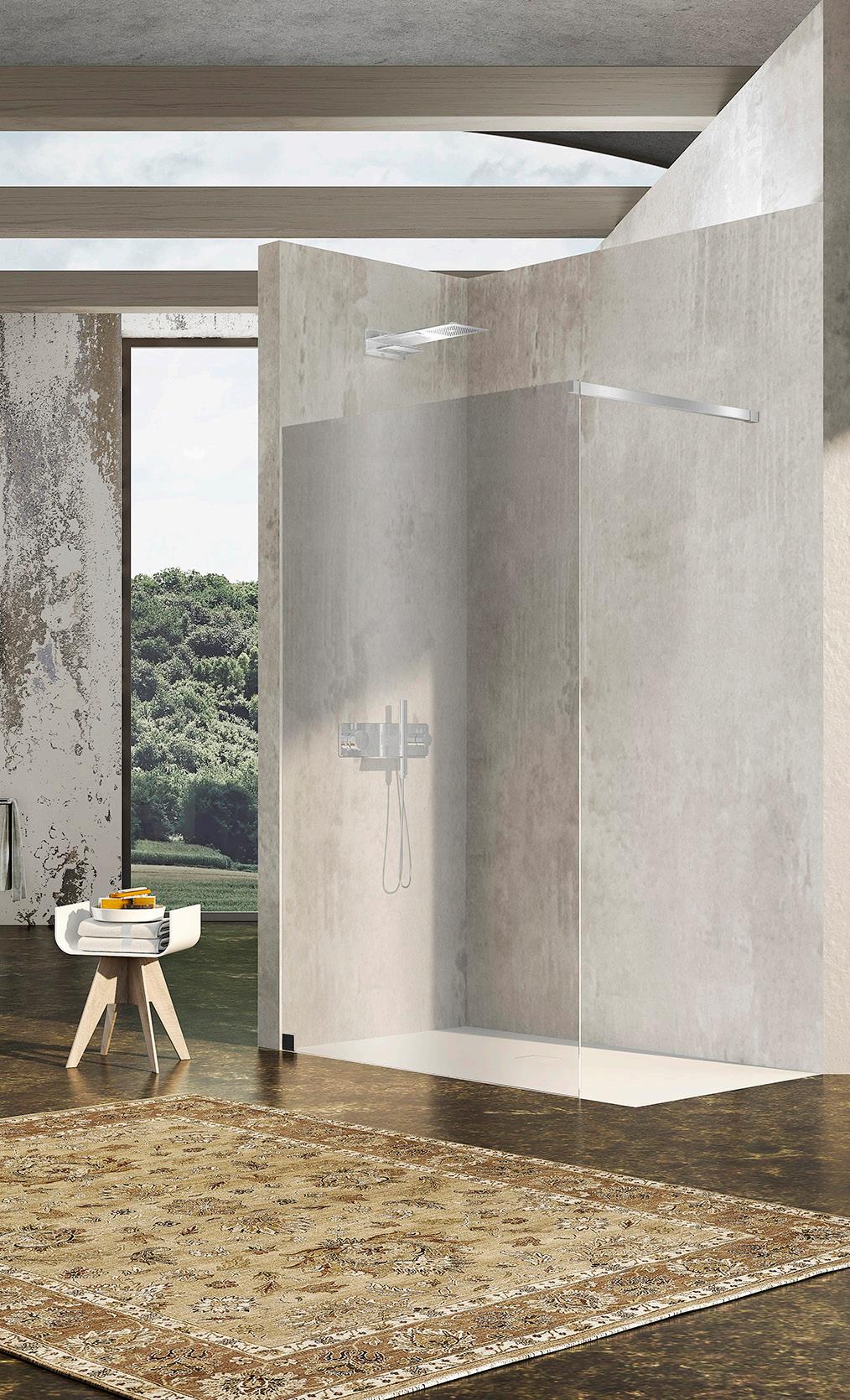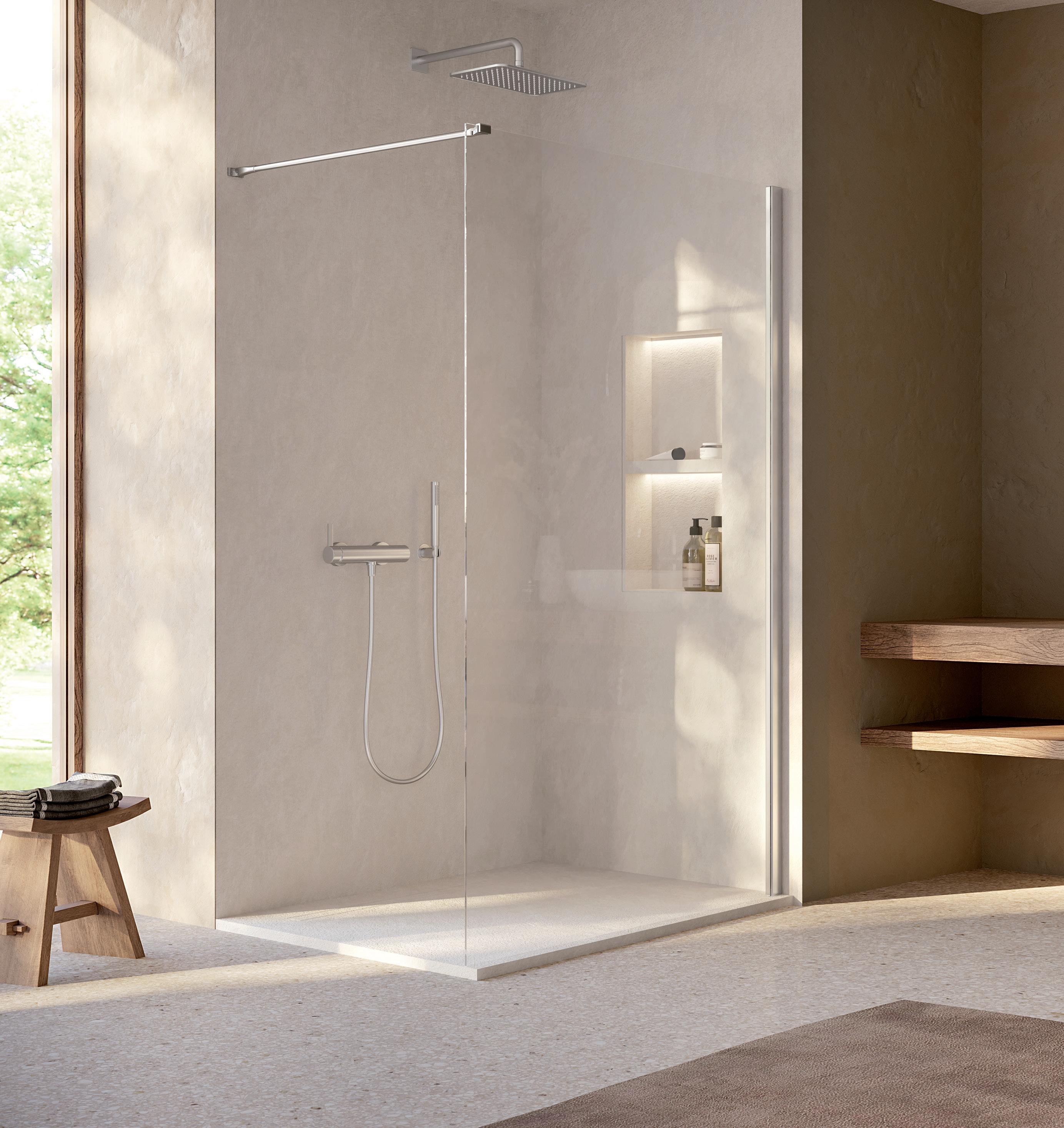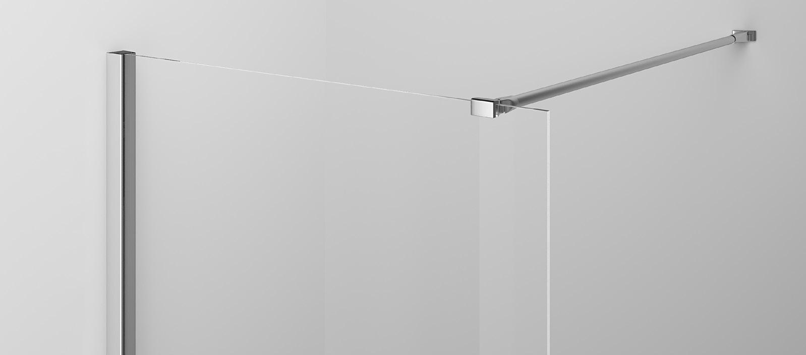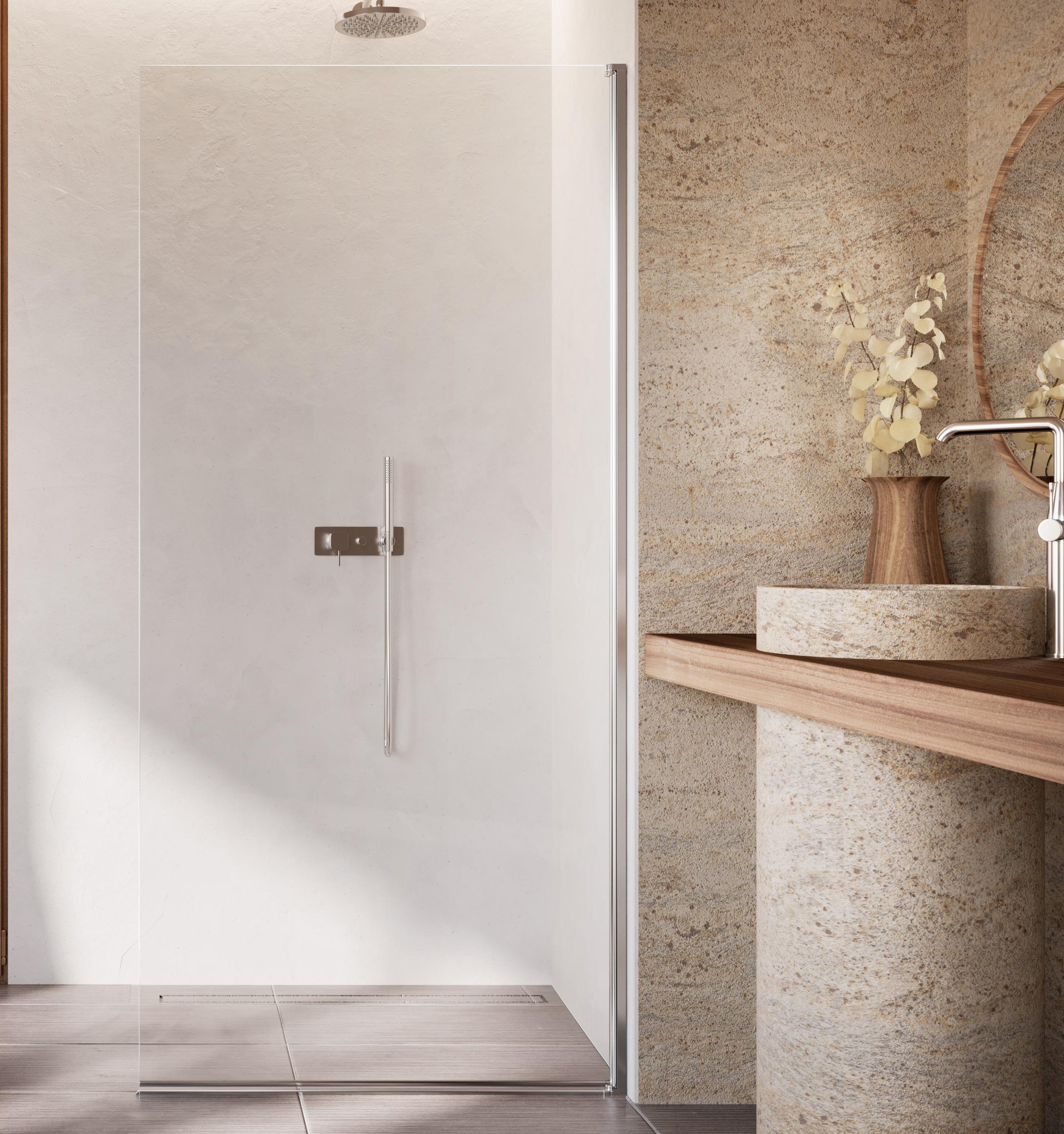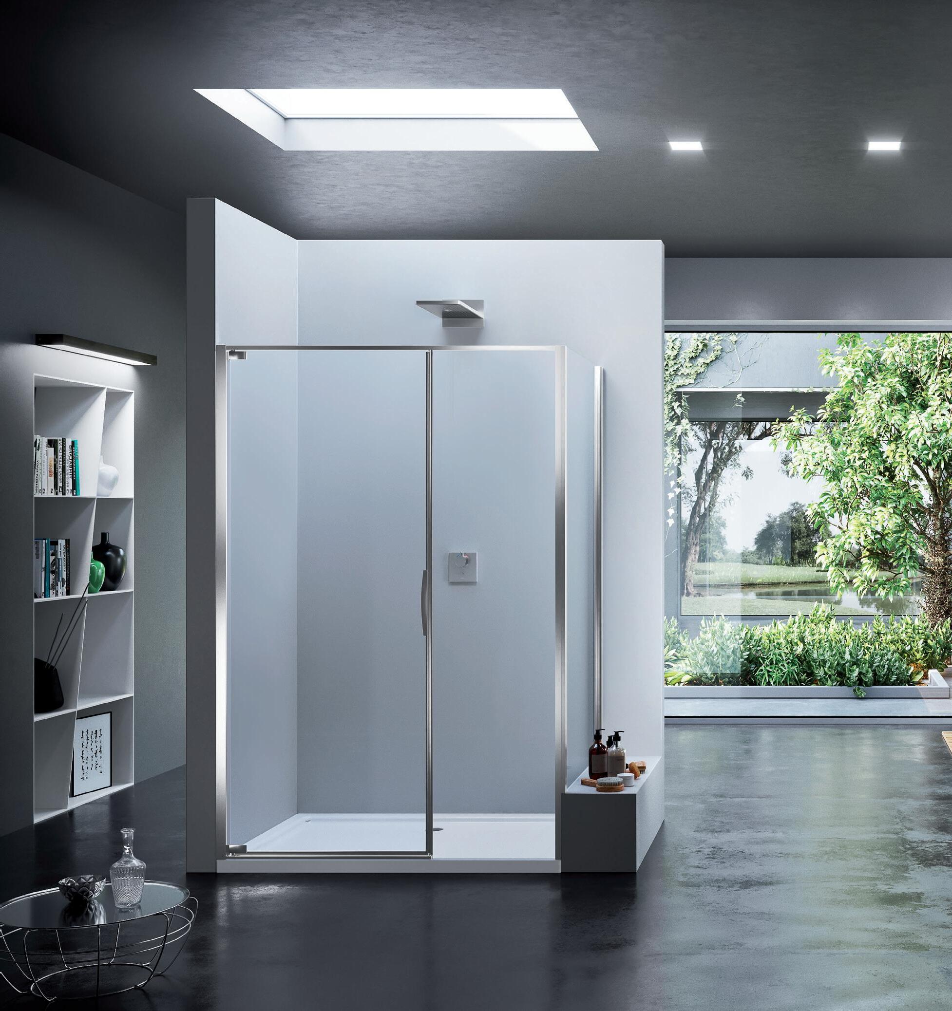 La regolazione a parete di 25 mm degli elementi fissi e laterali avviene grazie alla regolazione lineare del vetro temperato nel “profilo a muro”.