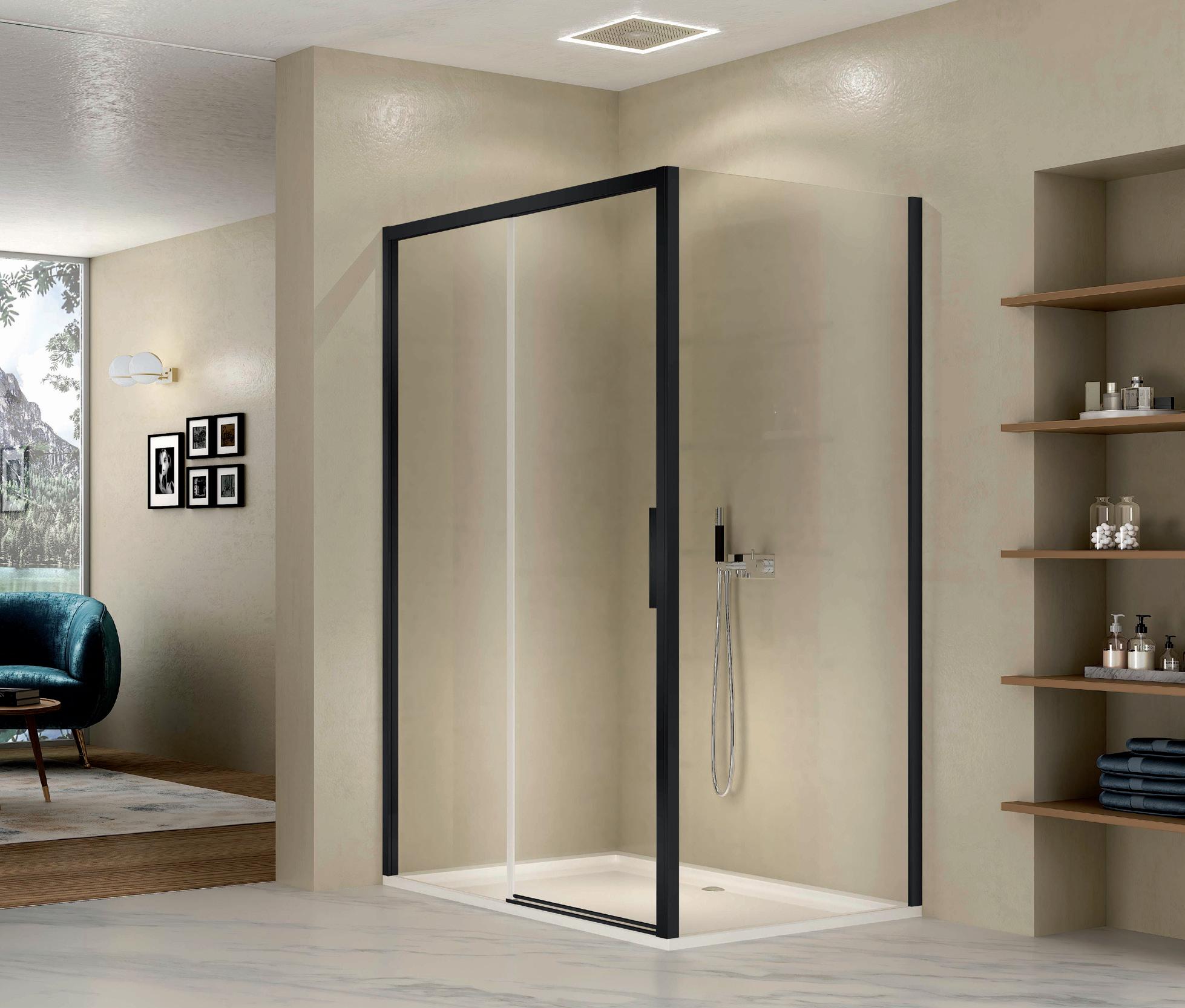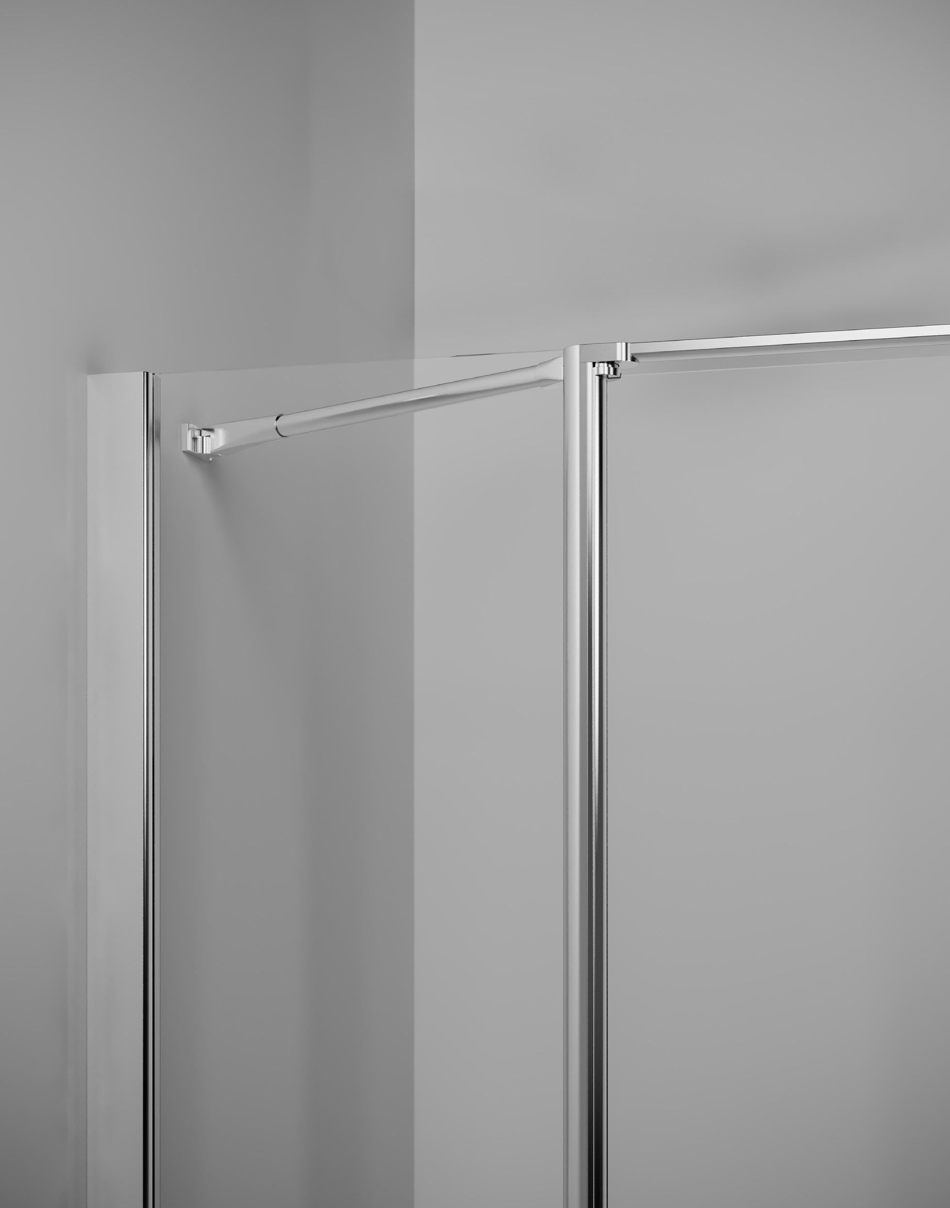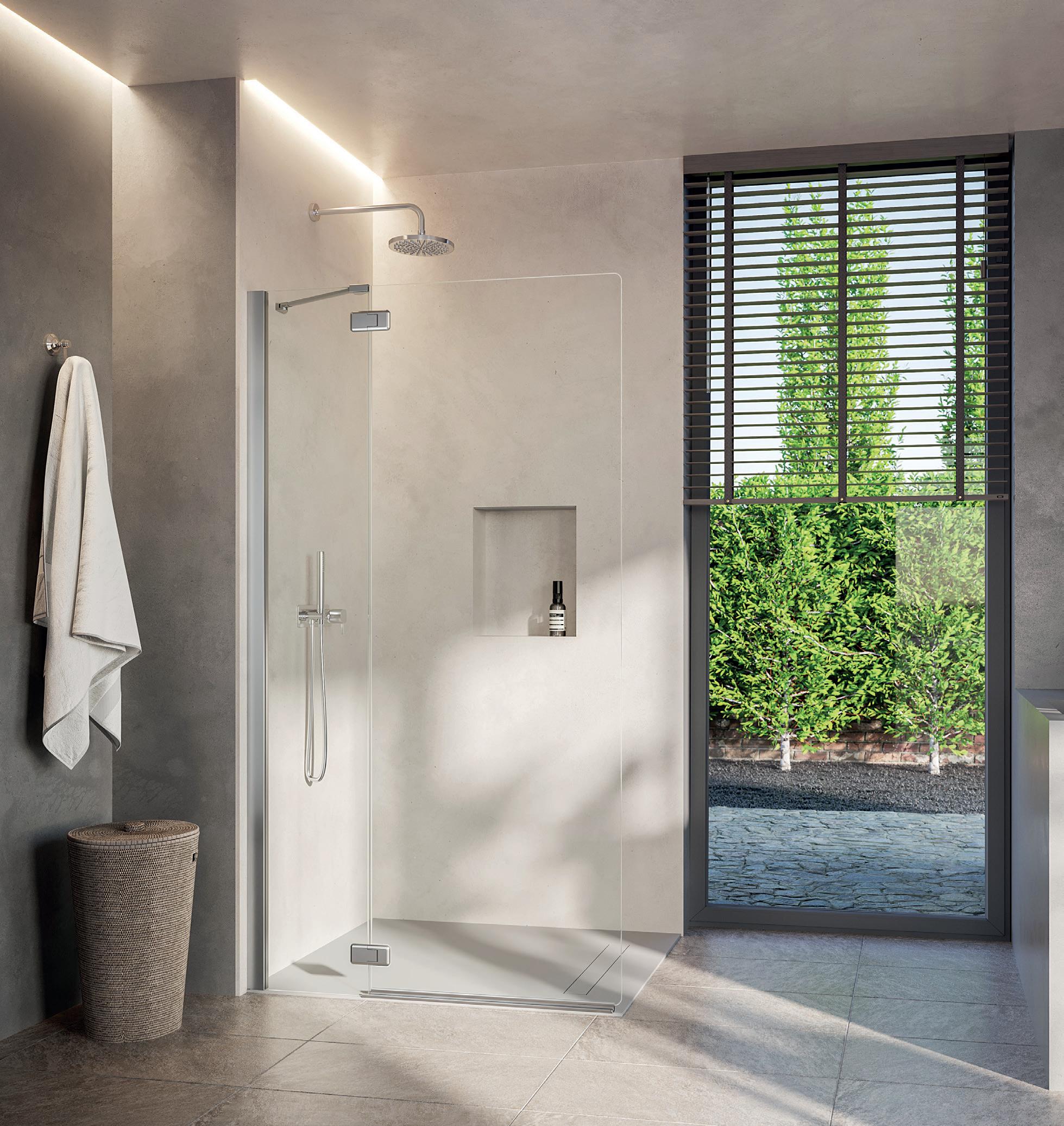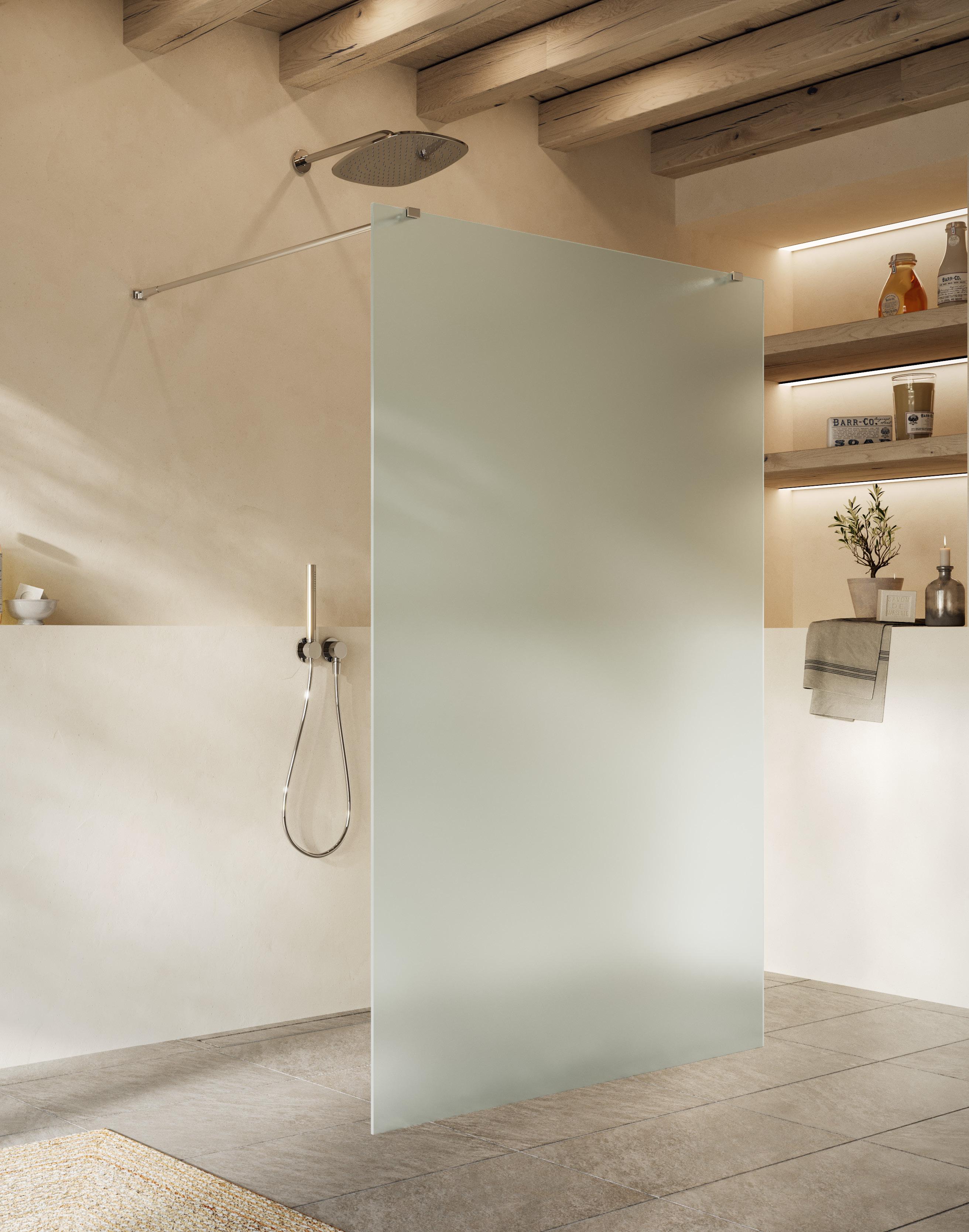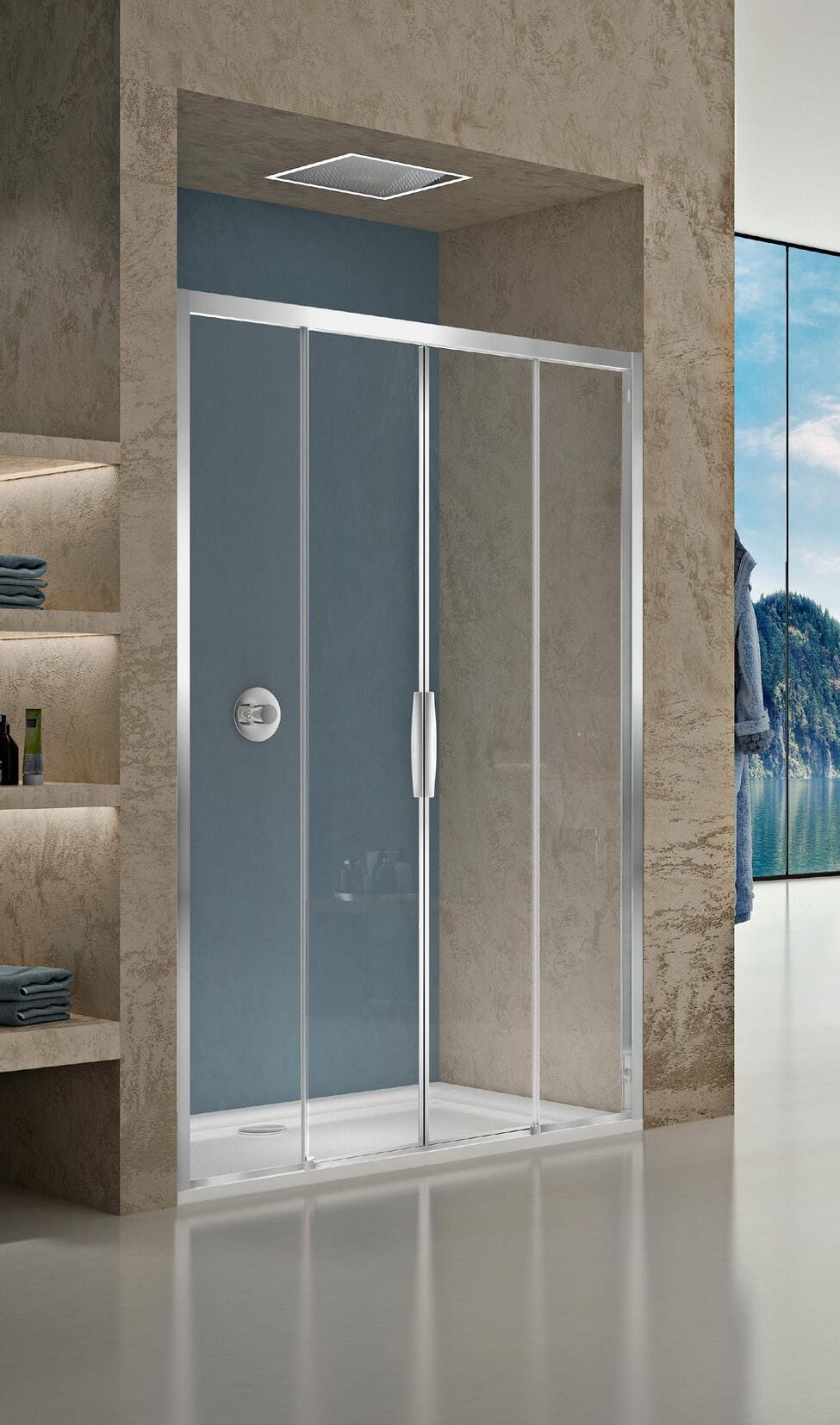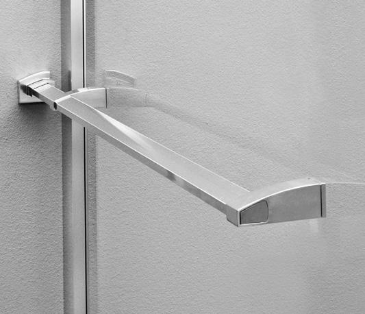 La regolazione a parete di 25 mm degli elementi fissi e laterali avviene grazie alla regolazione lineare del vetro temperato nel “profilo a muro”.