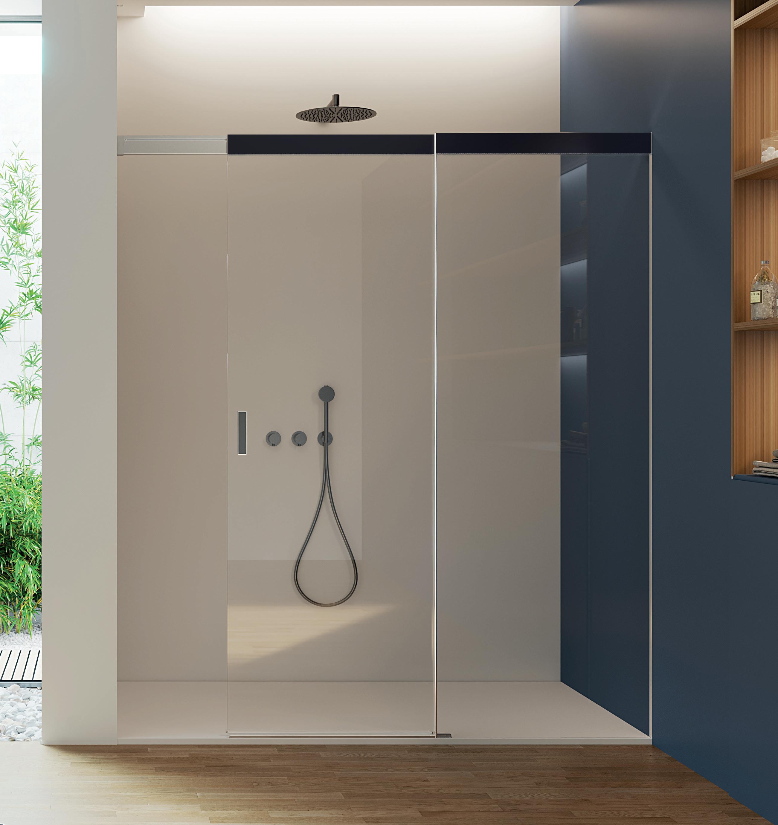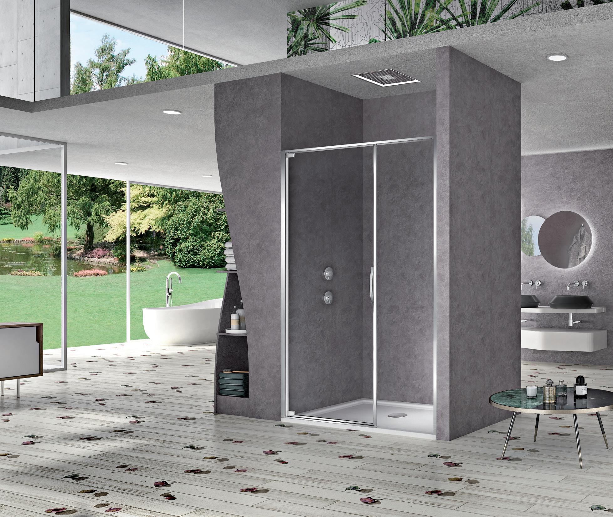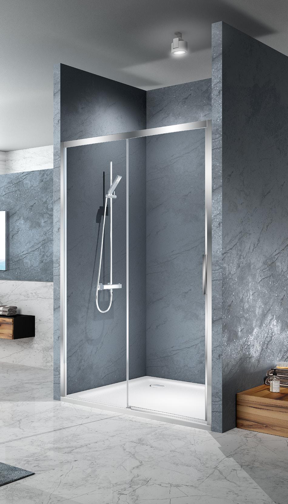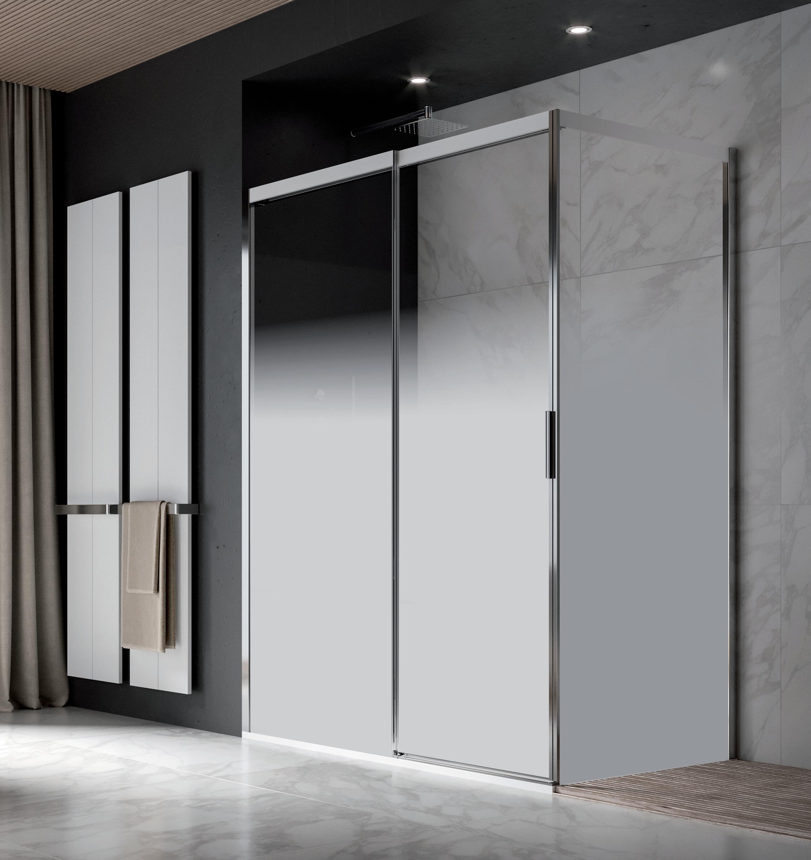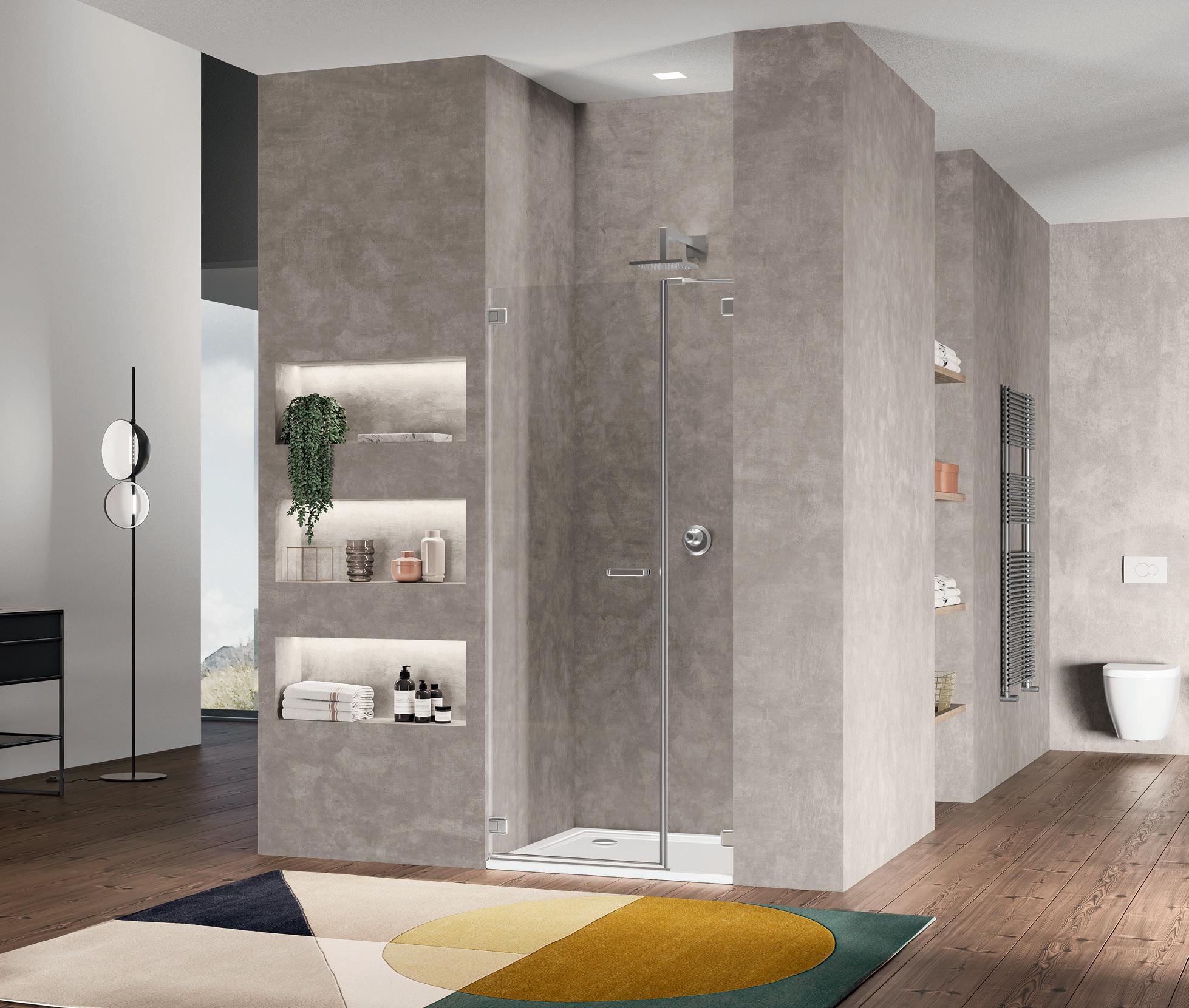 La regolazione a parete di 25 mm degli elementi fissi e laterali avviene grazie alla regolazione lineare del vetro temperato nel “profilo a muro”.