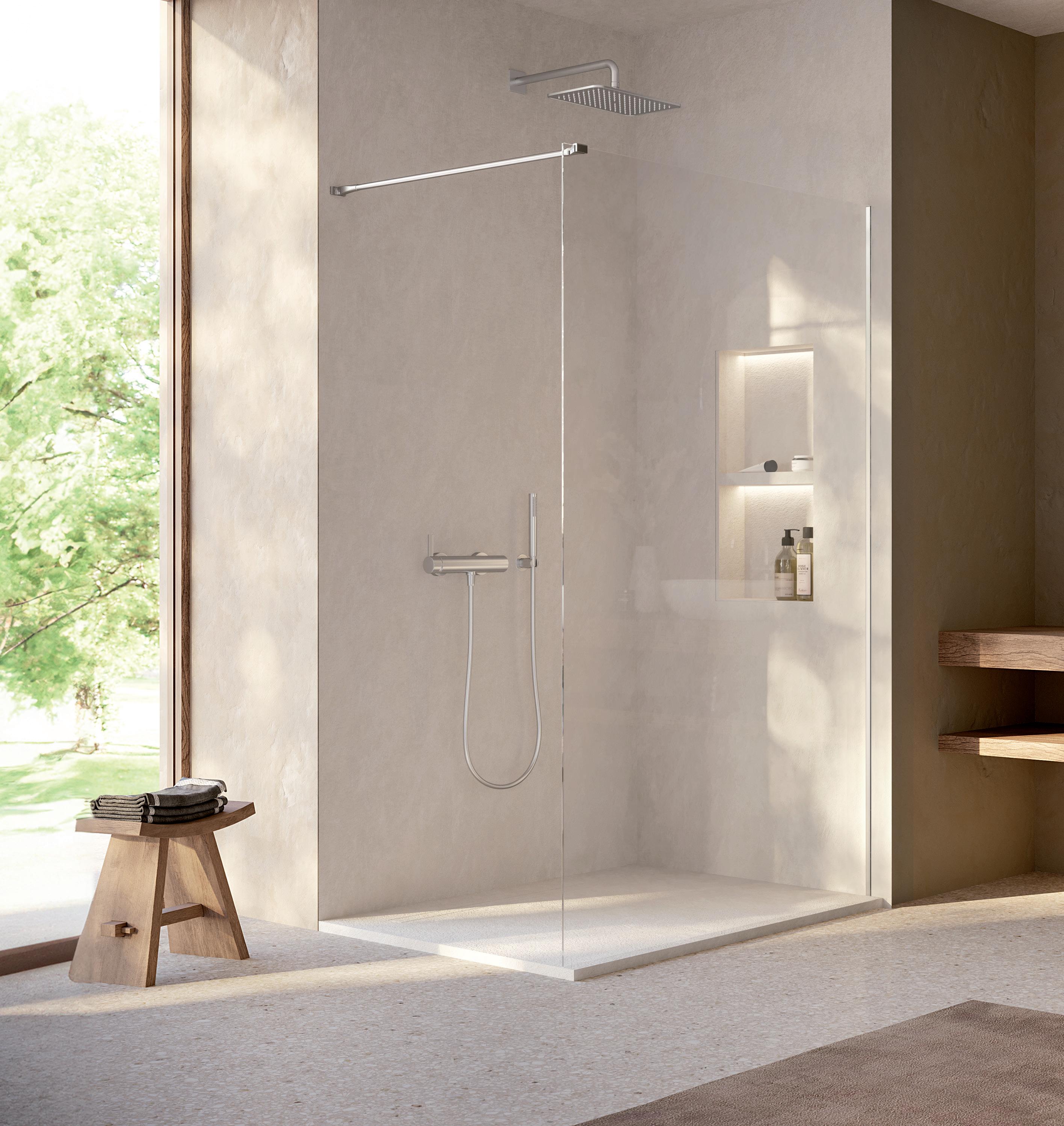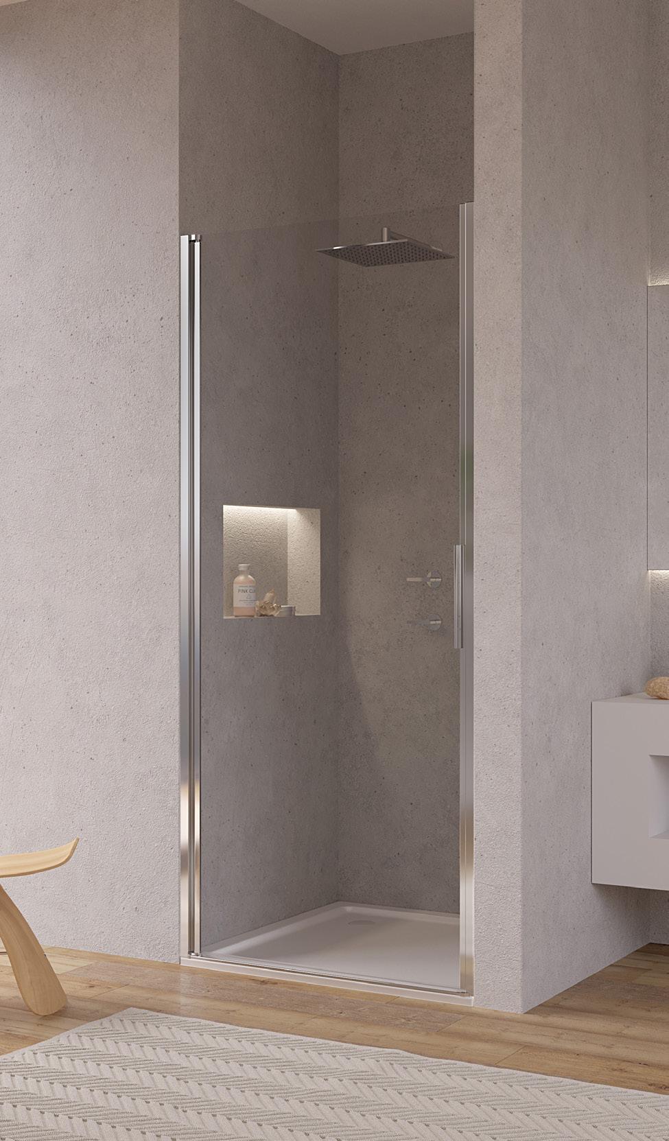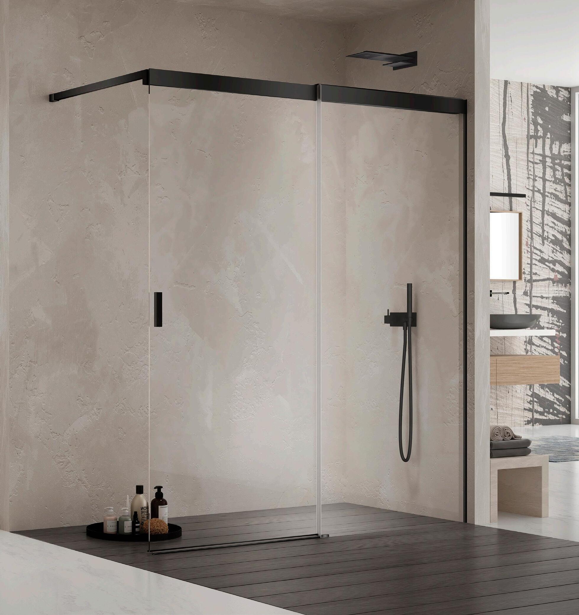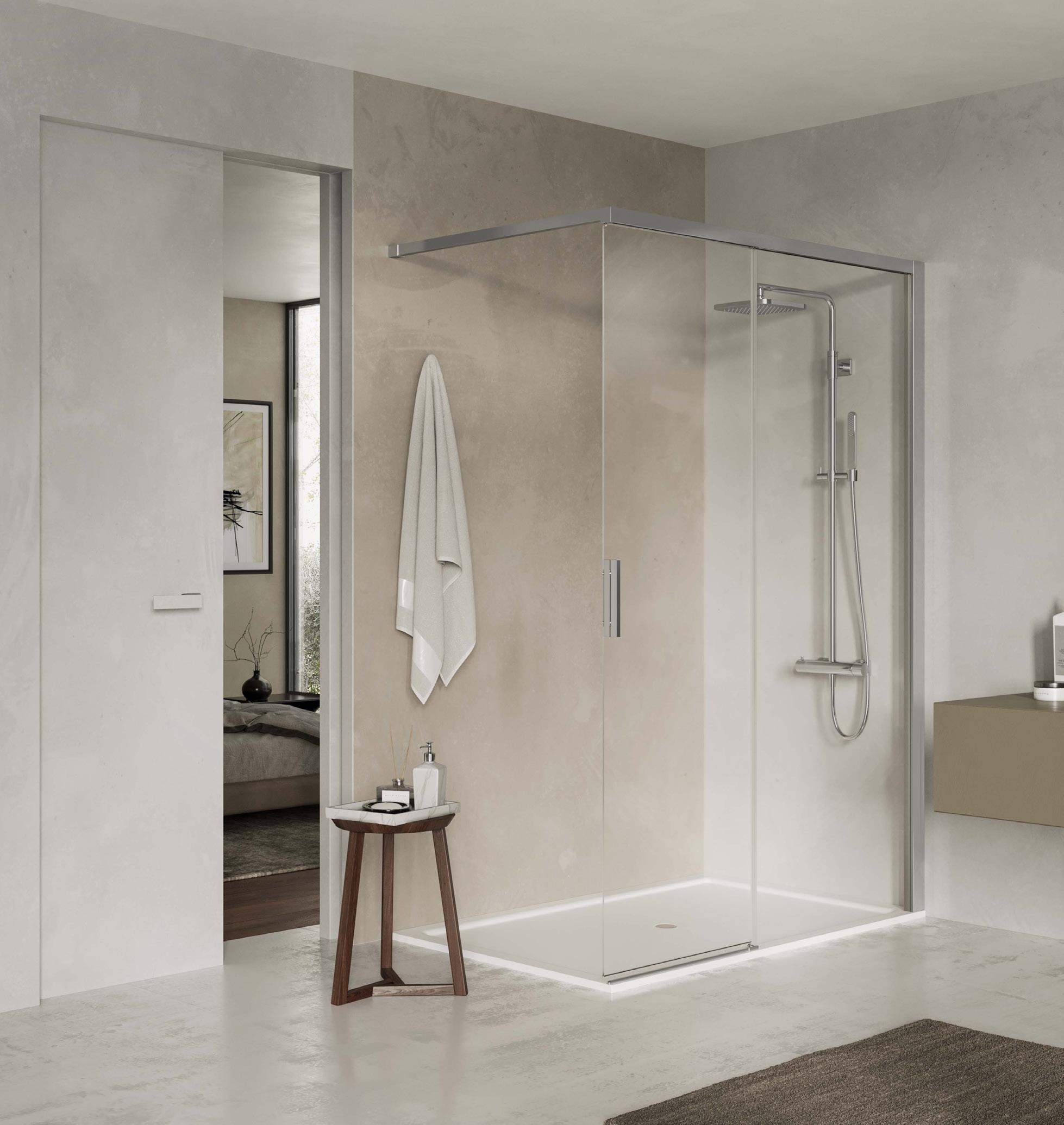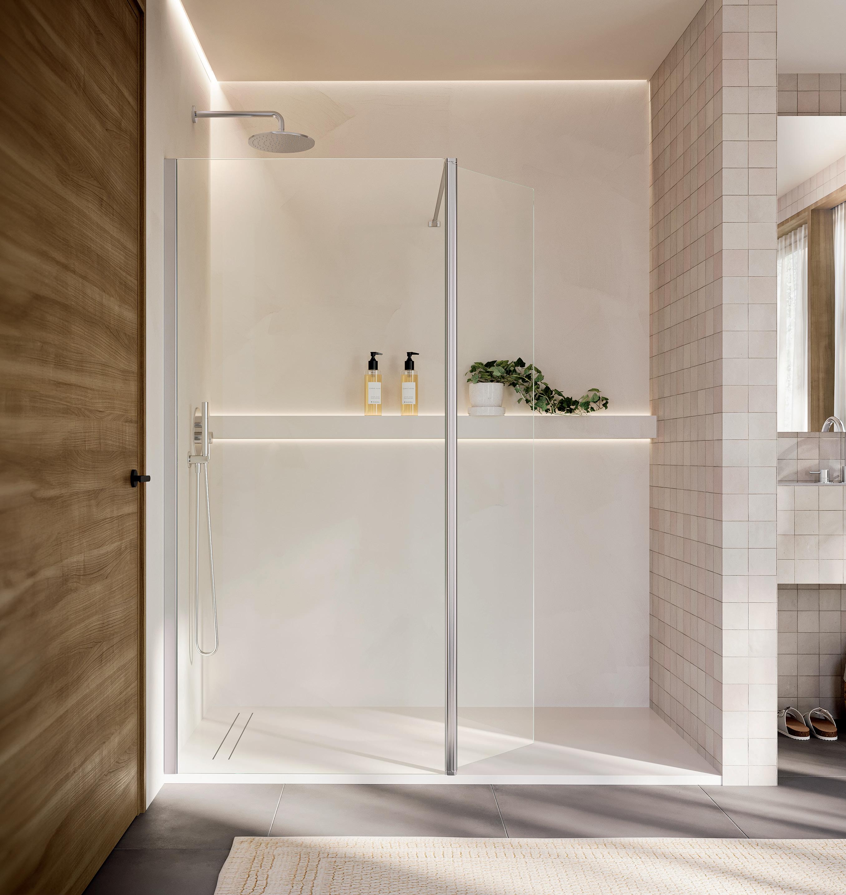 La regolazione a parete di 25 mm degli elementi fissi e laterali avviene grazie alla regolazione lineare del vetro temperato nel “profilo a muro”.