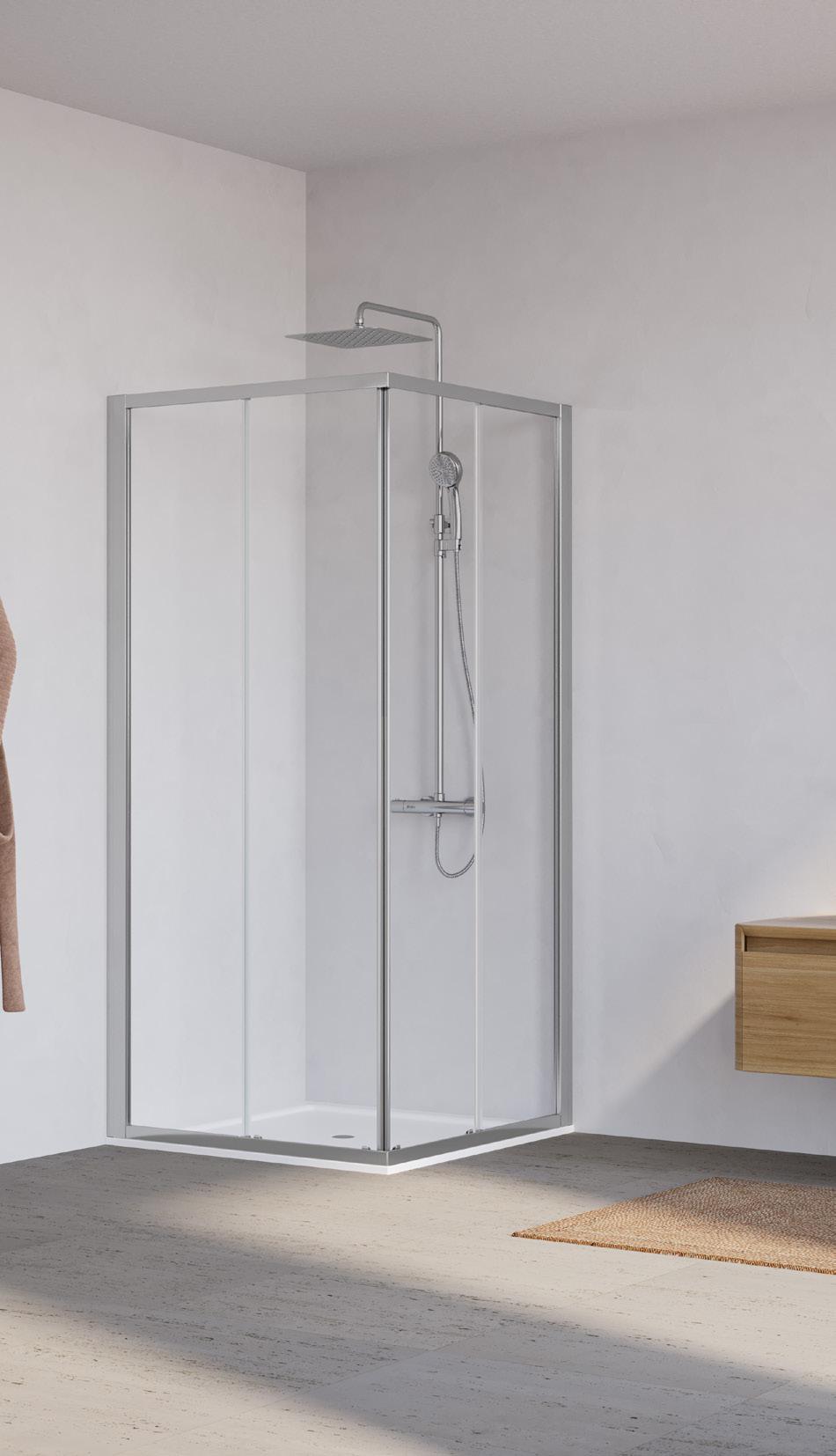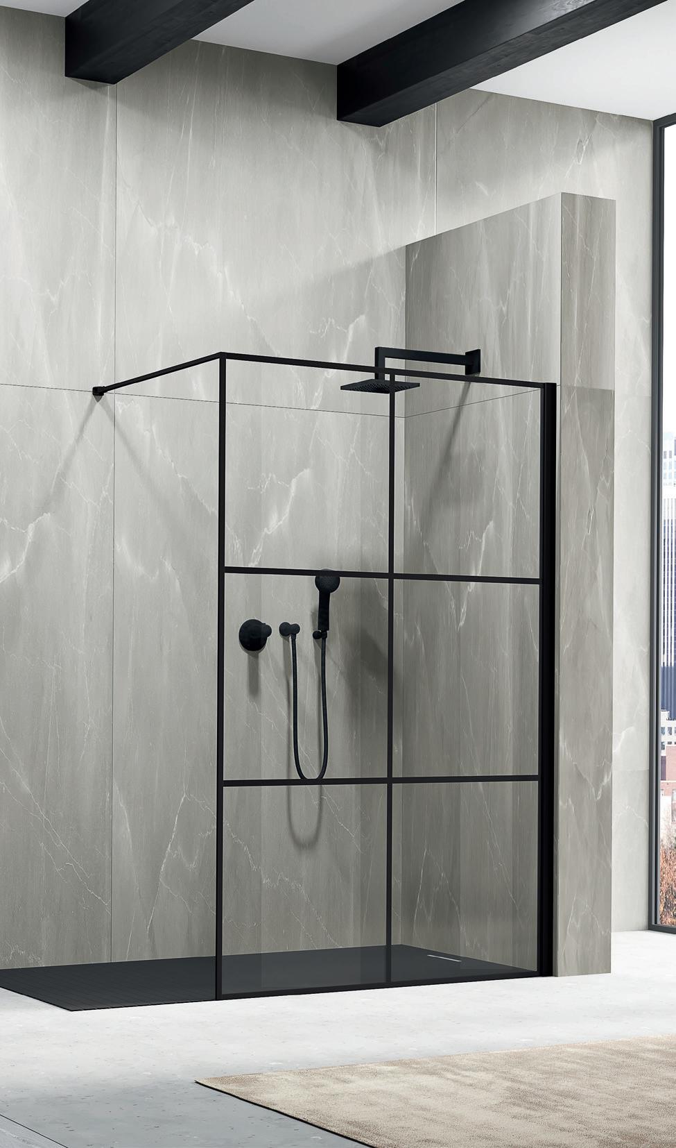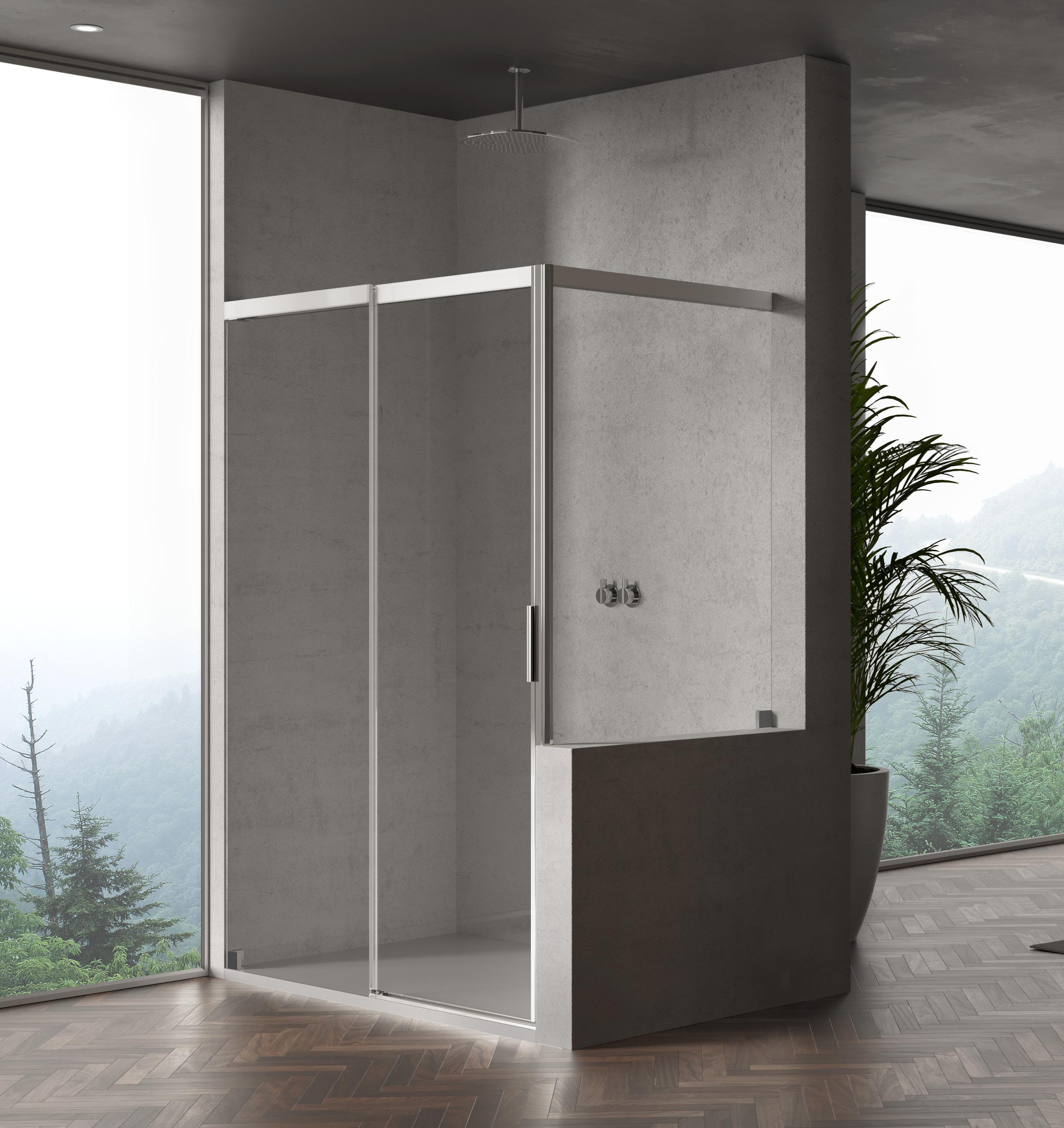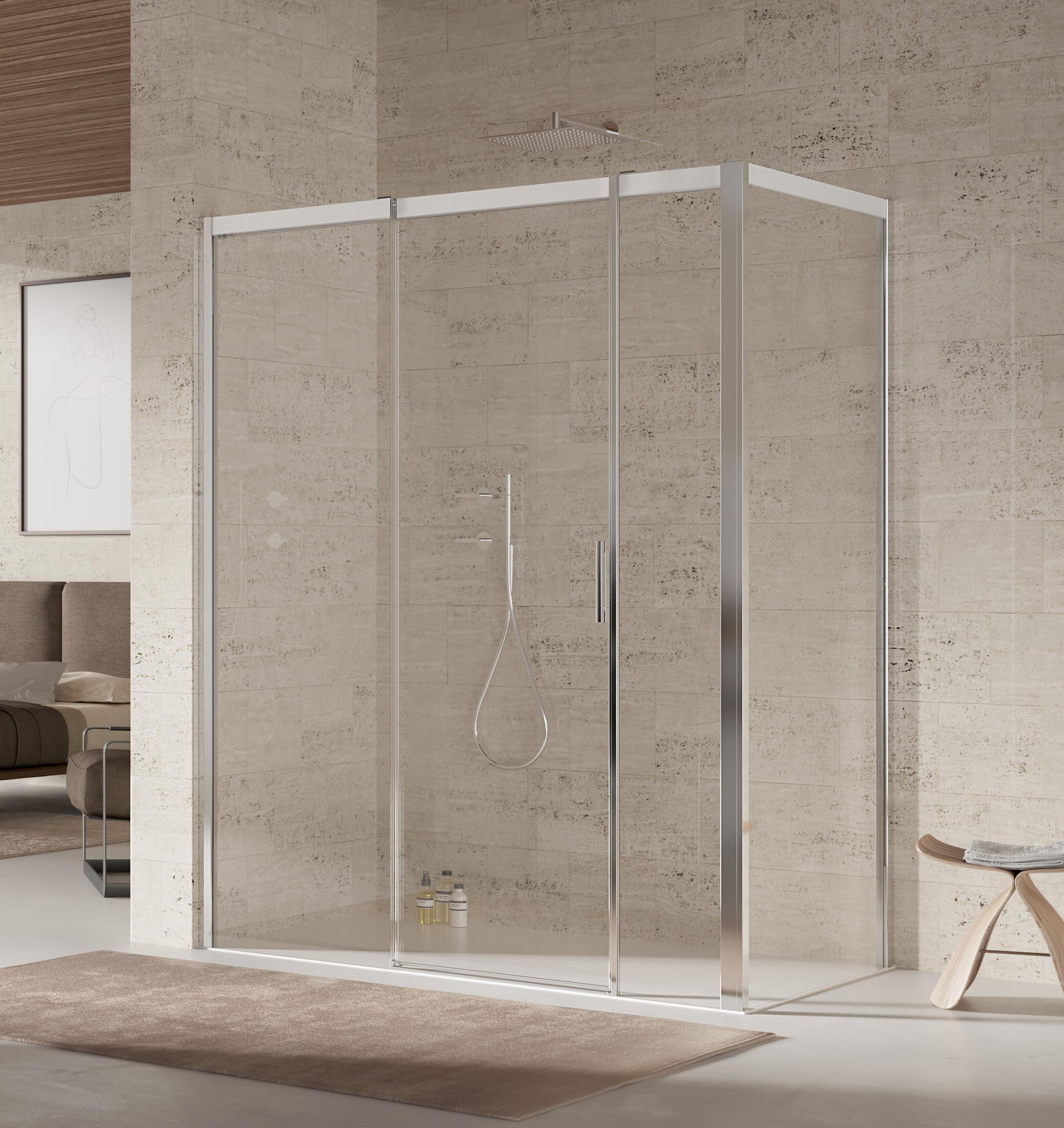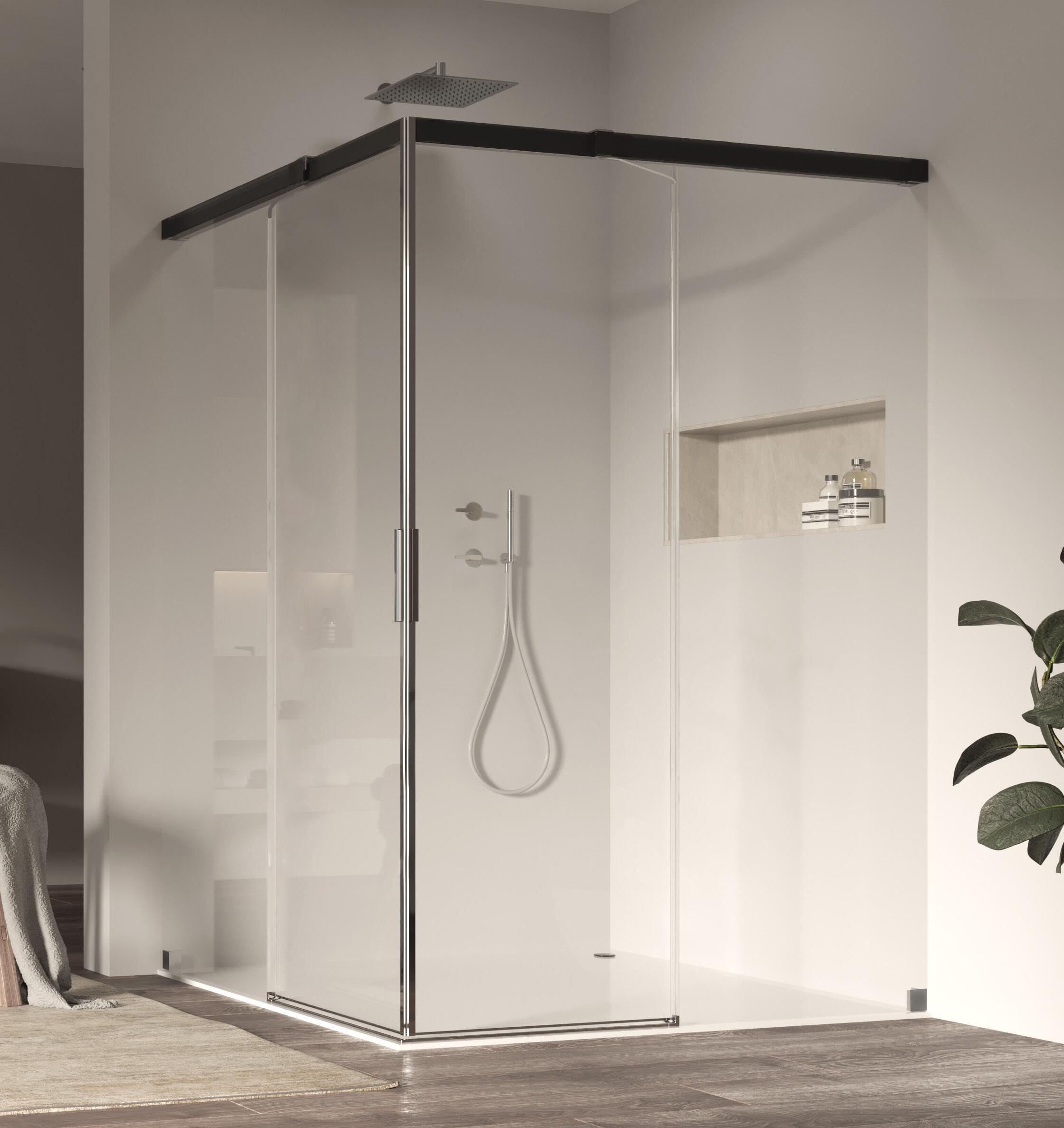 La regolazione a parete di 25 mm degli elementi fissi e laterali avviene grazie alla regolazione lineare del vetro temperato nel “profilo a muro”.