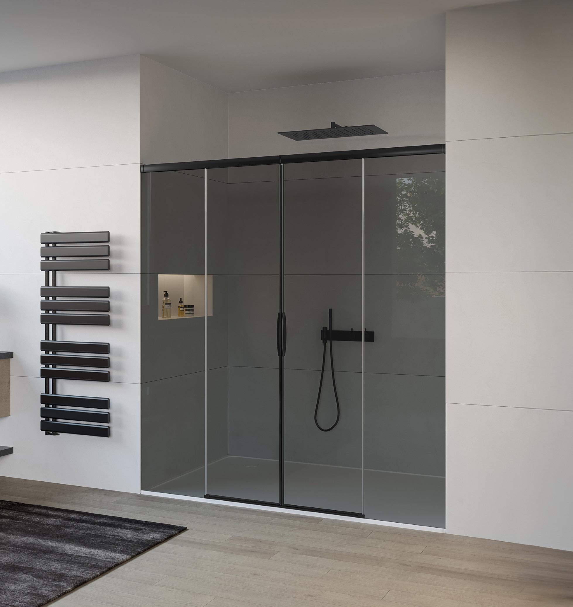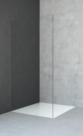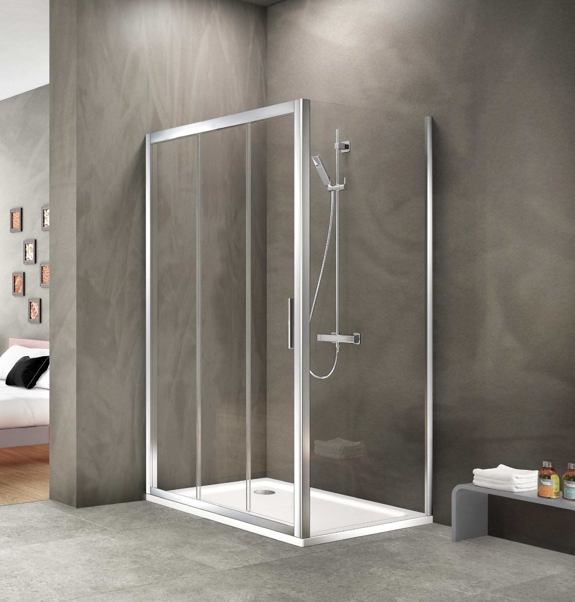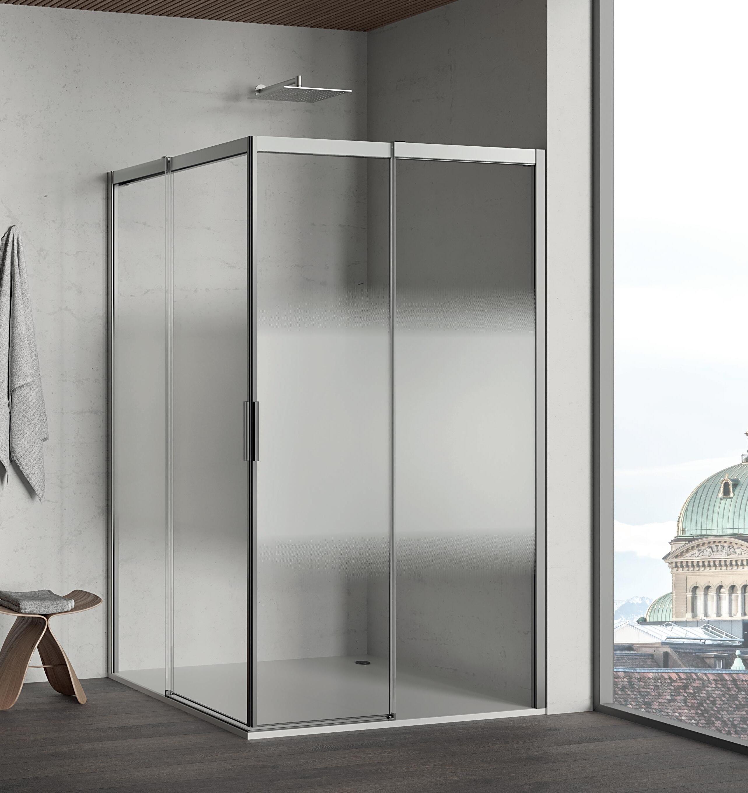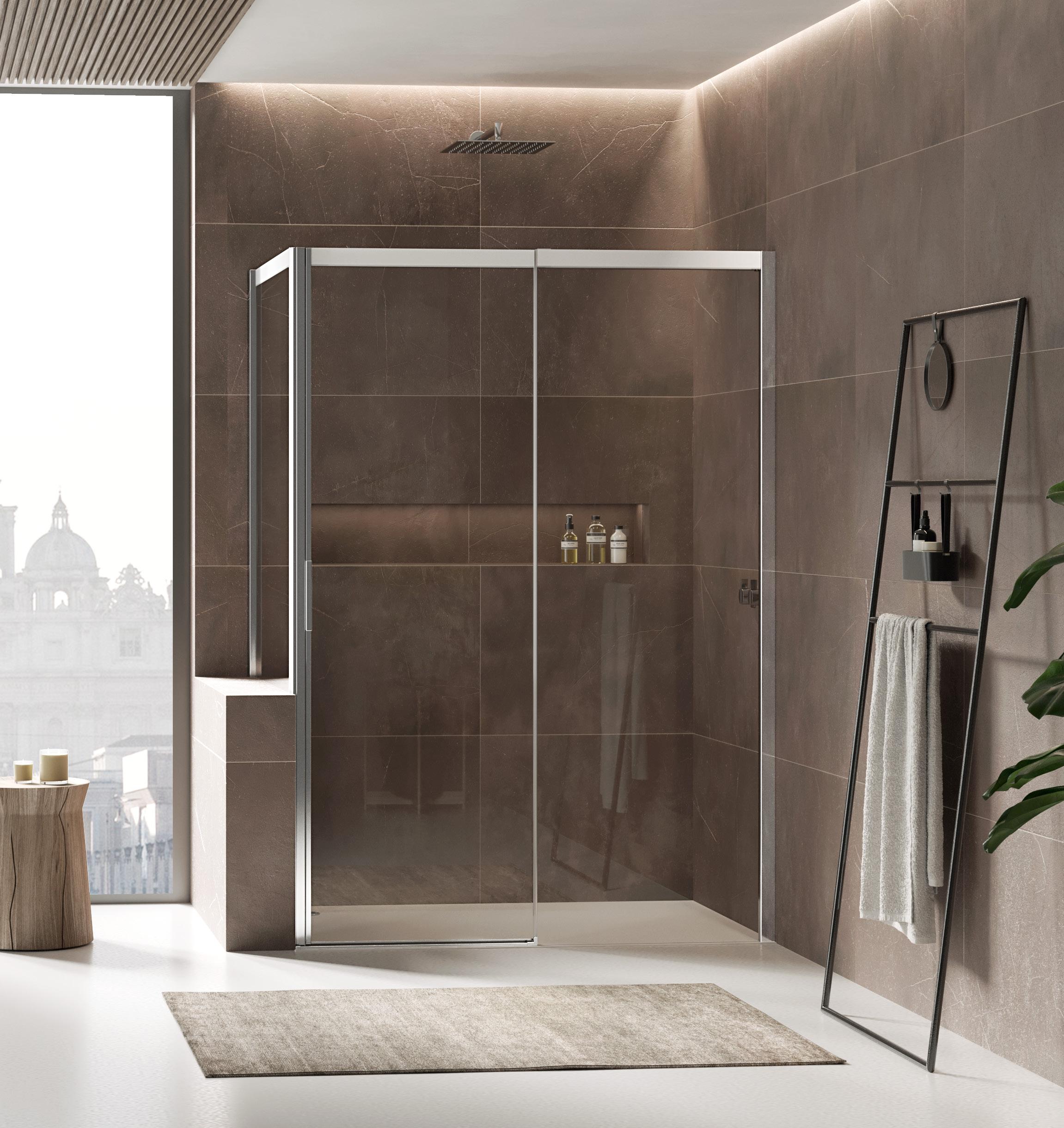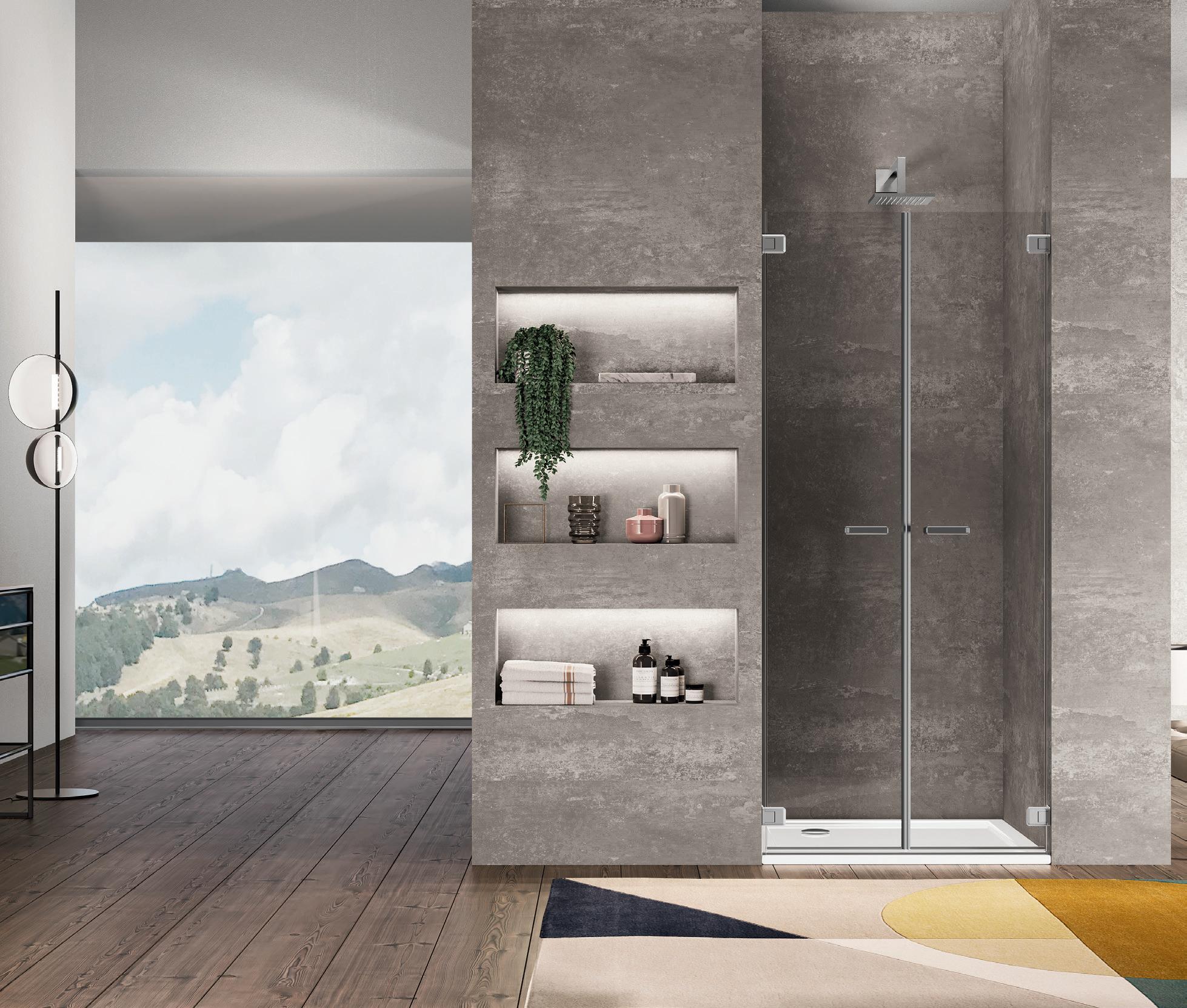 La regolazione a parete di 25 mm degli elementi fissi e laterali avviene grazie alla regolazione lineare del vetro temperato nel “profilo a muro”.