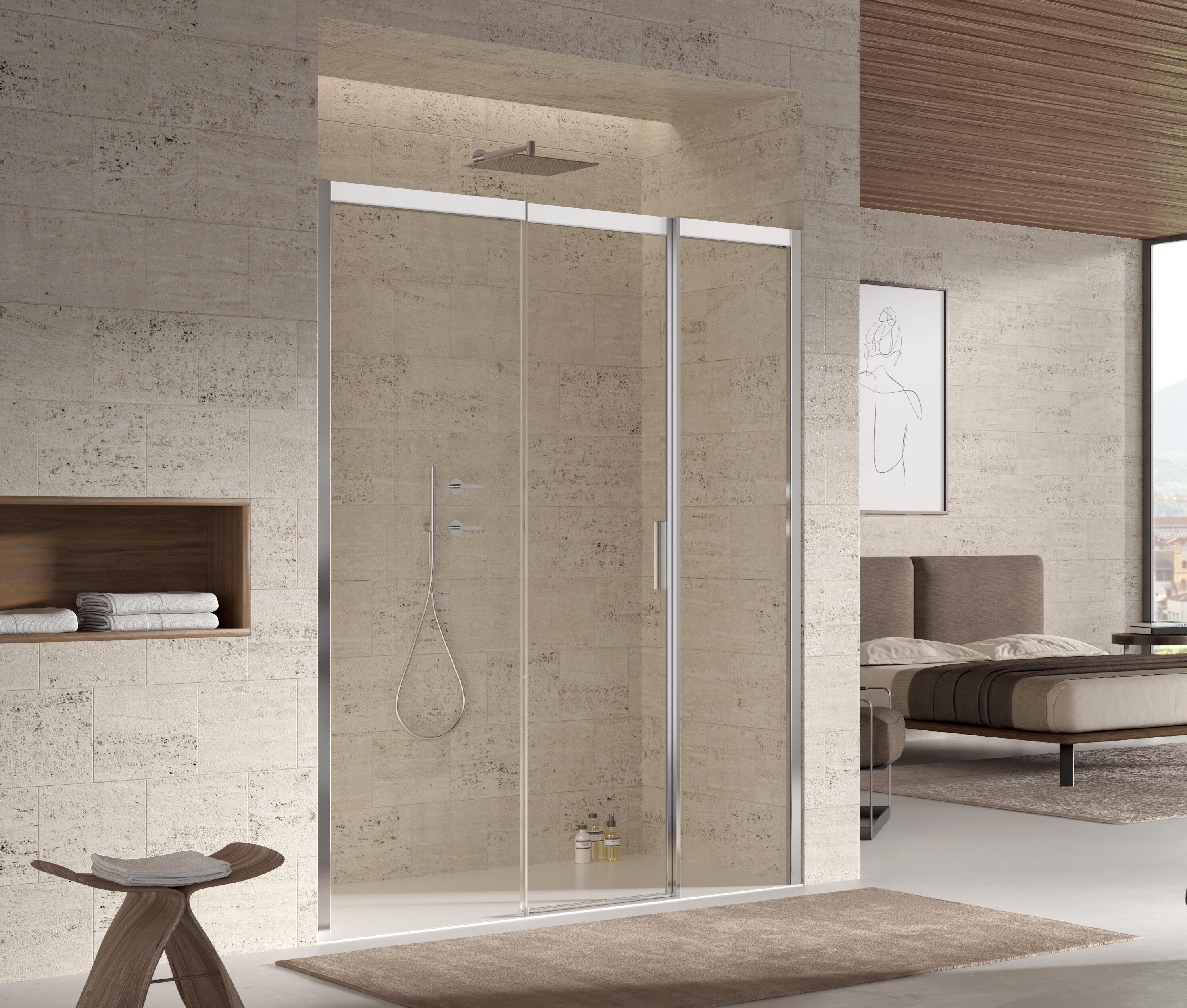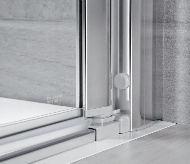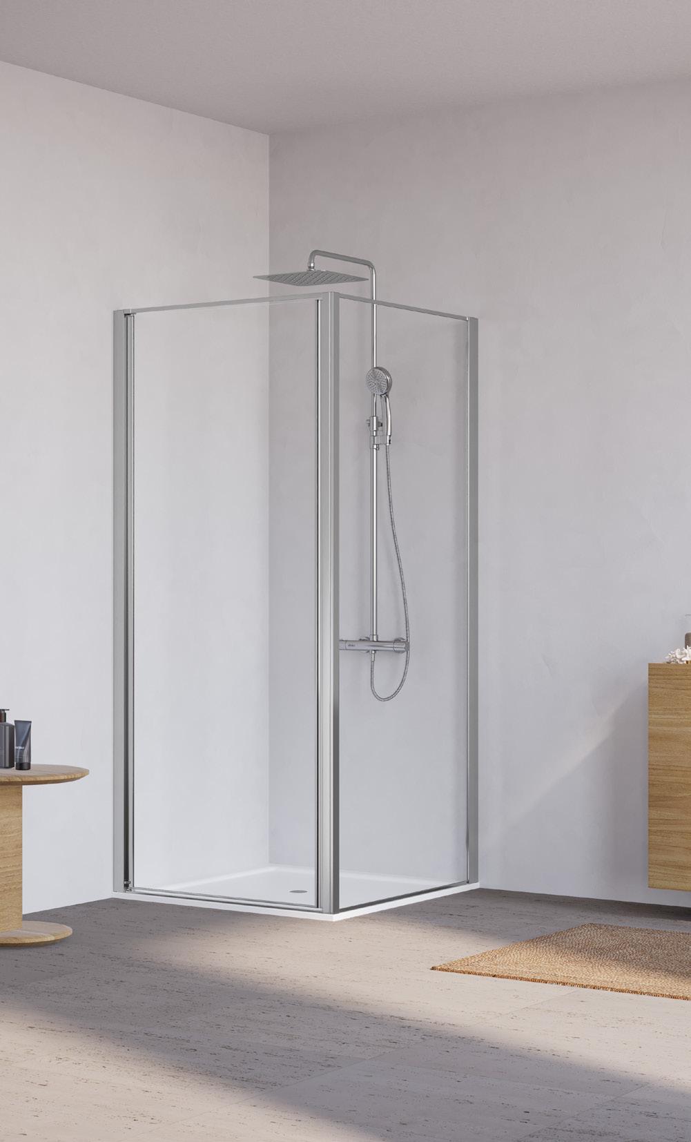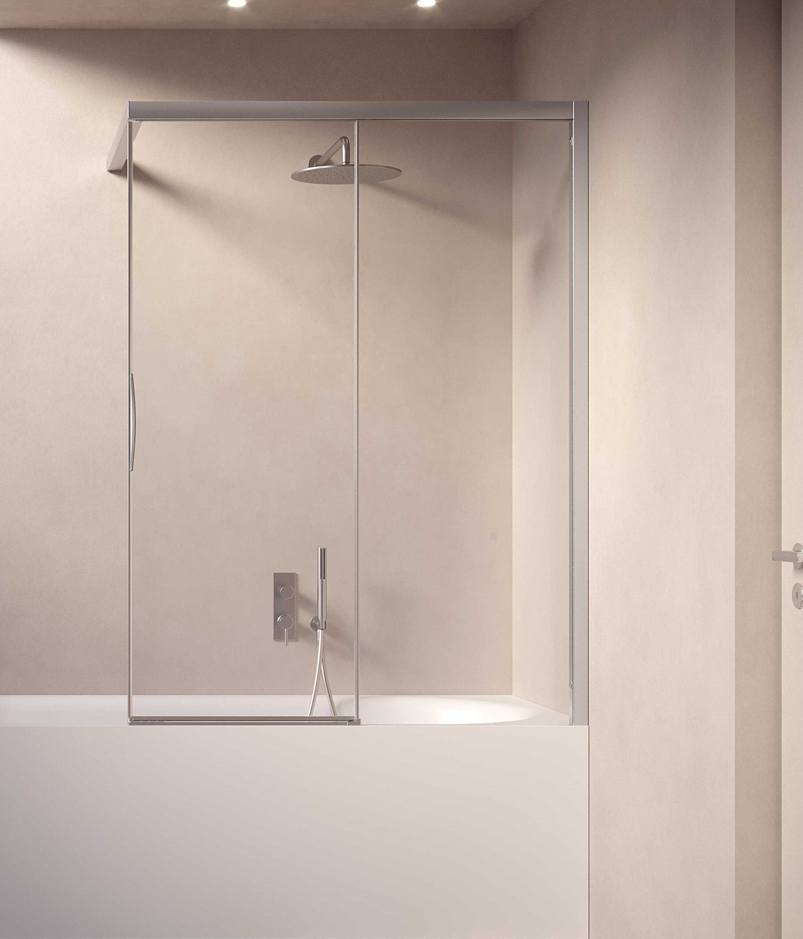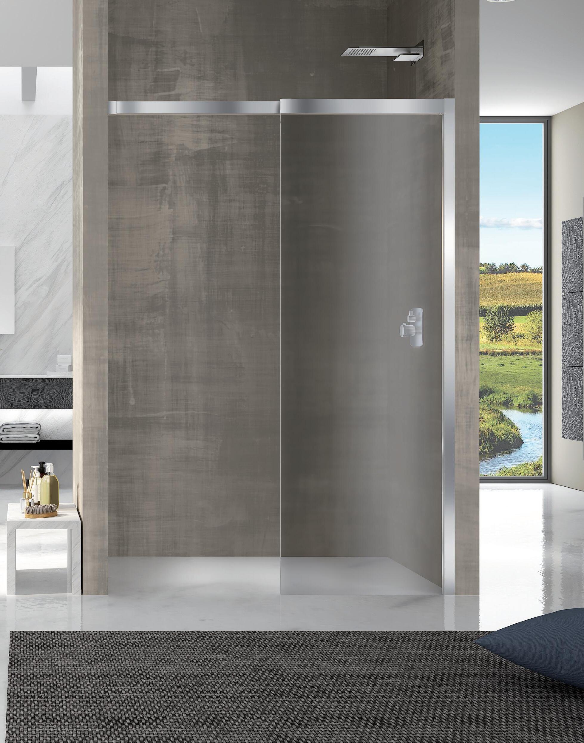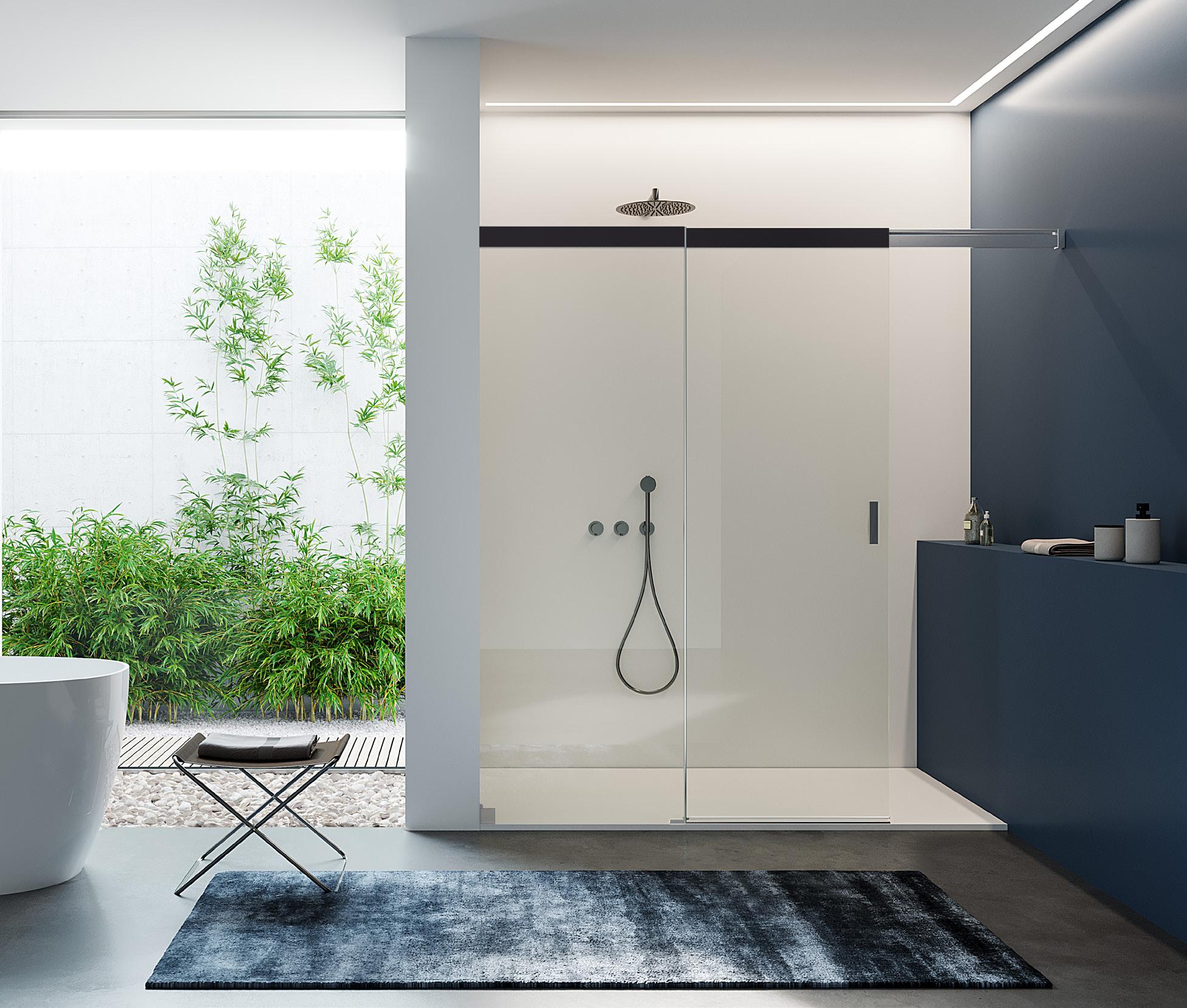 La regolazione a parete di 25 mm degli elementi fissi e laterali avviene grazie alla regolazione lineare del vetro temperato nel “profilo a muro”.