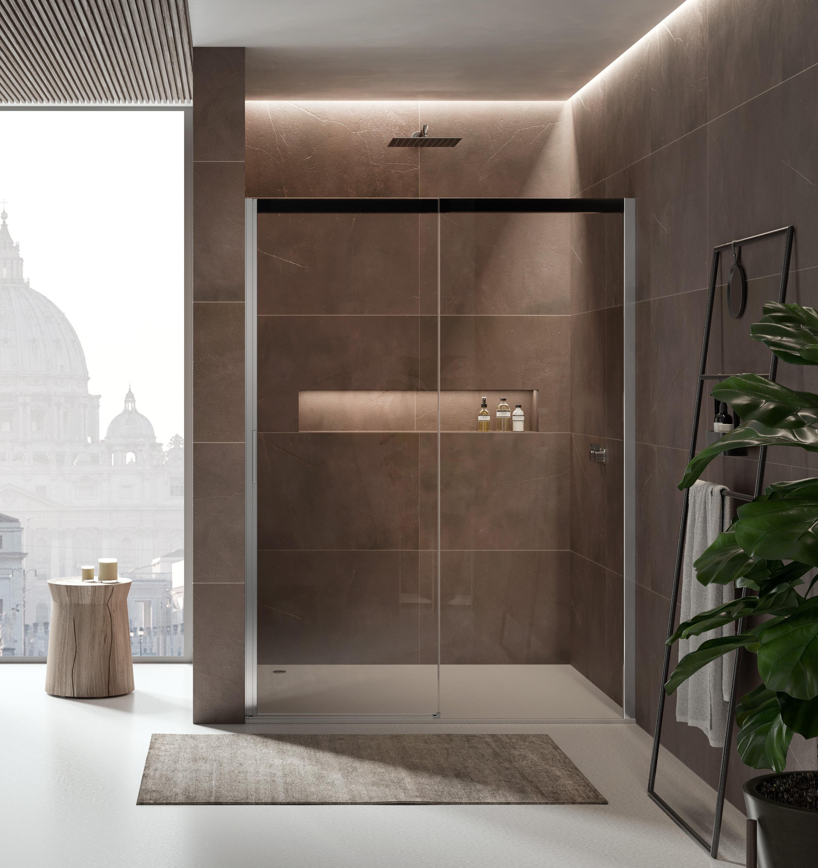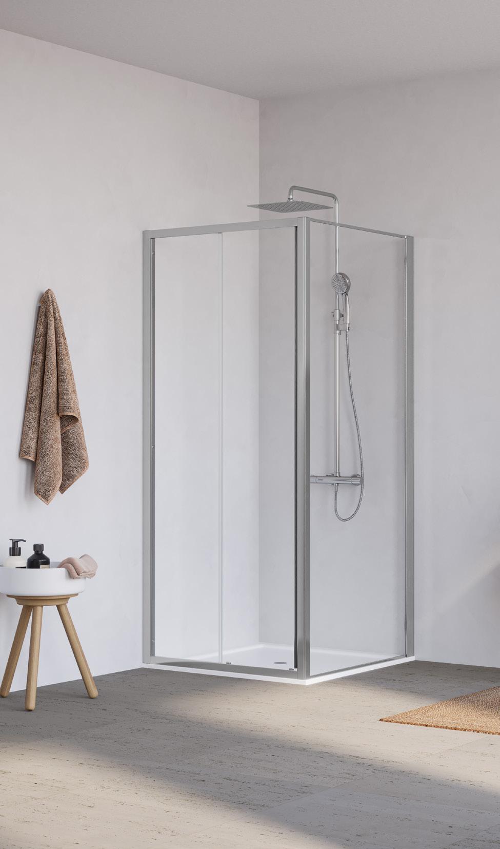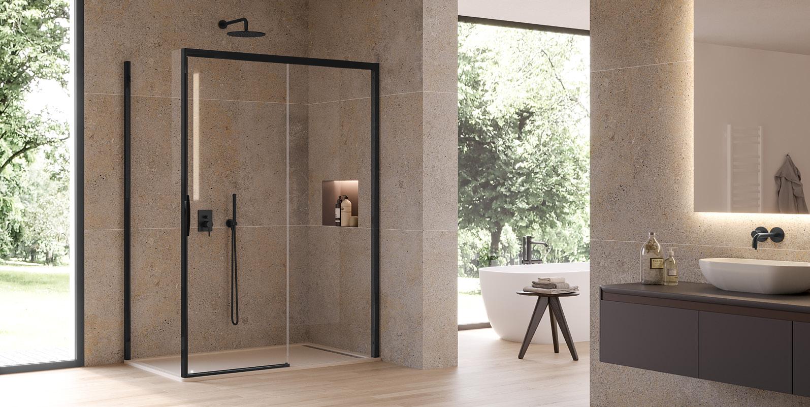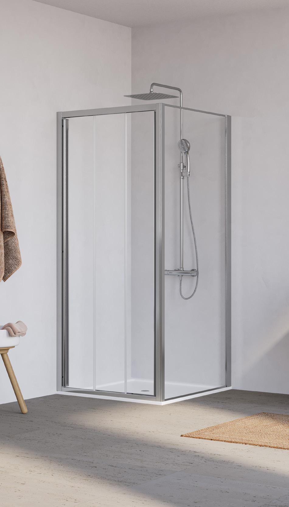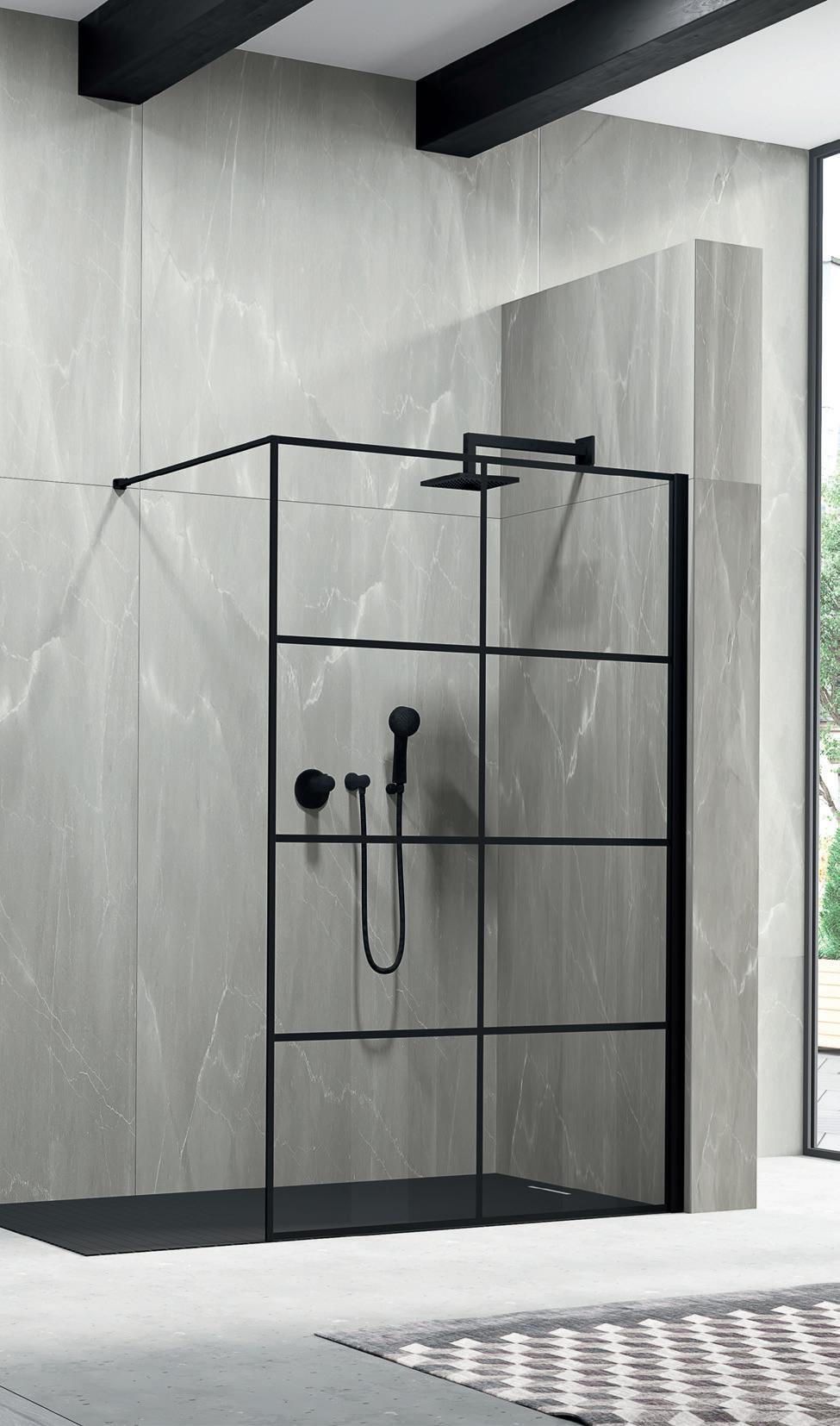La regolazione a parete di 25 mm degli elementi fissi e laterali avviene grazie alla regolazione lineare del vetro temperato nel “profilo a muro”.