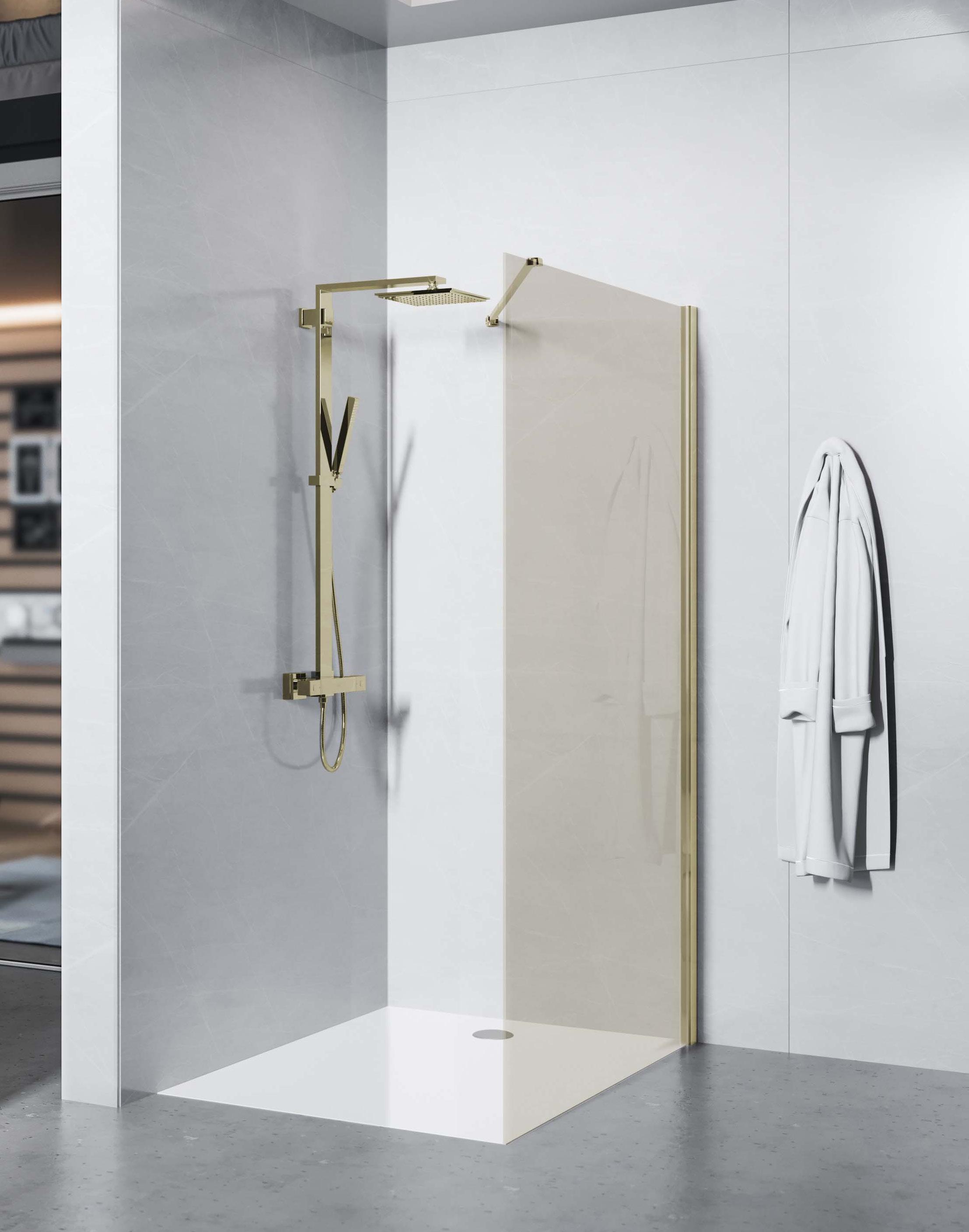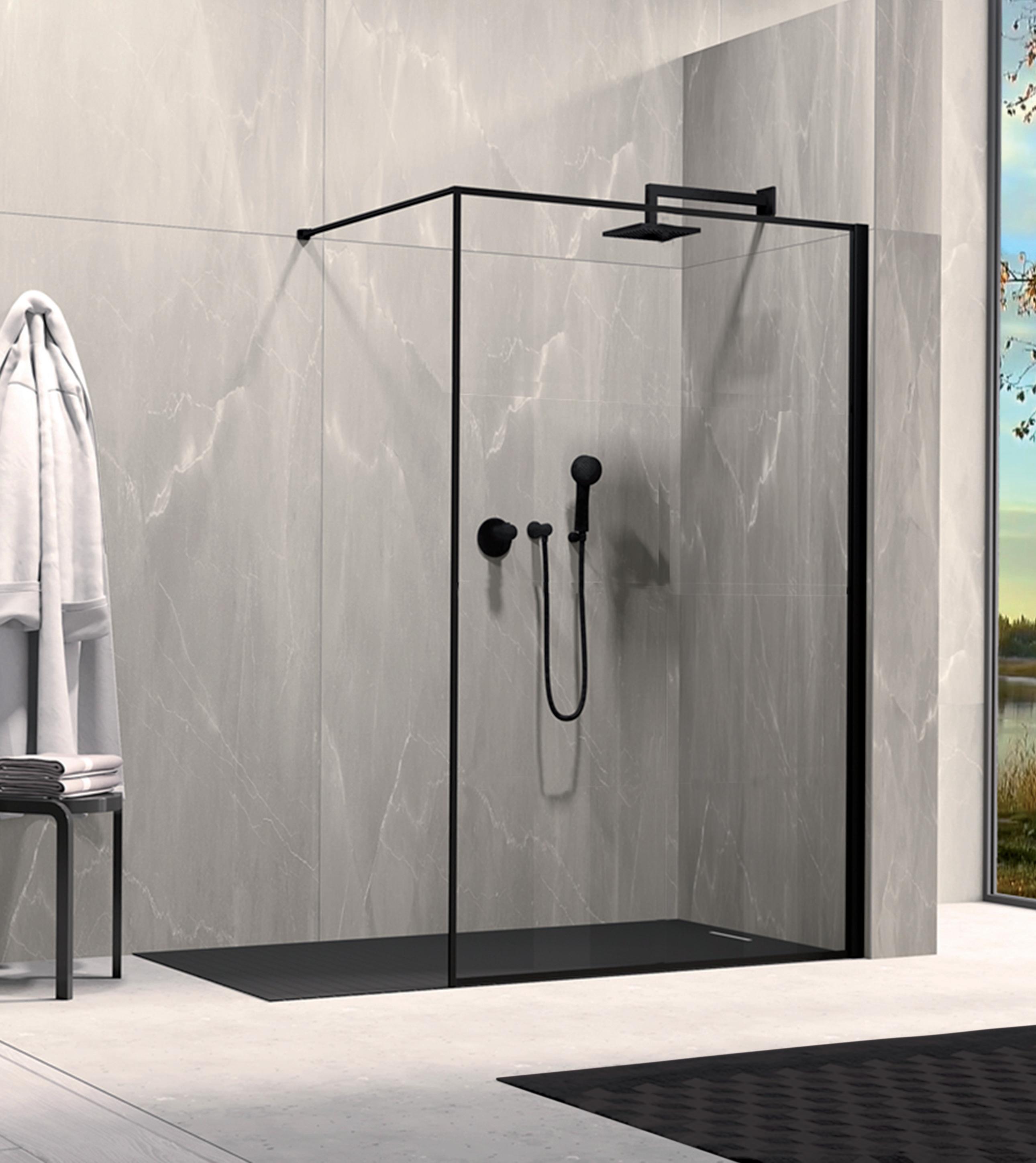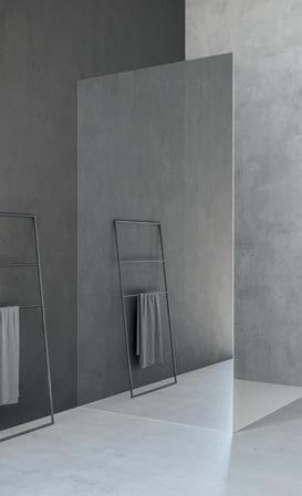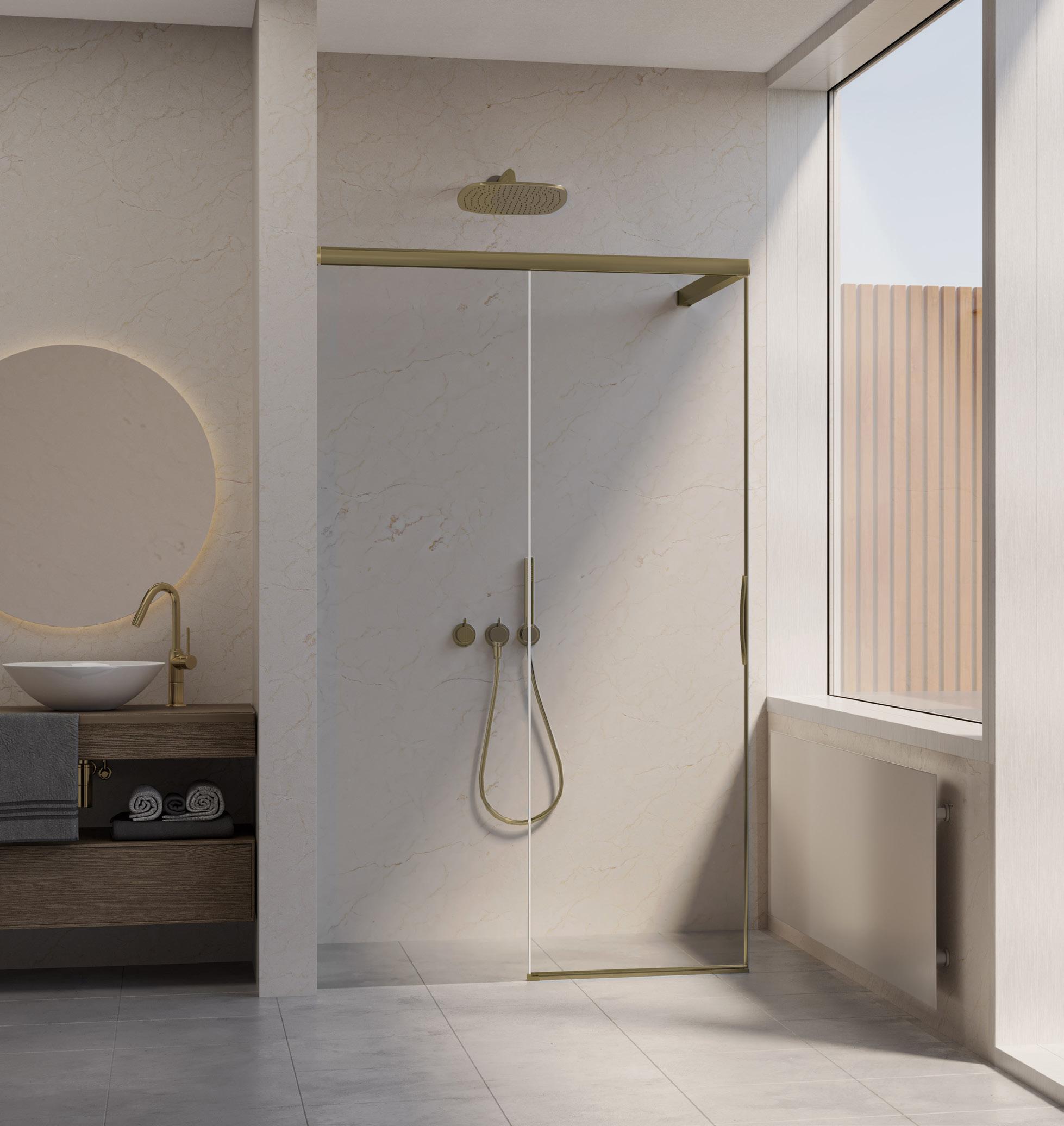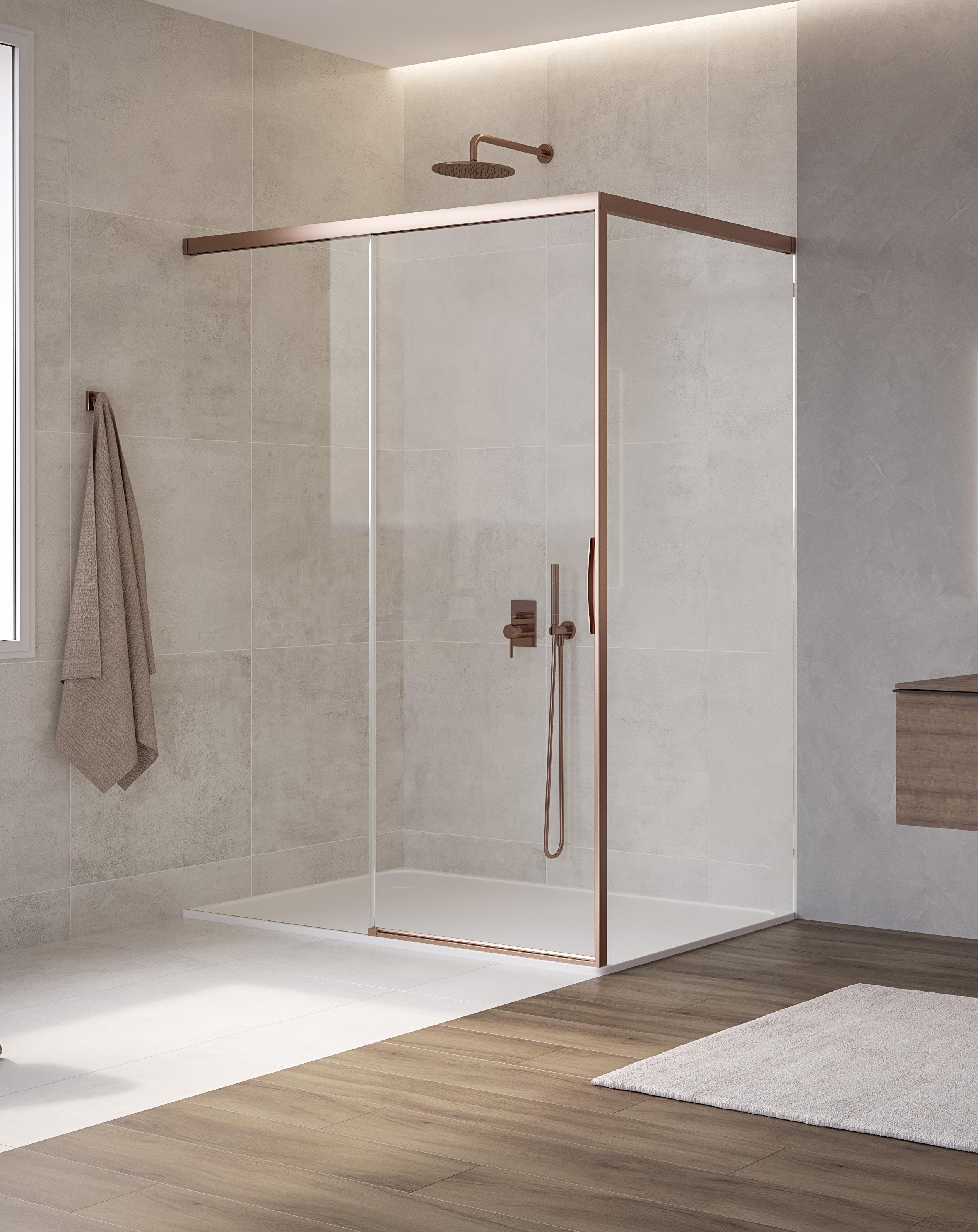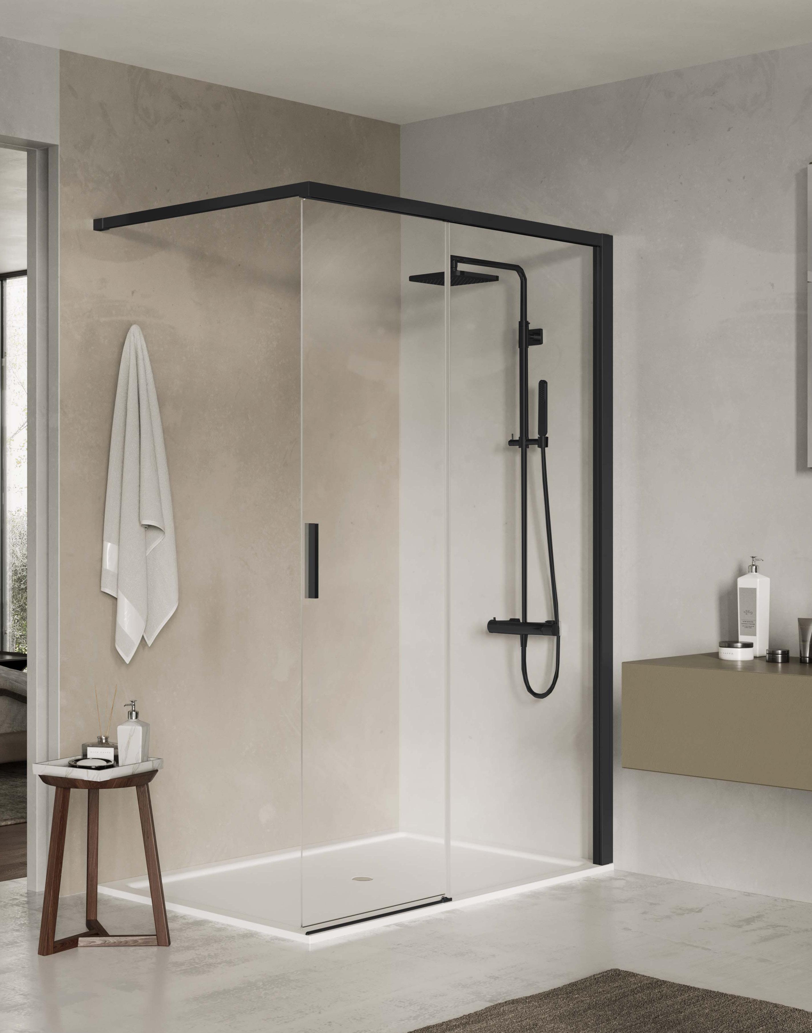 La regolazione a parete di 25 mm degli elementi fissi e laterali avviene grazie alla regolazione lineare del vetro temperato nel “profilo a muro”.