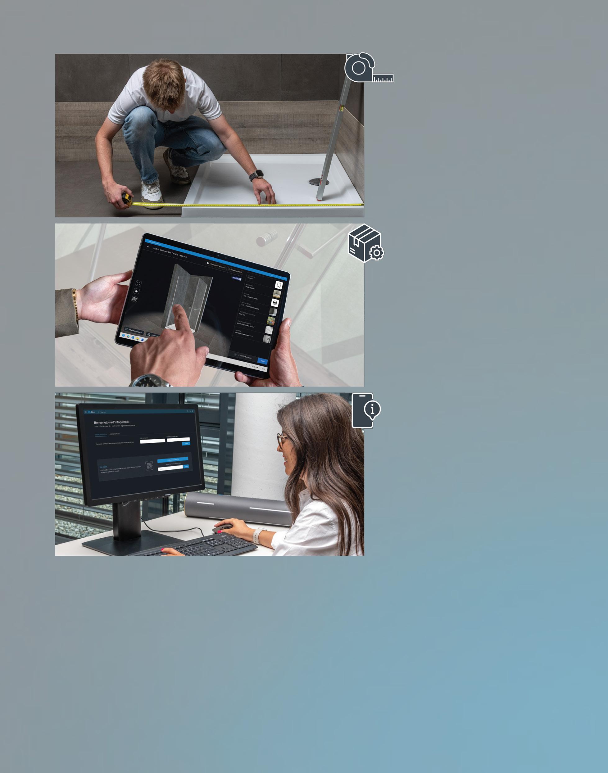 Duka Digital, la nuova piattaforma digitale di Duka, consente di documentare le misure in modo più rapido e semplice che mai. Con pochi clic, le misure richieste possono essere inserite in modo intuitivo utilizzando modelli autoesplicativi. In questo modo si risparmia tempo prezioso e si riducono al minimo i possibili errori. Ma non è tutto, perché con Duka Digital viene presentato per la prima volta anche un innovativo configuratore di prodotti, in grado di mostrare tutti i prodotti nelle loro forme più diverse con una suggestiva rappresentazione in 3D. Qui si ha la possibilità di configurare individualmente colori, vetri, maniglie e molto altro ancora per comporre la cabina doccia secondo i propri desideri. Che si tratti di uso privato, professionale, per uno showroom o per un cantiere, con Duka Digital sei perfettamente attrezzato e hai un‘ampia gamma di opzioni per creare la cabina doccia dei tuoi sogni. Lasciati ispirare dal futuro della presa misura e scopri i vantaggi di Duka Digital!