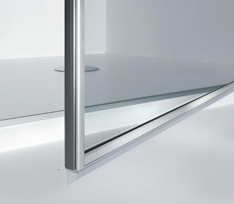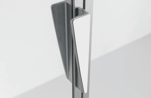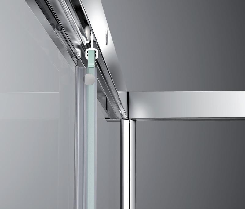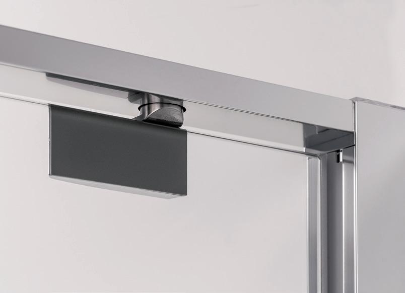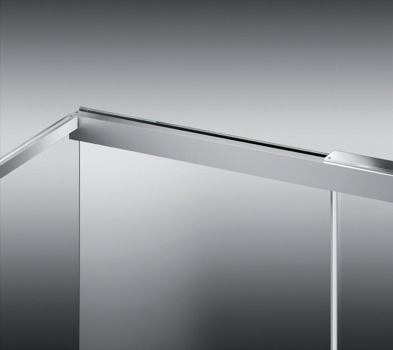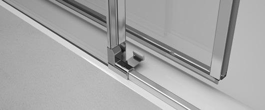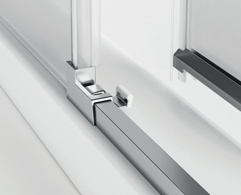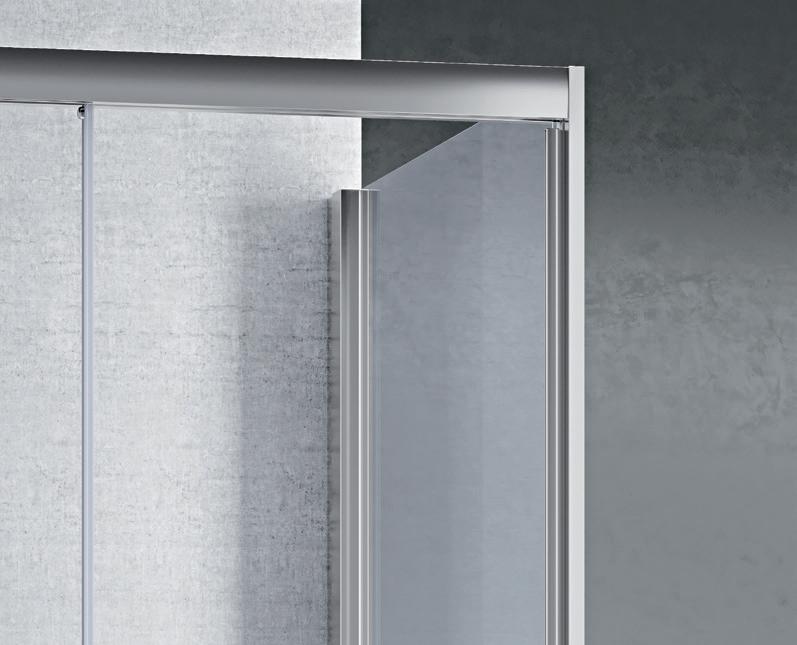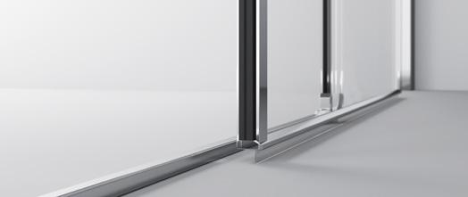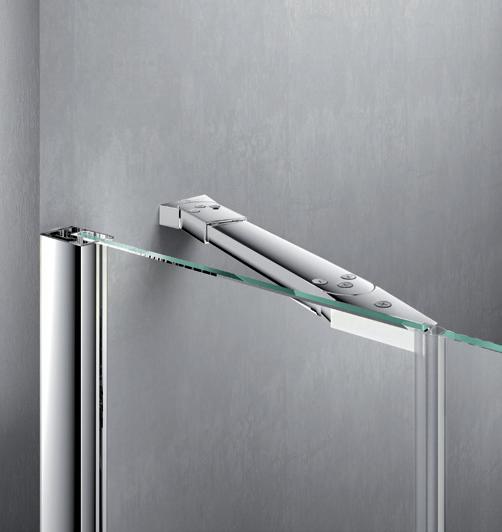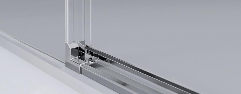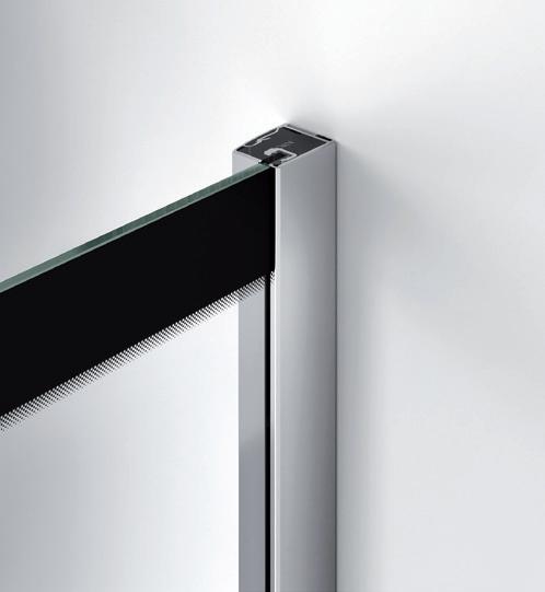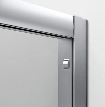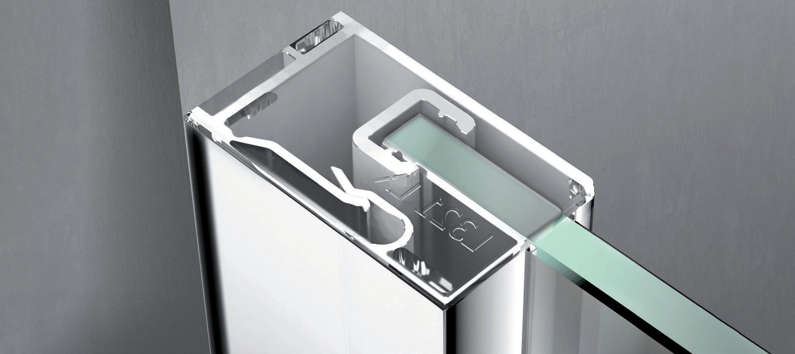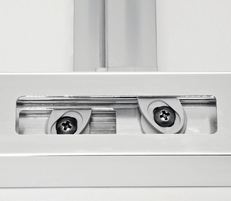 2 - Porte con regolazione integrata nel cristallo: la regolazione della larghezza delle cabine diventa un elemento di design! L’estensibilità di 25 mm degli elementi laterali e dei lati fissi avviene tramite il cristallo regolabile, inserito sotto il profilo.Il grande vantaggio è di natura estetica, in quanto la larghezza e l’aspetto del profi lo di compensazione rimangono invariati senza rinunciare all’estensibilità.