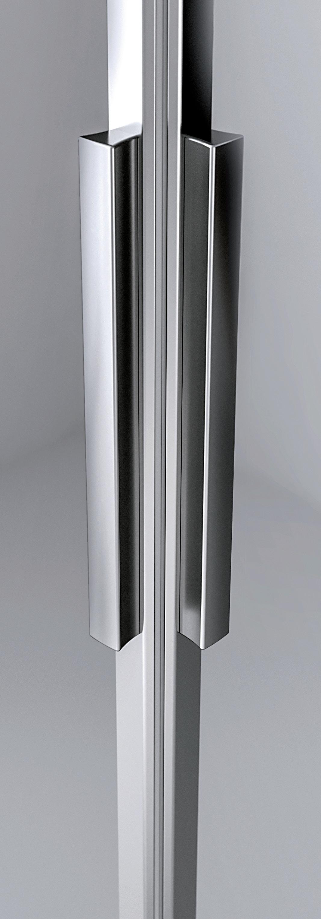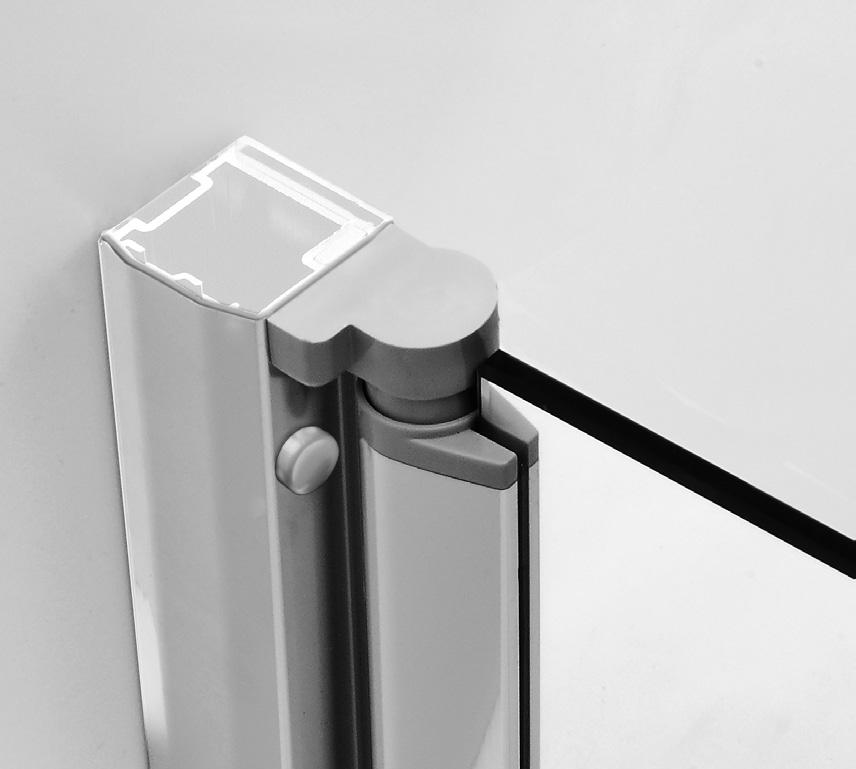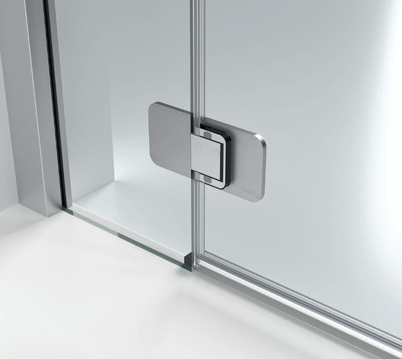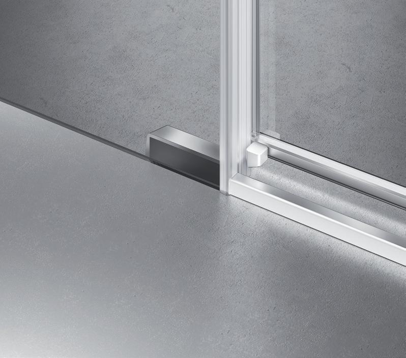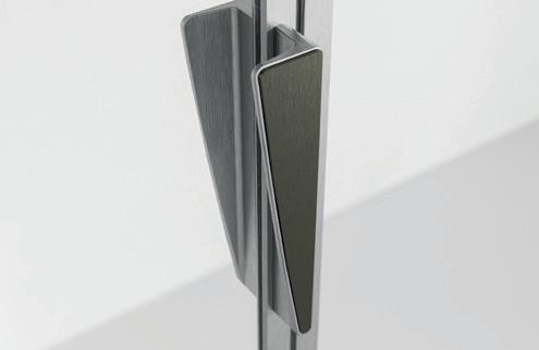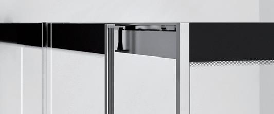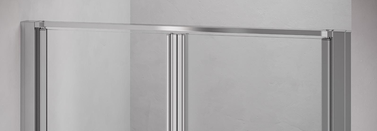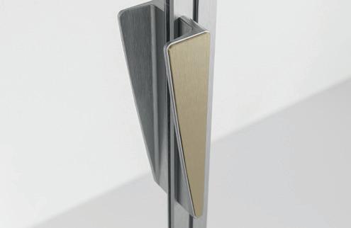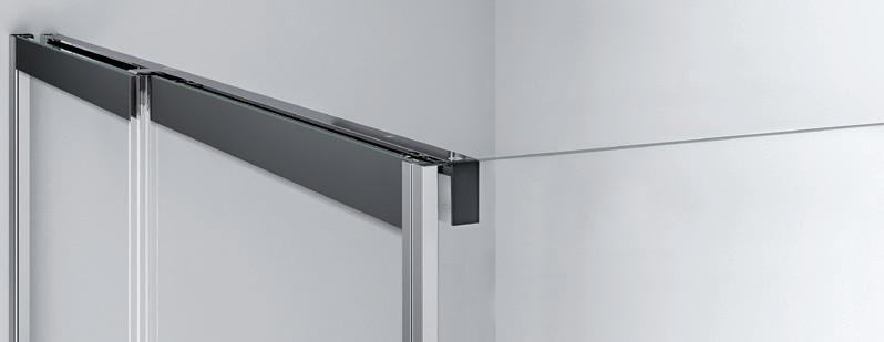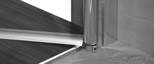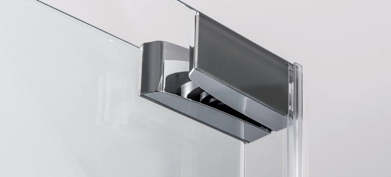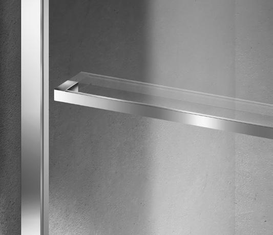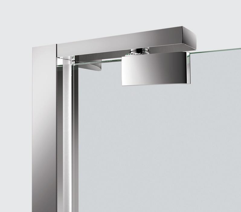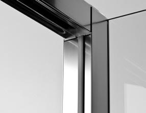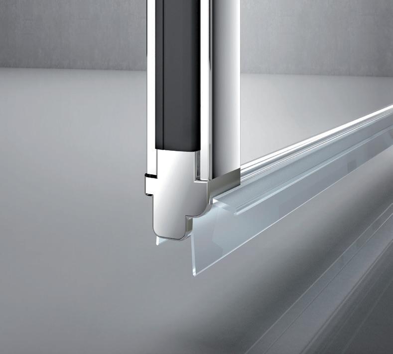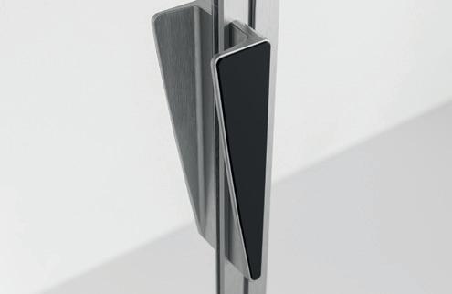 2 - Porte con regolazione integrata nel cristallo: la regolazione della larghezza delle cabine diventa un elemento di design! L’estensibilità di 25 mm degli elementi laterali e dei lati fissi avviene tramite il cristallo regolabile, inserito sotto il profilo.Il grande vantaggio è di natura estetica, in quanto la larghezza e l’aspetto del profi lo di compensazione rimangono invariati senza rinunciare all’estensibilità.