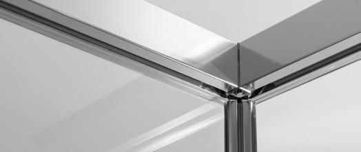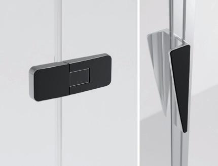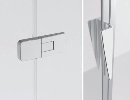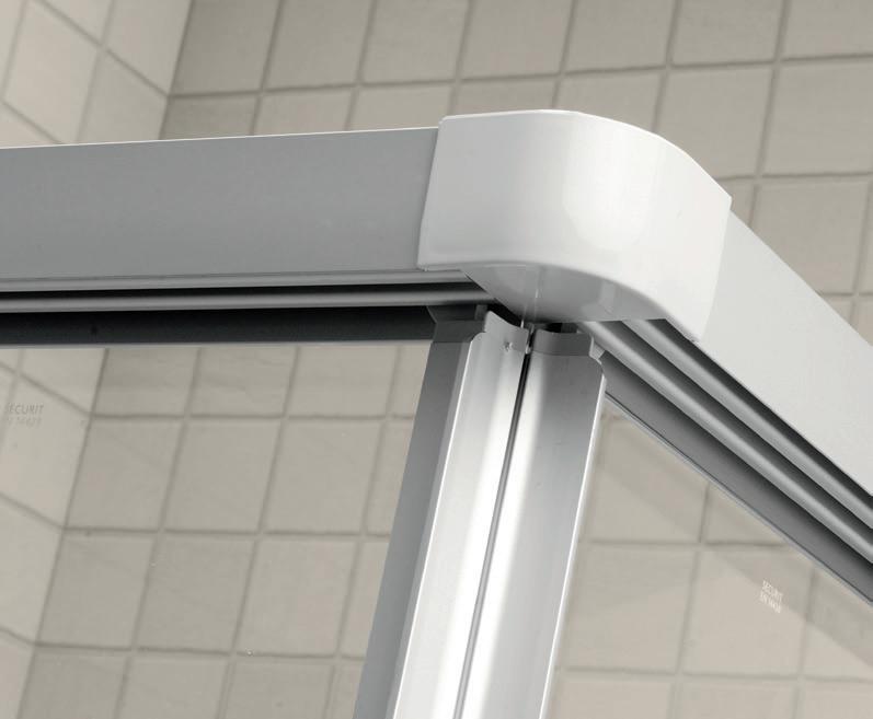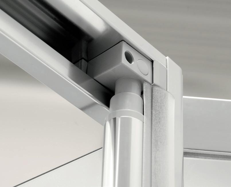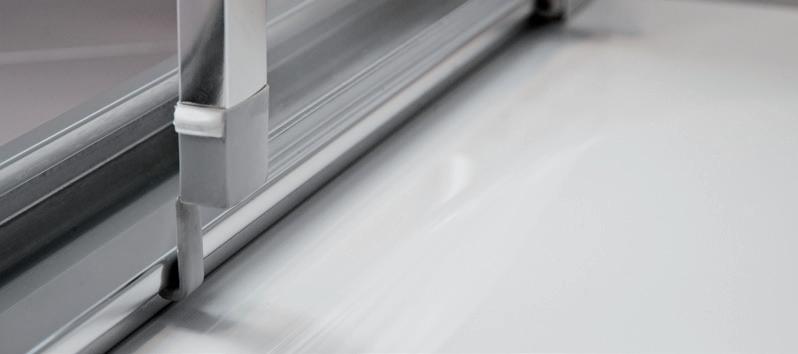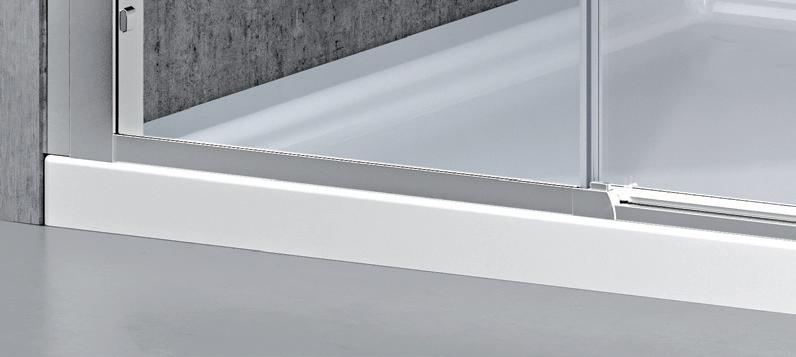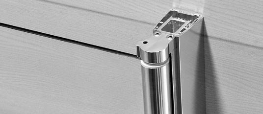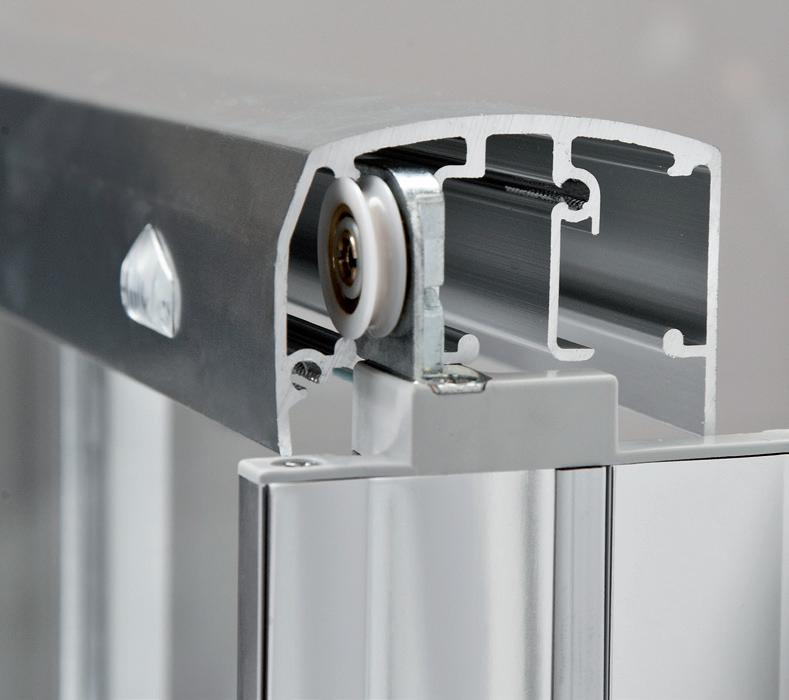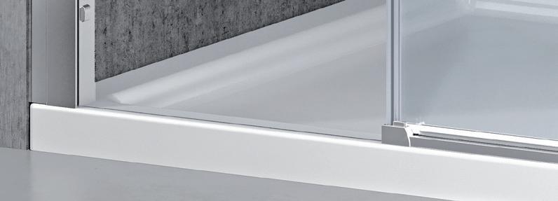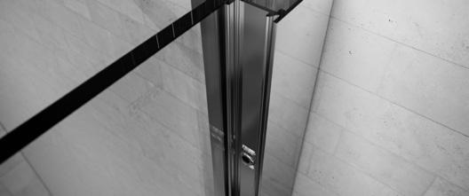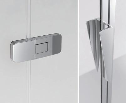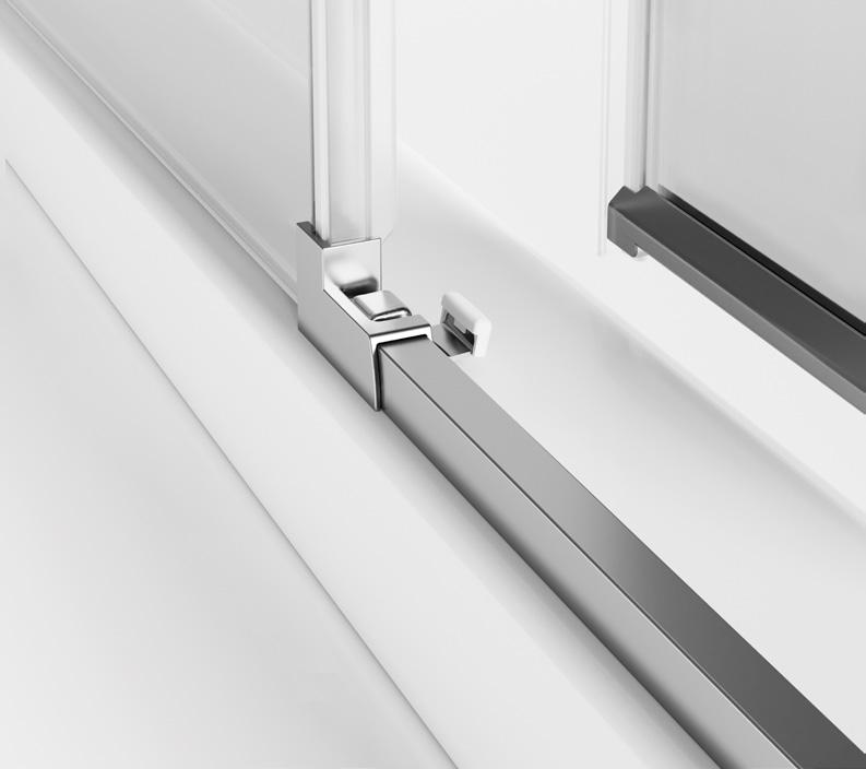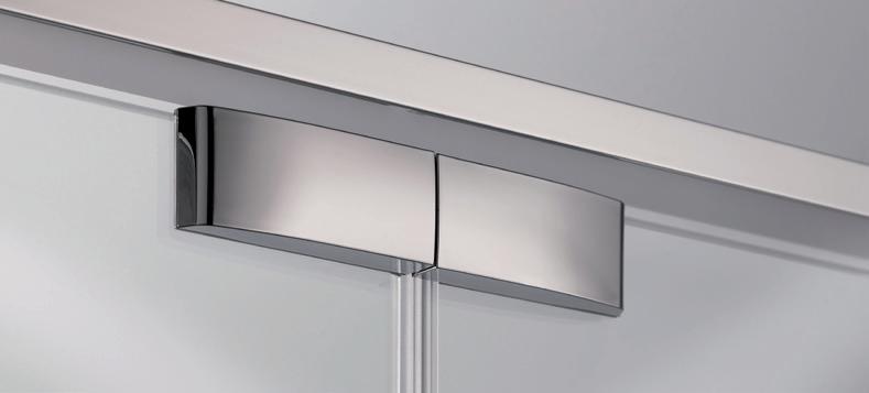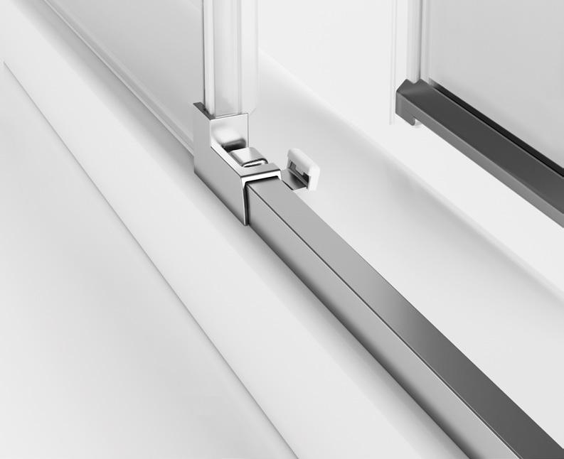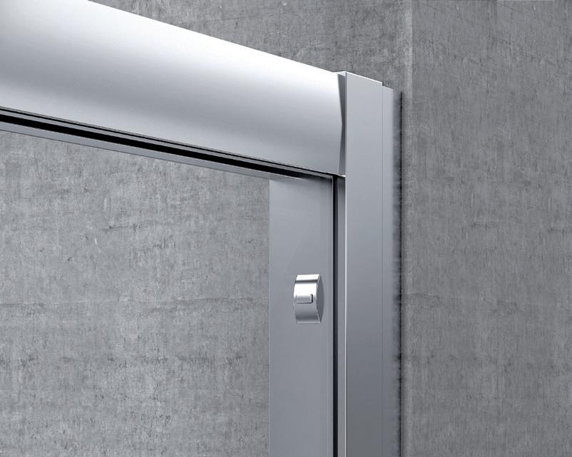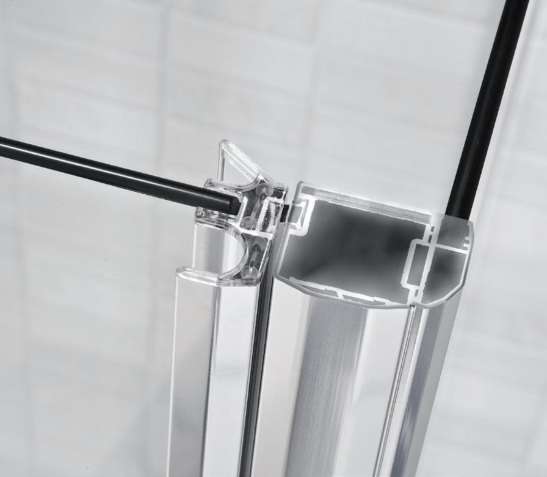 2 - Porte con regolazione integrata nel cristallo: la regolazione della larghezza delle cabine diventa un elemento di design! L’estensibilità di 25 mm degli elementi laterali e dei lati fissi avviene tramite il cristallo regolabile, inserito sotto il profilo.Il grande vantaggio è di natura estetica, in quanto la larghezza e l’aspetto del profi lo di compensazione rimangono invariati senza rinunciare all’estensibilità.