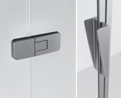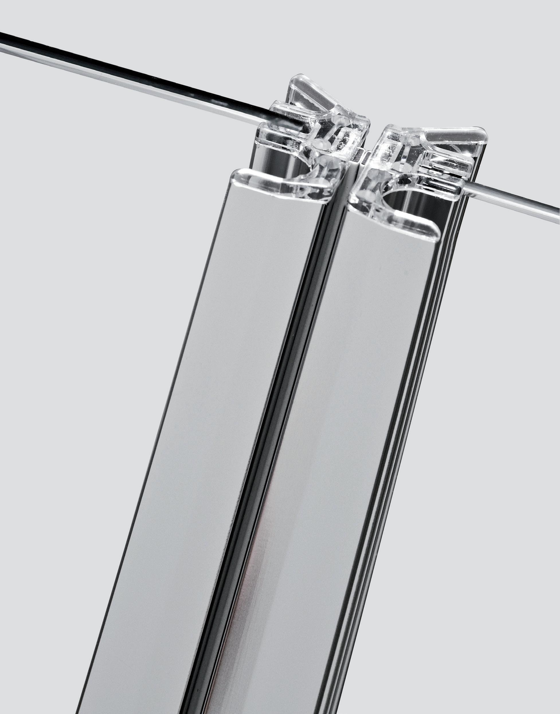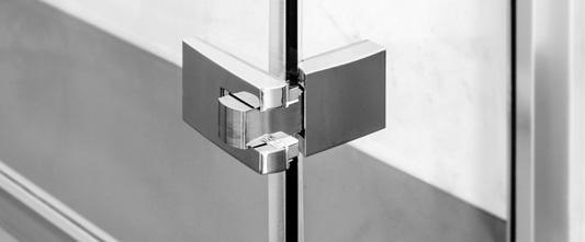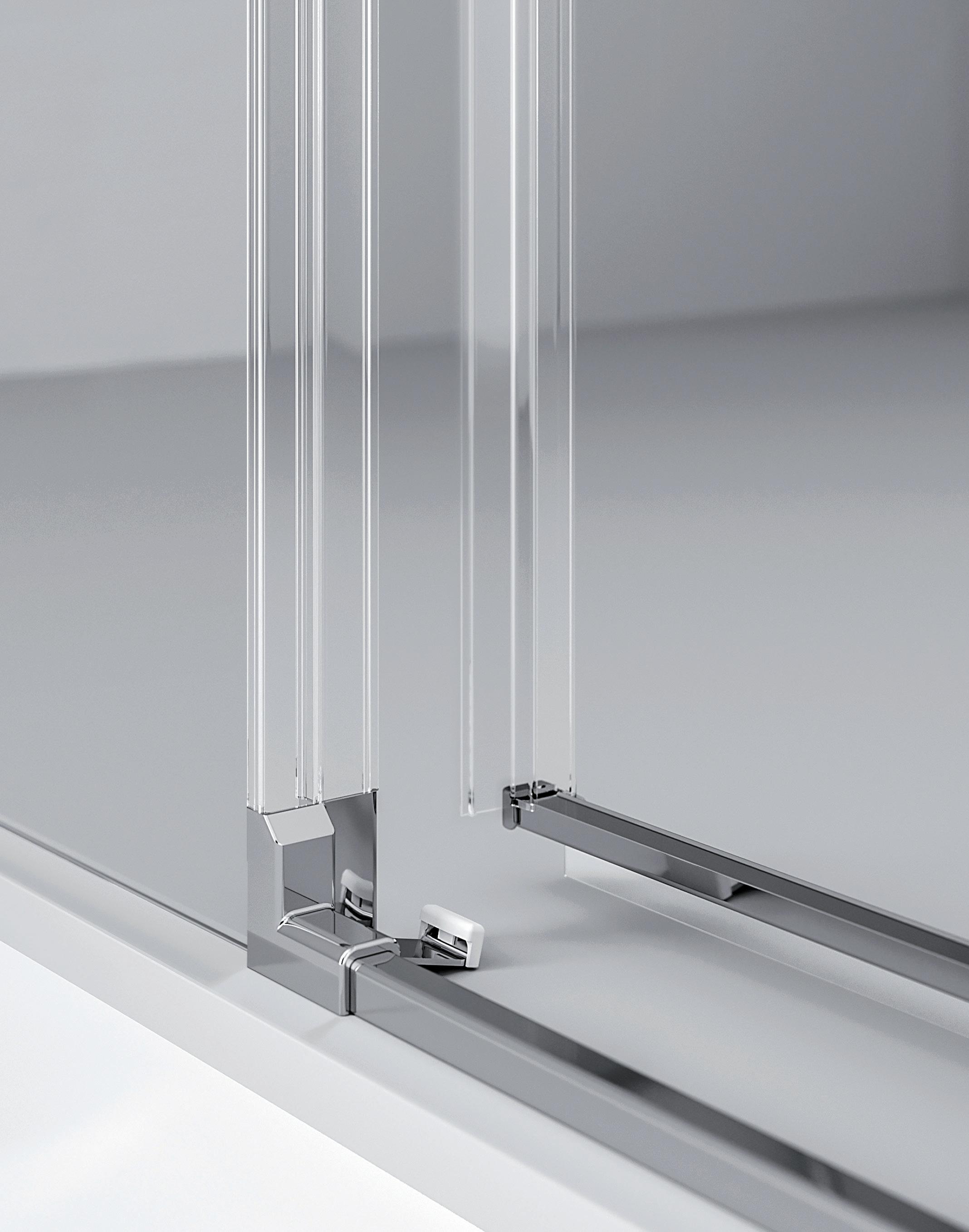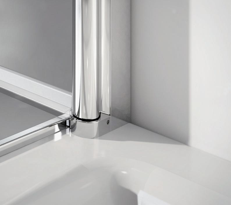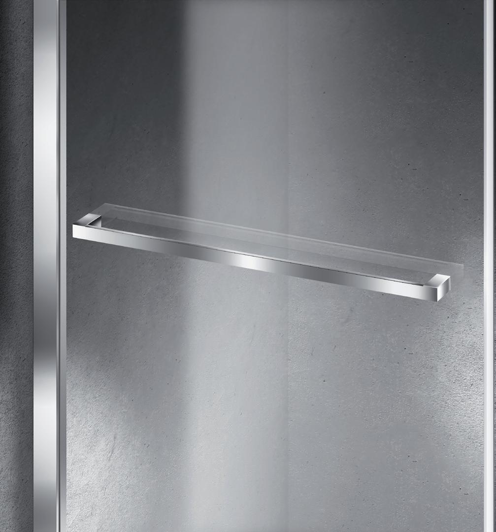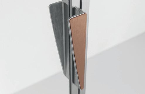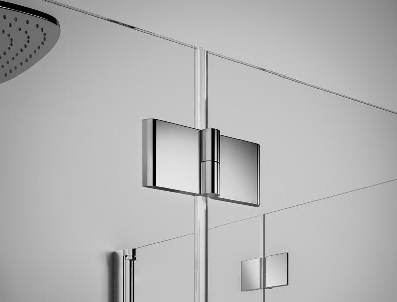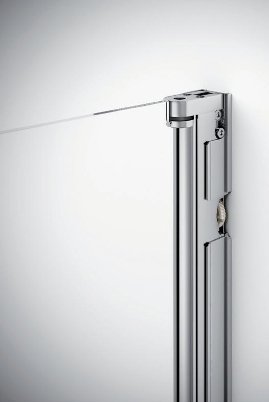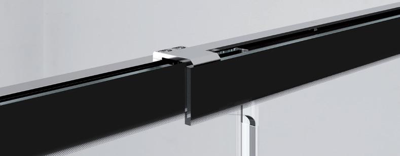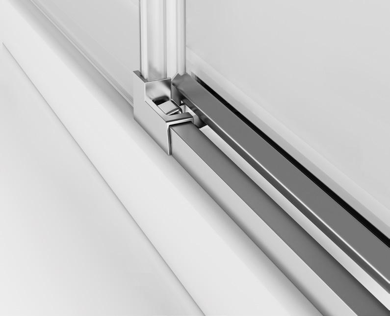 2 - Porte con regolazione integrata nel cristallo: la regolazione della larghezza delle cabine diventa un elemento di design! L’estensibilità di 25 mm degli elementi laterali e dei lati fissi avviene tramite il cristallo regolabile, inserito sotto il profilo.Il grande vantaggio è di natura estetica, in quanto la larghezza e l’aspetto del profi lo di compensazione rimangono invariati senza rinunciare all’estensibilità.