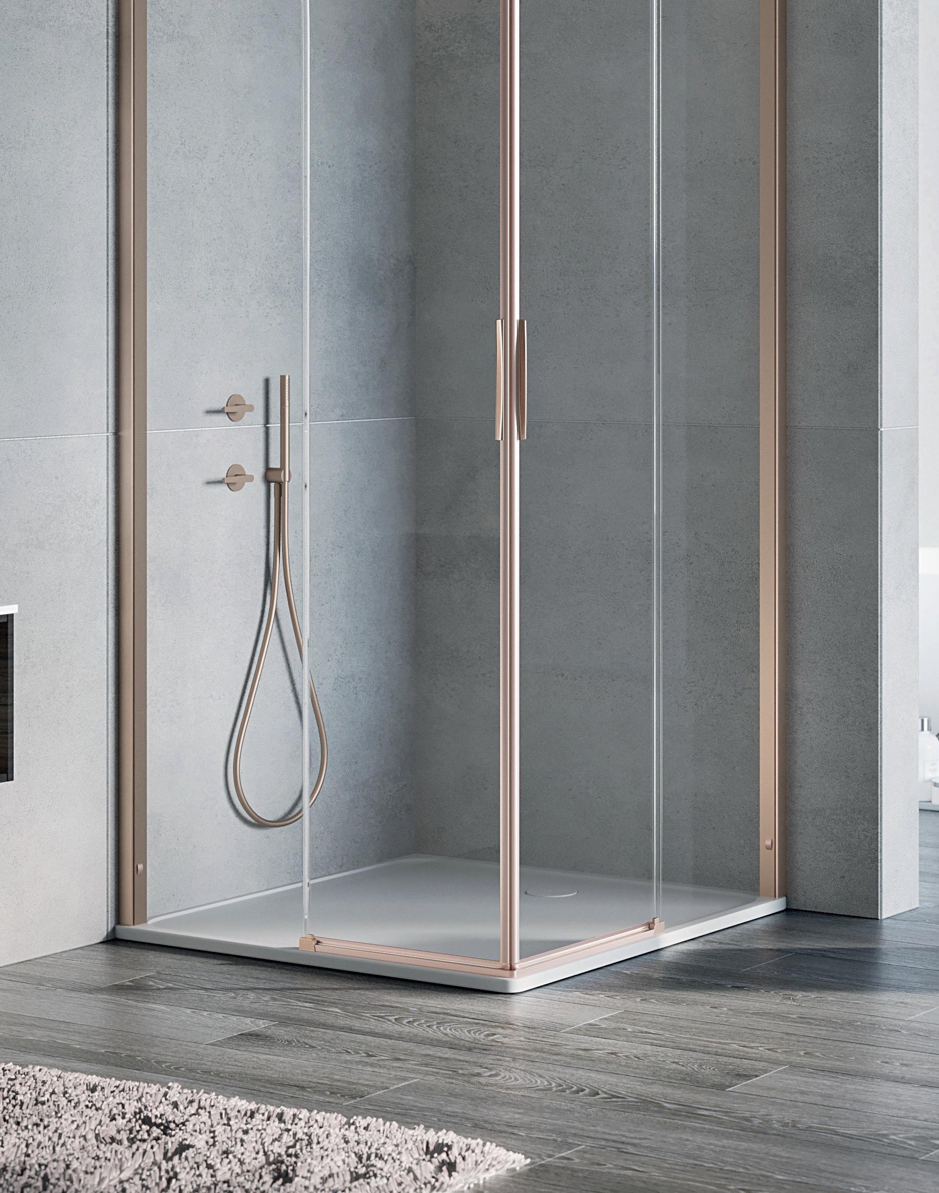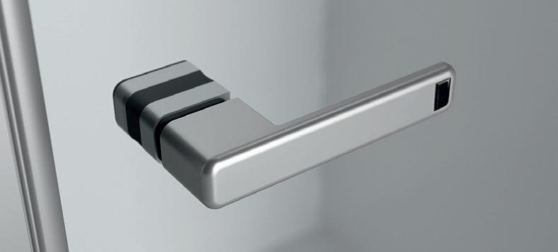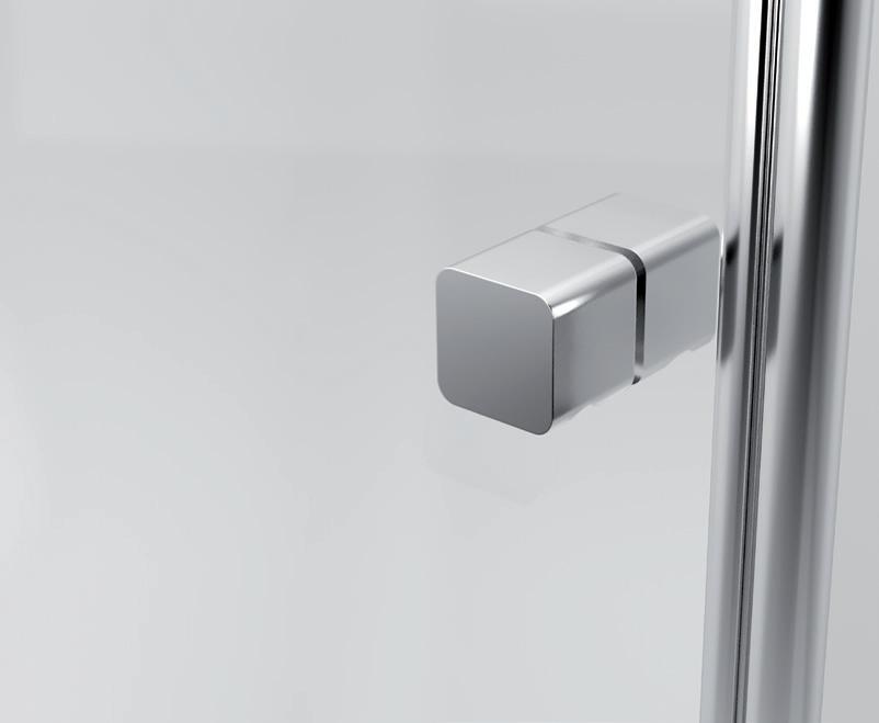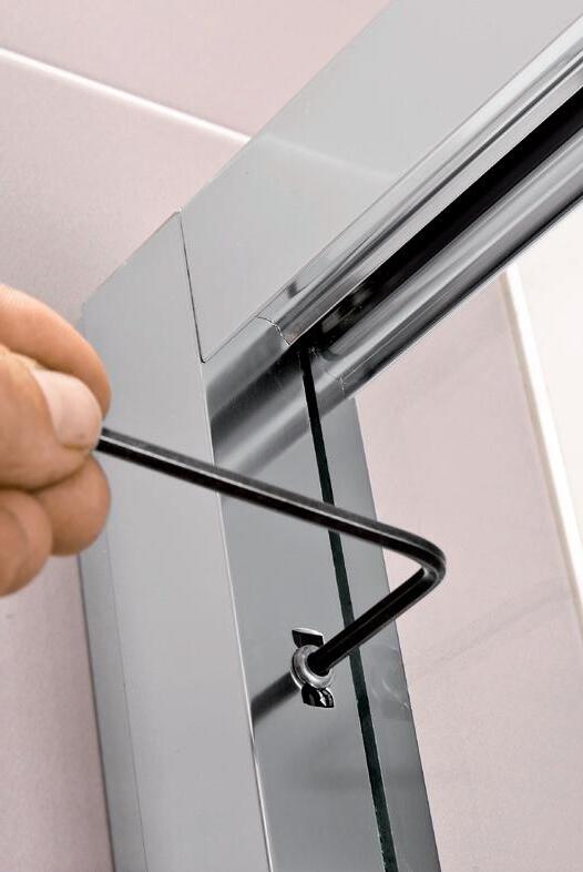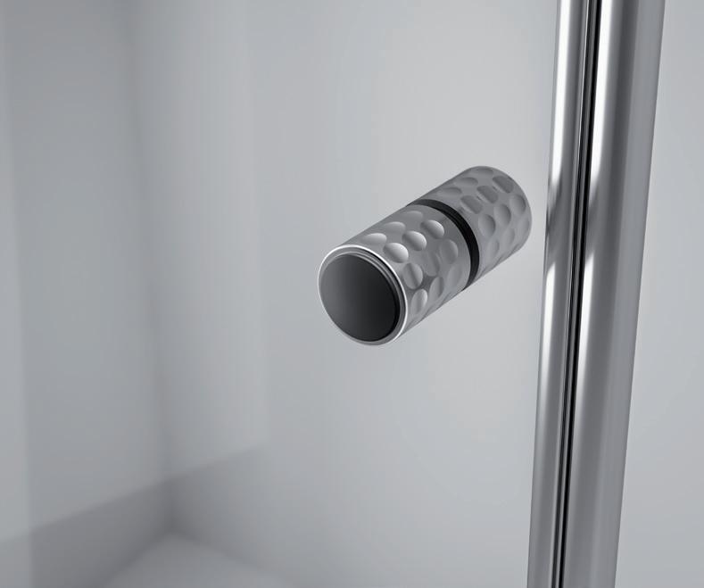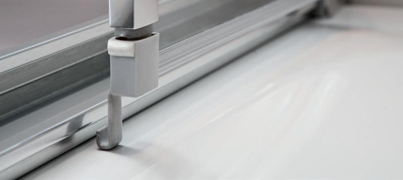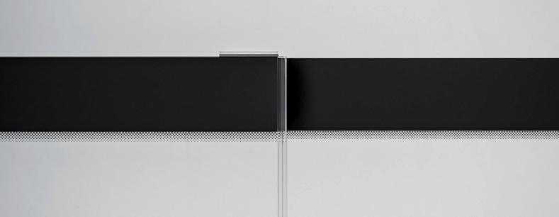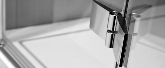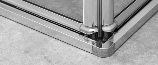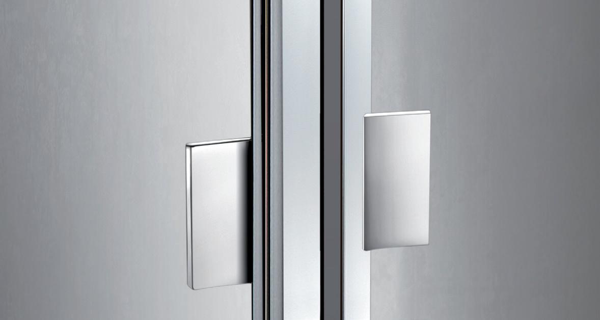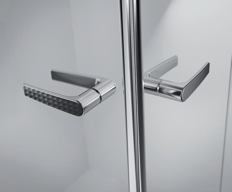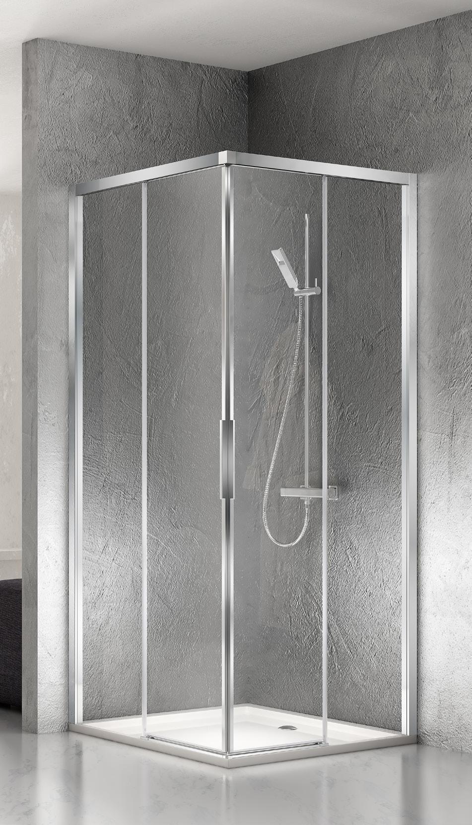 2 - Porte con regolazione integrata nel cristallo: la regolazione della larghezza delle cabine diventa un elemento di design! L’estensibilità di 25 mm degli elementi laterali e dei lati fissi avviene tramite il cristallo regolabile, inserito sotto il profilo.Il grande vantaggio è di natura estetica, in quanto la larghezza e l’aspetto del profi lo di compensazione rimangono invariati senza rinunciare all’estensibilità.