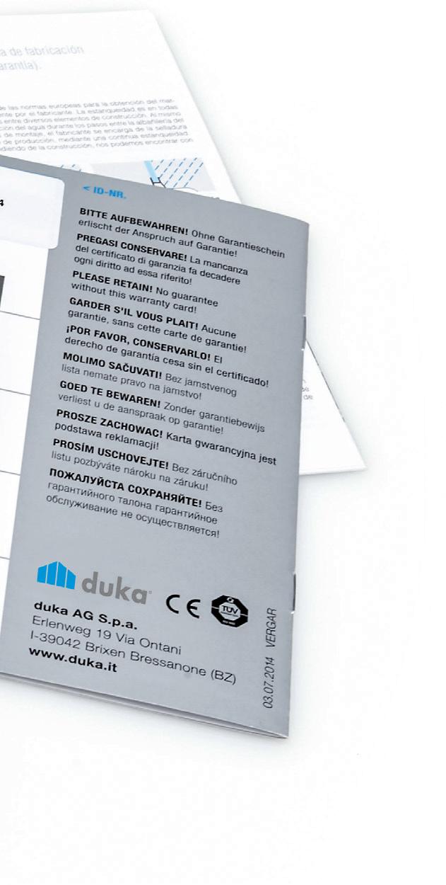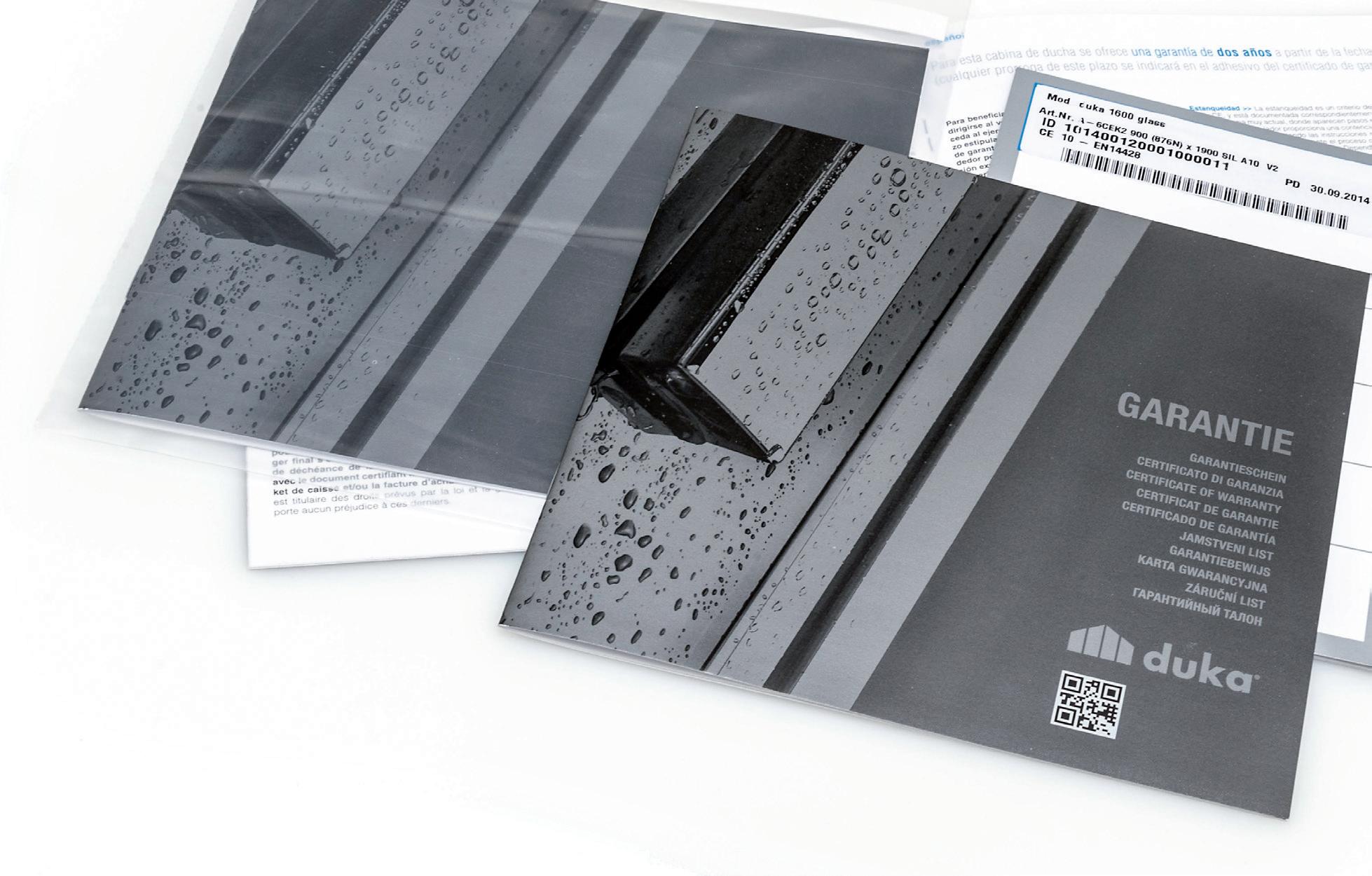 La cabina doccia Duka è coperta da garanzia convenzionale, come viene spiegato nel tagliando di garanzia, presente nell’imballo. Sul retro del tagliando si trova un numero di identificazione (ID) che conferma l’autenticità del prodotto duka e permette all’azienda di rintracciare sempre la cabina in tutto il suo percorso, dall’ordine alla consegna.