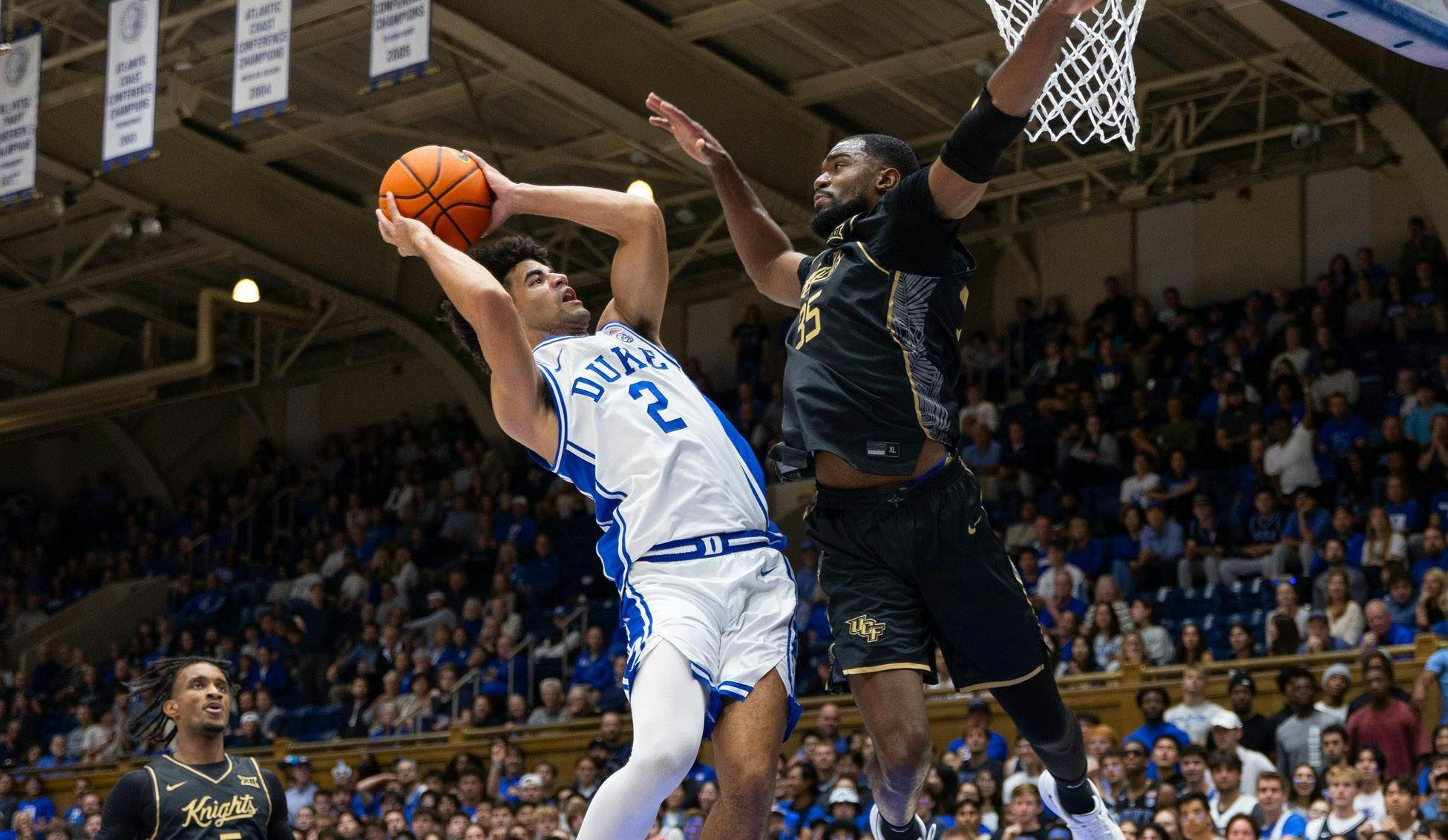 As Knights forward Jordan Burks elevated to attempt a layup, Evans raced to the paint and engulfed the shot entirely. In a flash, the guard was at the other end of the floor — converting the transition opportunity at full speed. With a little over nine minutes remaining in the contest, Harris cut across the floor and found an unguarded Nikolas Khamenia in the right corner. The freshman, unbothered by his 0-for-4 line from deep, sent the ball through the net to become the fourth Duke player in double-digit scoring.