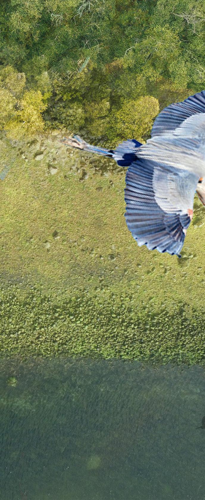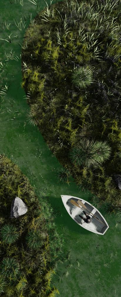 Across the waters from the river settlement, Sarai paddles to the floating wetlands. She often comes here to view her friend Malo, the heron who stewards the wetlands.