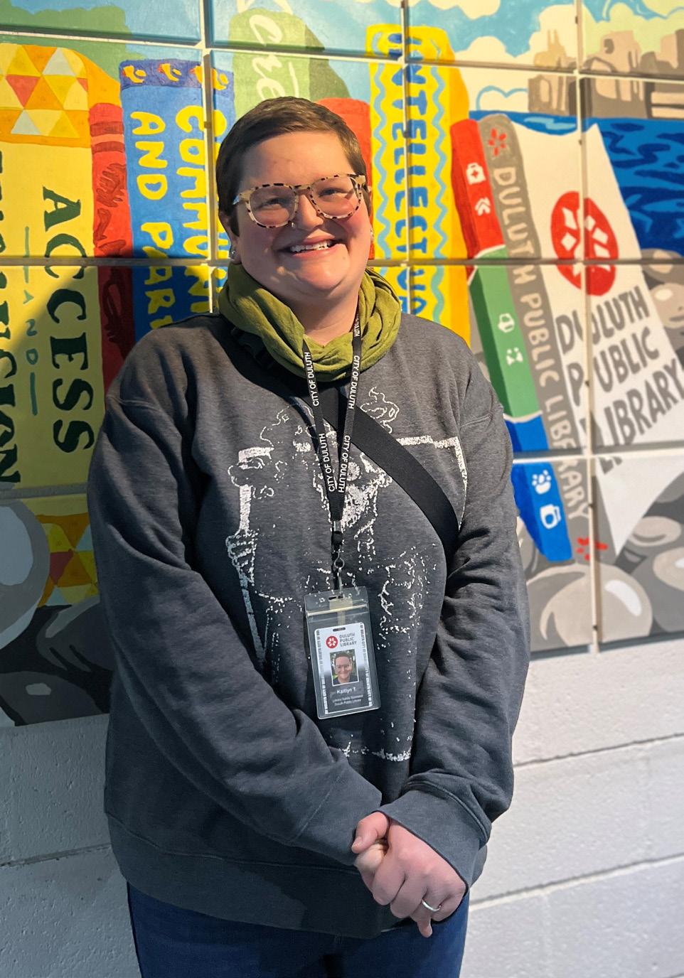 Meet the Duluth Public Library’s Safety Specialist, Kaitlyn! Kaitlyn has been working at the Main Library since September 2022. Kaitlyn holds a Masters degree in Social Work, is a Licensed Social Worker, and has worked in group homes, taught music to young people, and has worked as a therapist, among several other things. Her various skills, experiences, and jobs held over the years have all gone into preparing Kaitlyn for her current position. “This is the job I was made to do,” she says with a smile. The role of Safety Specialist is a new one, created in a months-long process to ensure that the library is a safe space for all who come through our doors, whether they are using the library to check out books or as a space to relax and take a break from cold weather. Adding Kaitlyn to the staff is part of the library’s ongoing effort to ask questions about and expand the concept of what is deemed appropriate library use. As she puts it: “The majority of my work is connecting people with resources and building relationships with patrons, library staff, and other people in the community doing work that overlaps with mine.” She adds: “I like to approach my work with a whole-person perspective.” She can most often be found strolling the library, inside and out, striking up conversations and greeting many people by name.
