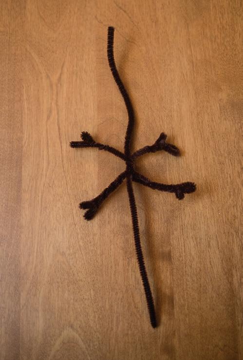 1. Start by twisting the middle of three pipe cleaners together as shown in the picture. Using four of the six ends, form two feet and two hands. You can do this by folding each limb in half, bending back the ends toward the body, using the bend as the feet and hands. Twist one of the last unused ends into a tail and the other into a nub in order to place the monkey’s head.