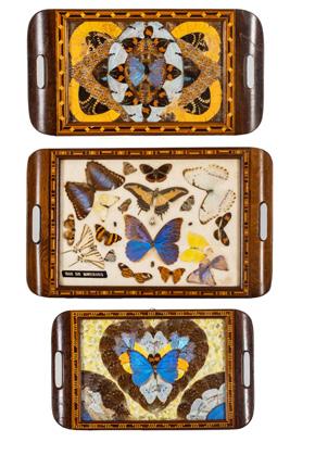 Butterfly Taxidermy In Carved Wood Inlay Tea Trays Group Of Three, W 9.25”-11.25” L 17”-18” $75 - $150