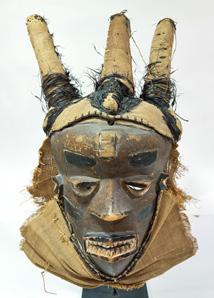 Pende Peoples, Democratic Republic Of Congo, Carved Wood, Polychrome, Fiber, And Rafia Headdress, H 20”, W 9”, D 7”