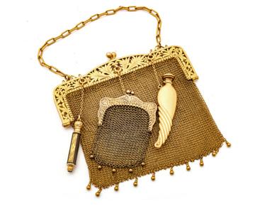 14K Mesh Chainmail Evening Bag, Chatelaine Scent Bottle, Coin Purse, Pencil Pat, 1872, H 5” W 5” 171g