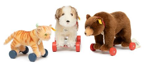 Steiff Mohair Stuffed Animals: Abby Katze, Molly Hund, Bar Rader, H 10” L 10”
