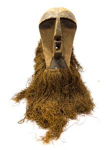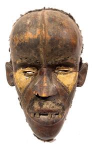 Suku Peoples, Democratic Republic Of Congo, Polychromed Carved Wood And Raffia Helmet Mask (Hemba) H 17”, W 10”