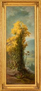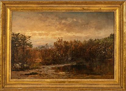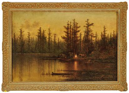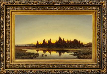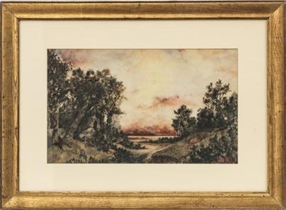 Watercolor On Paper, Ca. 1900-1920, Sunset On A Forest Lake, H 12” W 20”