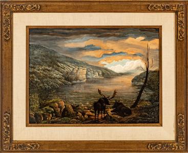 Primitive Oil On Canvas, Ca. 19th Century, Moose Resting By A Moonlit Lake., H 18” W 24”