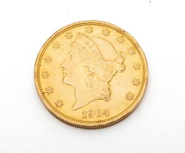 1904-S U.S. $20 Liberty Head Double Eagle Gold Coin, Dia. 1.25” 33g