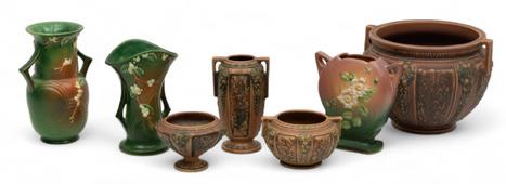Roseville Pottery (American) Jardinere & Vases, 20th C., H 9.25” Dia. 12” 7 pcs