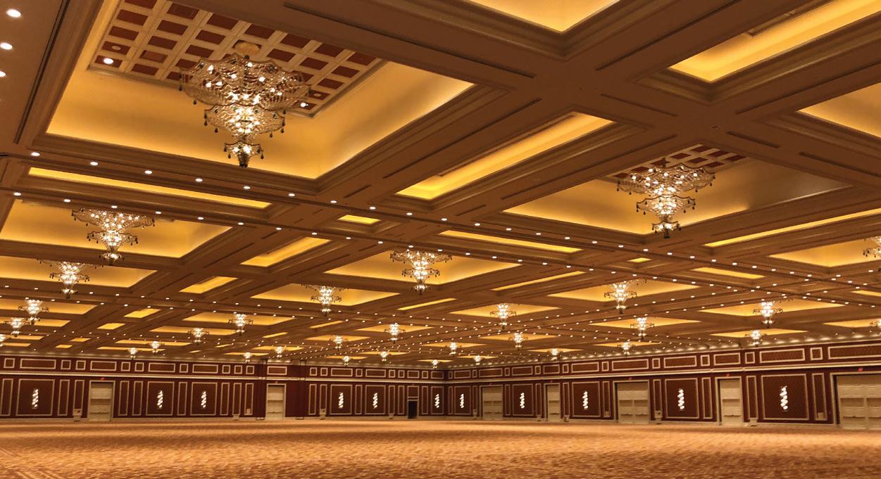 Nuestros márgenes de tiempo para la logística eran ajustados, pero durante el proyecto y con entregas a más de 100 lugares de trabajo, incluidos algunos fines de semana, recibimos más de 12 000 galones de producto e innumerables artículos diversos. Este proyecto de ampliación de 430 000 ft2 incluyó salas para reuniones, salones de baile, espacios para reuniones previas, un paseo peatonal y más, algunos de ellos con paredes de 45'. KHS&S terminó todo el proyecto con productos Dunn-Edwards. Empezaron con el imprimante ULTRA-GRIP ® Select para interiores, que terminó siendo ideal para el sr. Kephart, ya que es un imprimante para múltiples superficies, y trabajaron en varios sustratos que incluyeron paneles de yeso, trabajos de carpintería y yeso reforzado con fibra de vidrio (GRFG, por sus siglas en inglés). Además, Kephart agregó que fue bueno usar una capa continua de imprimante sobre la que se aplican las capas finales.