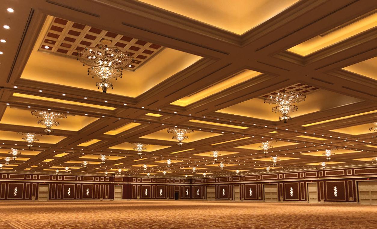 This 430,000-sq.-ft. expansion project consisted of meeting rooms, ballrooms, premeeting spaces, a promenade and more, some with 45' walls. KHS&S completed the entire project using Dunn-Edwards products, starting with ULTRA-GRIP Select primer for the interior, which Kephart said ended up being ideal, as it’s a multisurface primer and they were working on a variety of substrates including drywall, GRFG and millwork. He added that it was nice to have a continuous skin of primer on which to apply the finish coats.