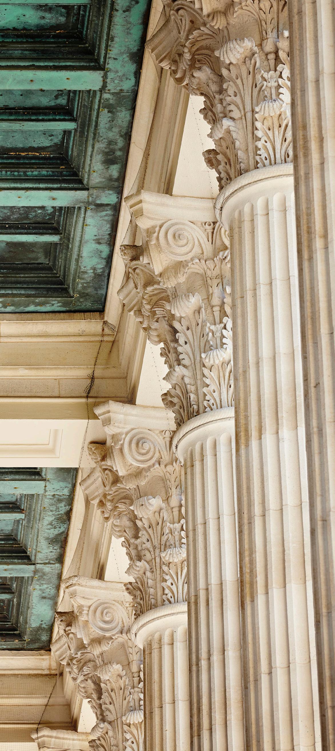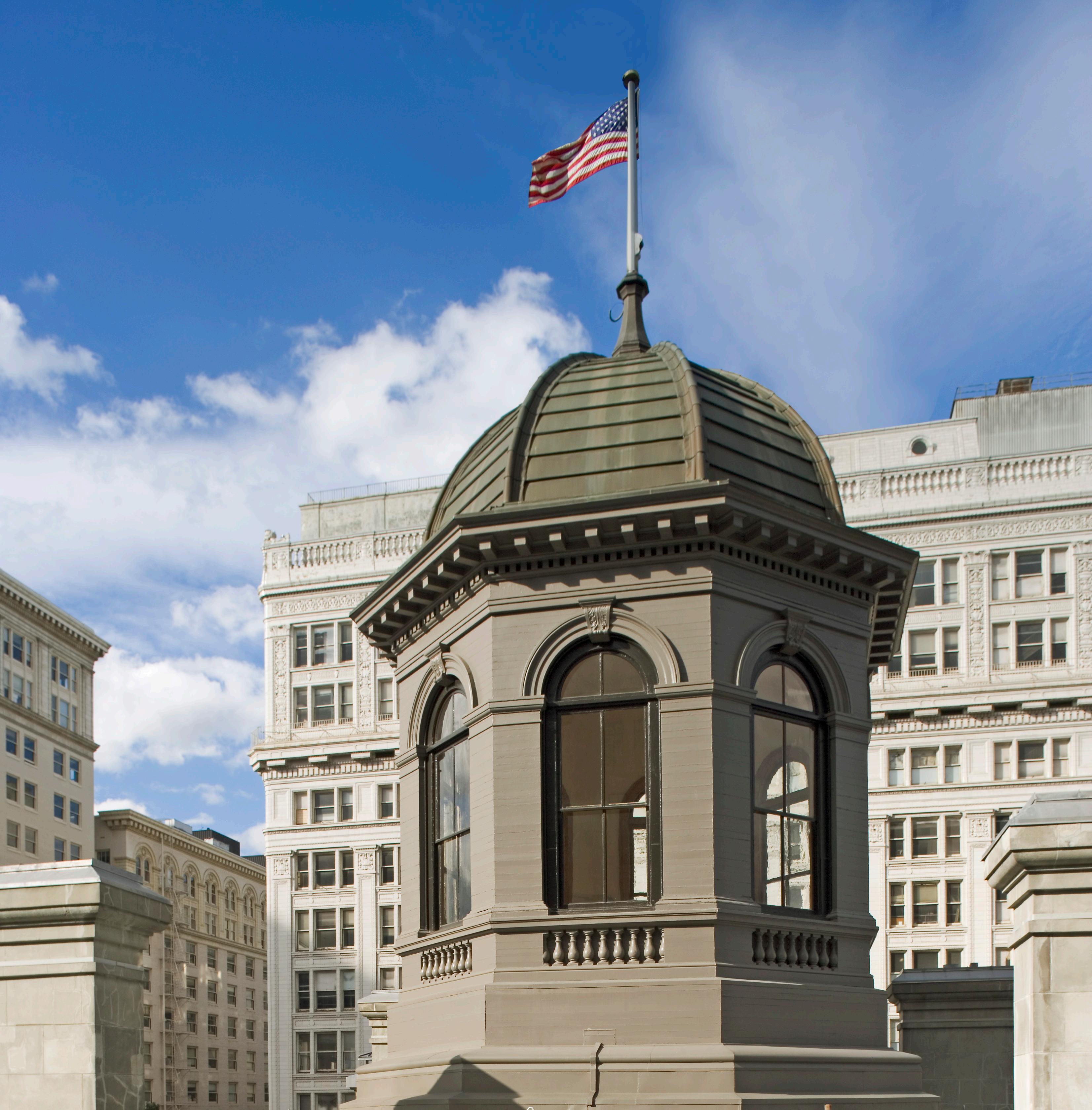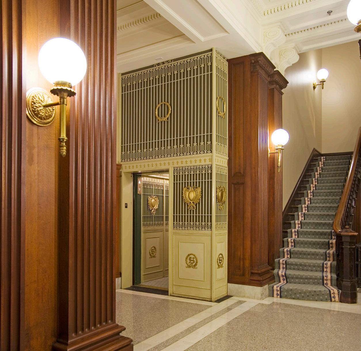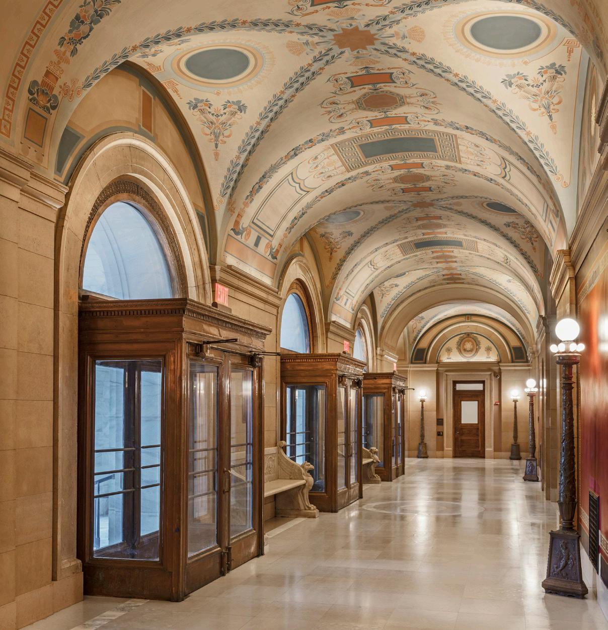 Separated into multiple carefully planned phases, a comprehensive restoration of the interior and exterior addressed the needs of restoration, life-safety, accessibility, asset preservation and long-term functionality. Key design features included reclaiming public spaces, raised ceiling heights, restoration of the vast decorative painting and fine art murals, new skylights/lay lights, and new historically-appropriate elevators. The work also included a complete overhaul of the mechanical, electrical and plumbing systems. The exterior work included exterior stone restoration, window replacement, and new roofing systems. The ornate stone work required several master carvers on site for several years. Unique aspects of the work involved finely-detailed copper roof detailing and restoration of the gold leaf gilded elements like the dome lantern finial and the famously large “Prosperity Charioteer,” which sits above the main entry.