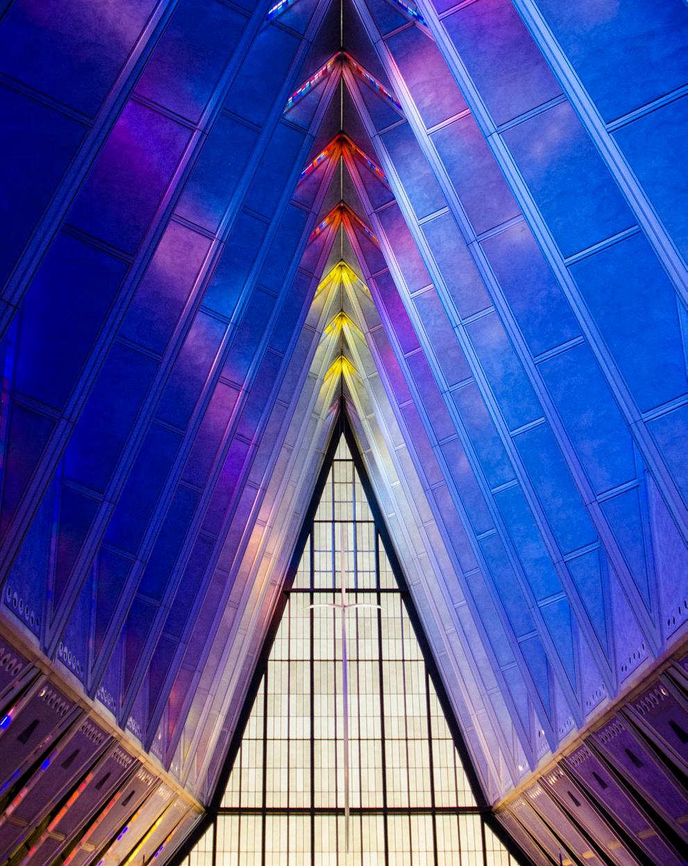 The 52,000 SF building is home to six worship spaces, a 1,950-pipe organ and a 4,518-pipe organ. The Chapel is 150 feet tall and is most known for its 17 metal spires or tetrahedrons, enclosed with aluminum panels and Dalles de Verre Glass. The building includes a Protestant chapel, a Catholic chapel, a Jewish synagogue, a Muslim mosque, a Buddhist temple, a Falcon Circle, and All Faiths rooms. JE Dunn Construction will construct an enclosed super structure over the chapel to protect the building from weather as they disassemble the structure for refurbishing.