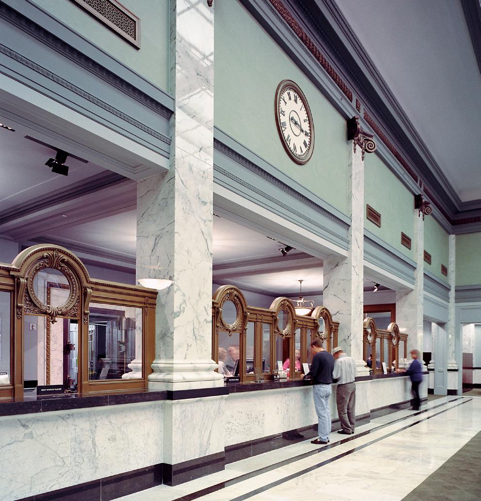 The renovation efforts were as much about preserving the rich heritage as providing structural upgrades for the copious volumes of books. Original features such as the teller windows, marble flooring, and chandeliers were restored and blend well with modern elements.