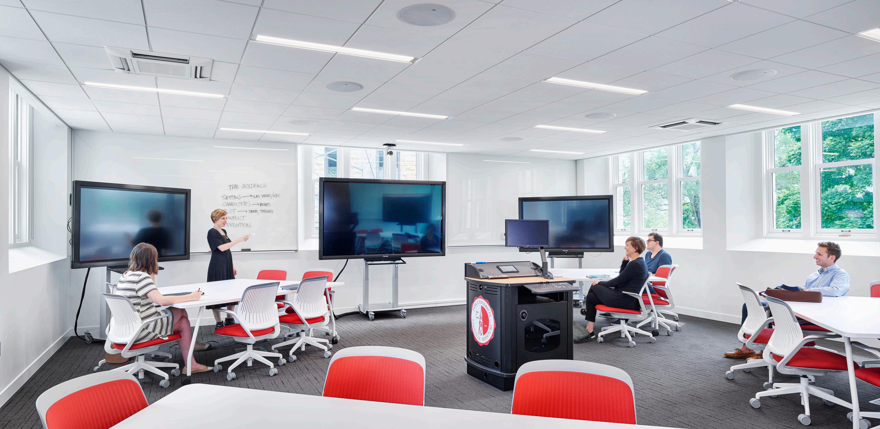 Each classroom provides an endless array of classroom organization and flexibility. Two decades of model classrooms research and development informed the innovative teaching spaces in this new “pedagogical incubator.” This research involved rigorous design exploration, workshops with furniture and technology manufacturers, and post occupancy ethnography and survey feedback.