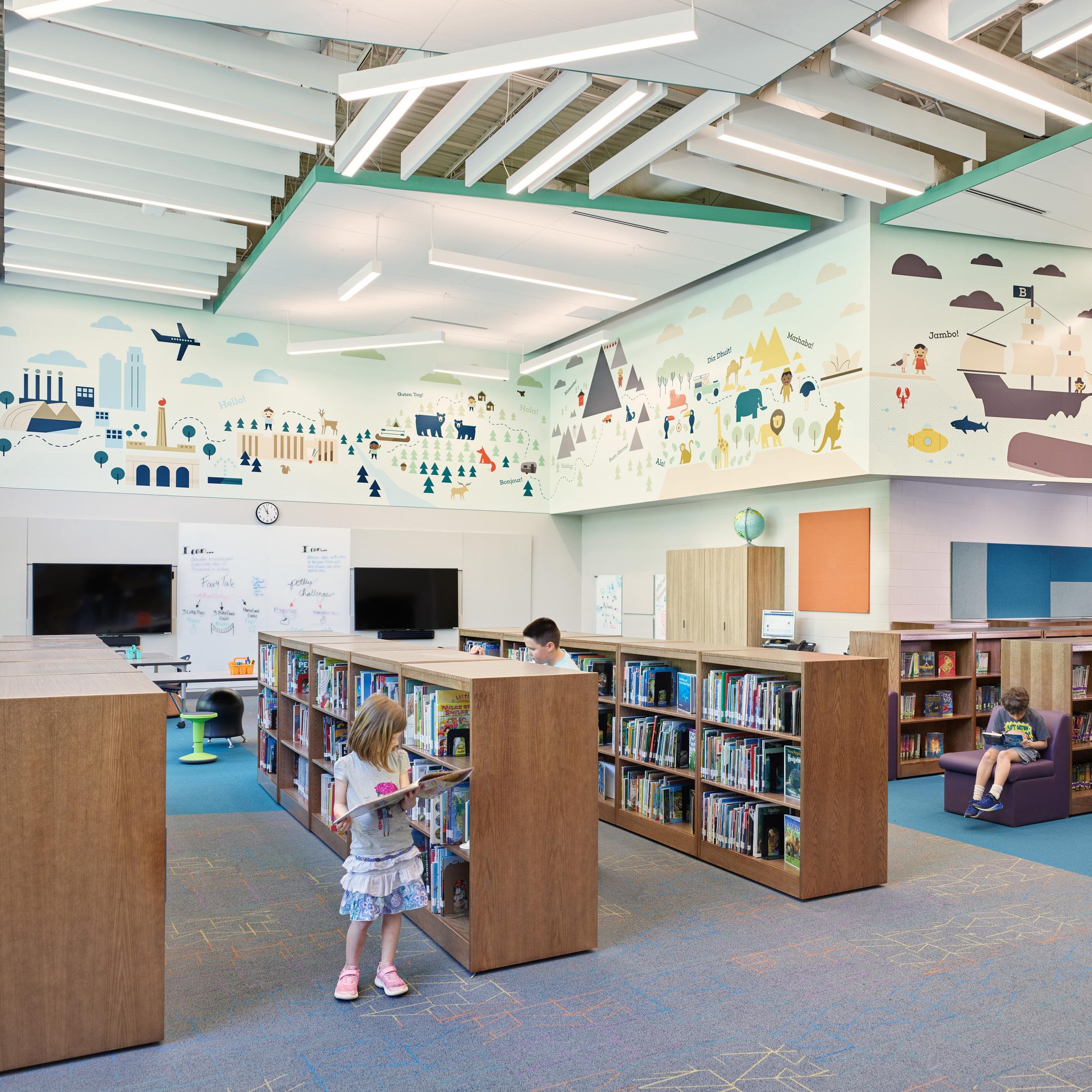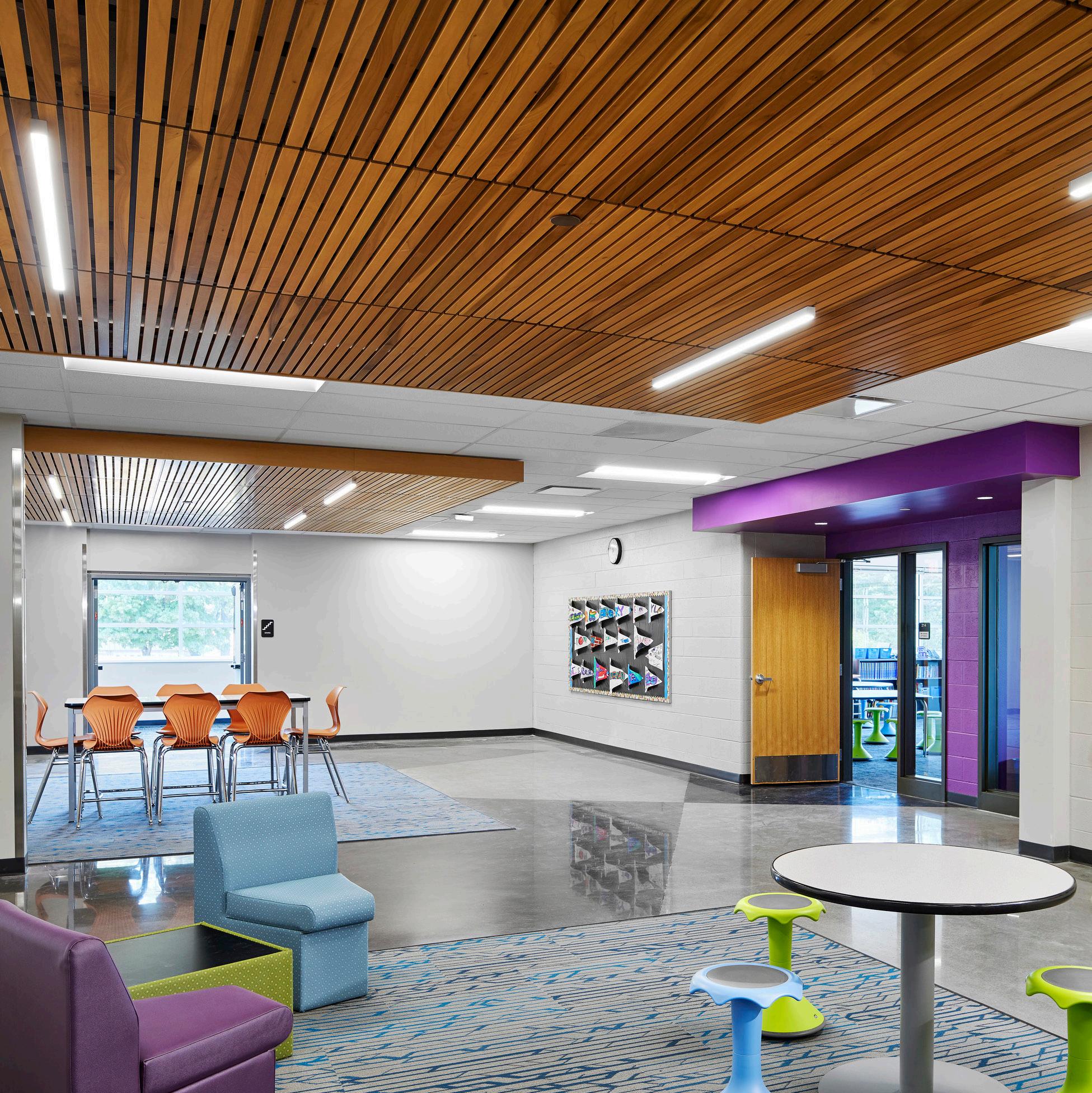 Mason Elementary School has been a cornerstone of the Lee’s Summit R-7 School District for nearly a century, evolving over time to accommodate the growing student population. The elementary school underwent a significant addition and renovation that enhanced the space while preserving its historical legacy. The unique layout of the existing building posed challenges for navigation throughout the building. To better connect students, the corridors were transformed into collaboration spaces and glass doors were added to classrooms. Wood elements and bright colors were incorporated to create a warm and welcoming environment.