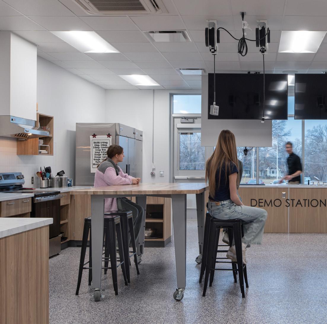 The two-story, 131,000-square-foot, mixed-use building for Shawnee Mission School District is designed to foster learning, creativity, and collaboration among teachers, staff, and students. The building features integrated technology with LCD screens and device connection capabilities throughout. It includes amenities like a TV studio, executive boardroom, technology labs, meetings rooms, and multiple administrative offices. This facility serves as the main venue for all Education Foundation fundraising activities and events. Additionally, it houses the District’s culinary arts program and bistro, which includes an on-site full-service restaurant and an indoor living wall maintained and operated by students and instructors in the culinary arts program. Furthermore, the addition of an exterior patio and walking path creates an outdoor collaborative learning space and offers a secondary cafe. The entire building emphasizes environmental sustainability, with abundant natural light, a rain garden, and an energy-efficient HVAC system.