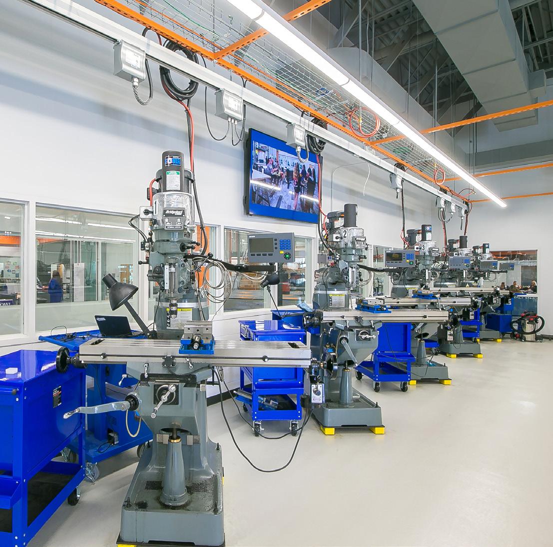 This facility is comprised of two buildings adjoined by a skybridge. With 73,000 square feet and 14 labs, the new facility means JCCC can offer more classes, more personalized training, and additional upgraded machinery to students in both credit and continuing education courses. The open, modular design allows departments to be flexible and respond quickly with course offerings in new areas to meet changing workforce needs. Working infrastructure and mechanics are visible throughout the building and provide exposure to concepts learned in the classroom.