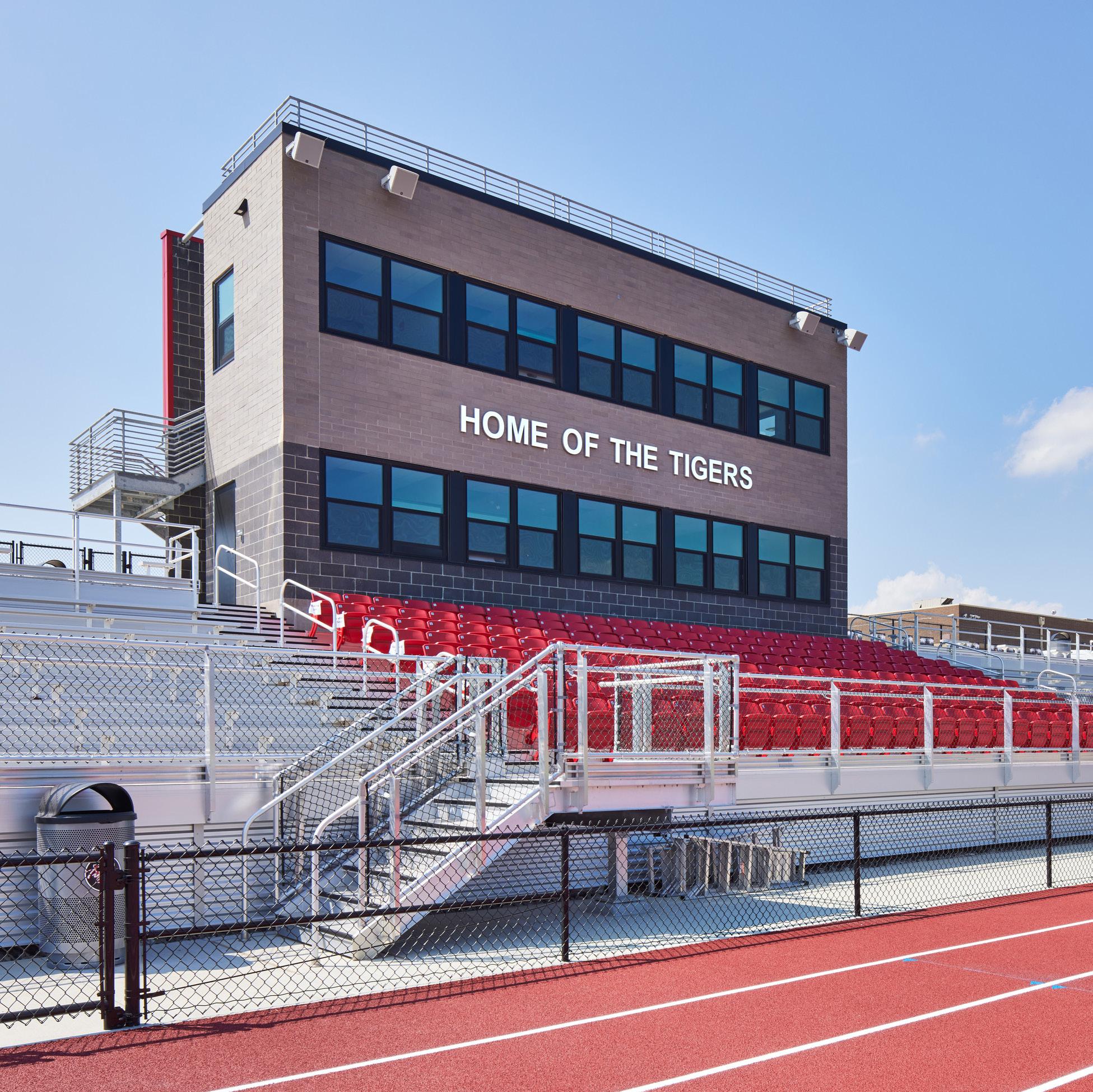 Blue Valley West High School’s previous football field and track has been transformed into a full Athletic District, now serving as home to two of the District’s high schools. Serving an expansive community, the new complex hosts varsity football games, track events, and large district gatherings. It features aluminum bleacher seating for 4,000 people around a new artificial football field. The home team side includes a new press box and a full concourse with nearly 5,000 square feet of athletic storage beneath the bleachers. The visitor side offers a separate restroom and concession building. A grand entrance with three ticket booths is located at the north end of the field, while the south end boasts a 7,000-squarefoot, locker room facility that accommodates the training room, referee room, and both home and visitor locker rooms.