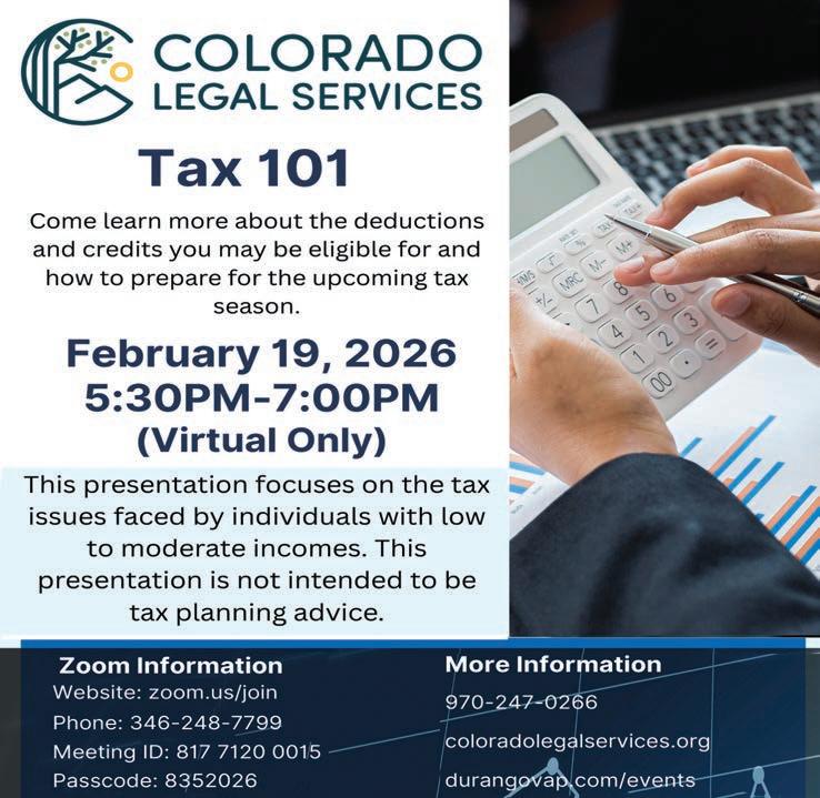 for individuals and families with income less than $68,000. The service is free, held at the La Plata County Fairgrounds Extension Building on Mondays and Saturdays, Feb. 2 - April 13. Volunteer tax preparers are certified by the IRS. Appointments are required. For more information and to schedule an appointment, go to www.durangovita.org.