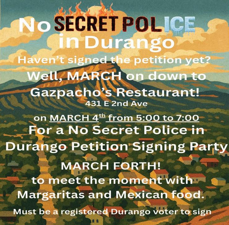 No Secret Police in Durango March Forth! Petition Signing Party, 5-7 p.m., Gazpacho Restaurant, 431 E. 2nd Ave.